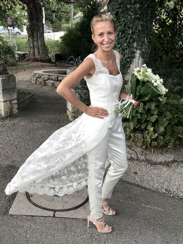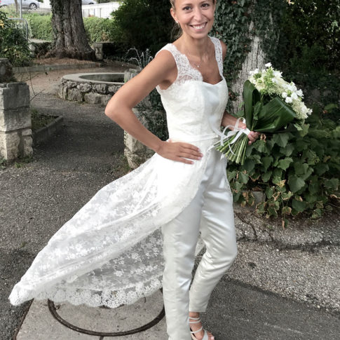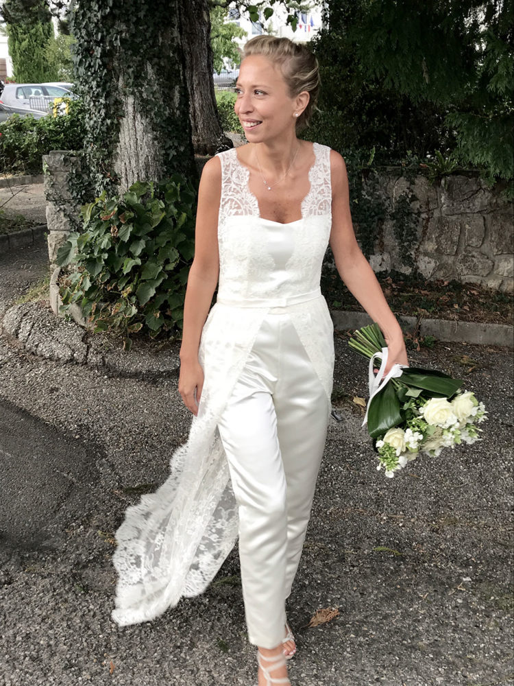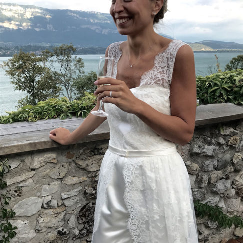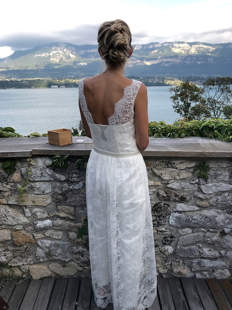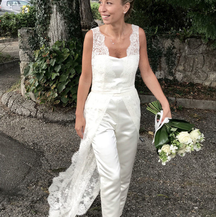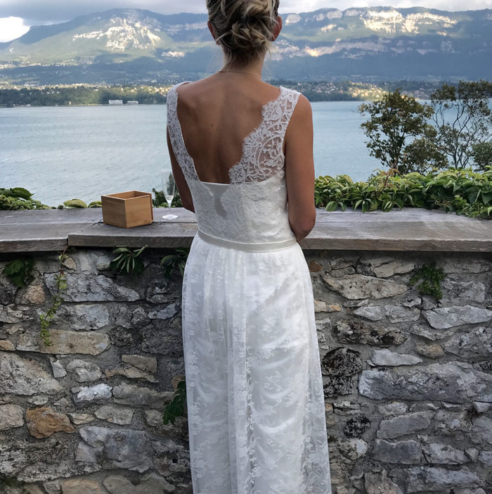 Combinaison bustier en satin de soie, top et sur-jupe en dentelle de Calais