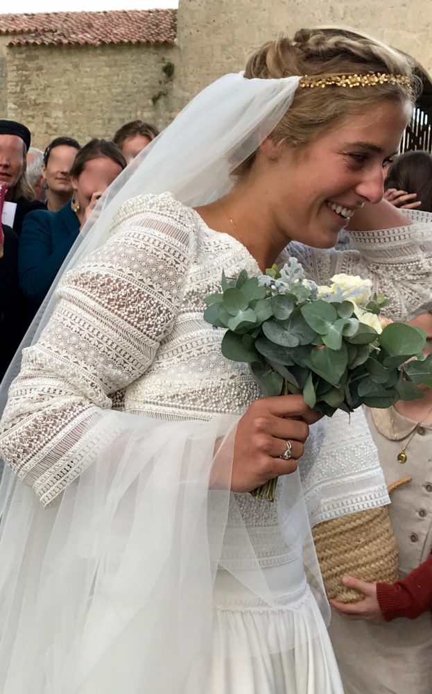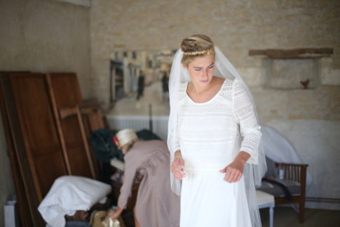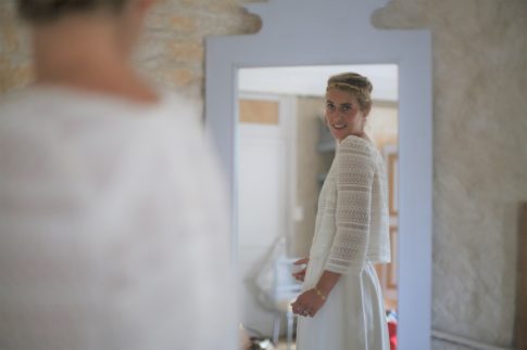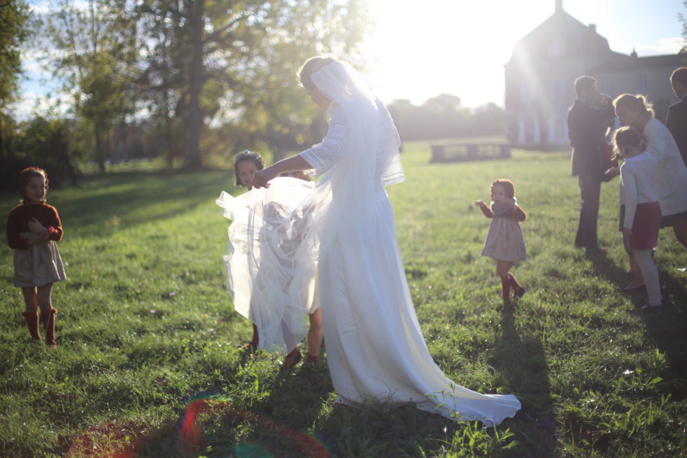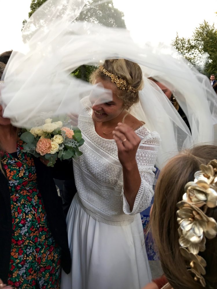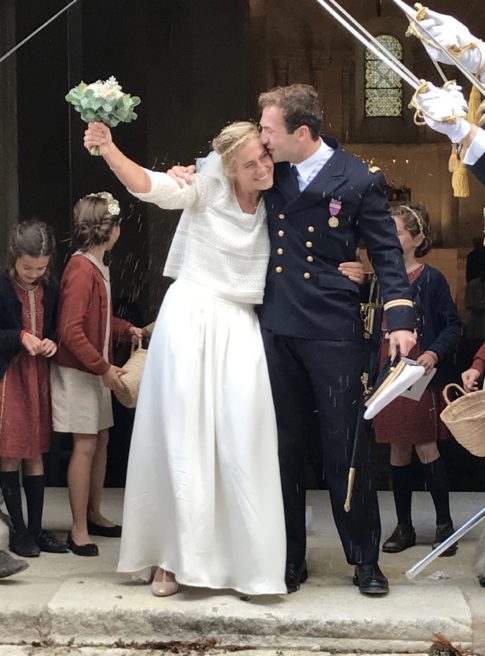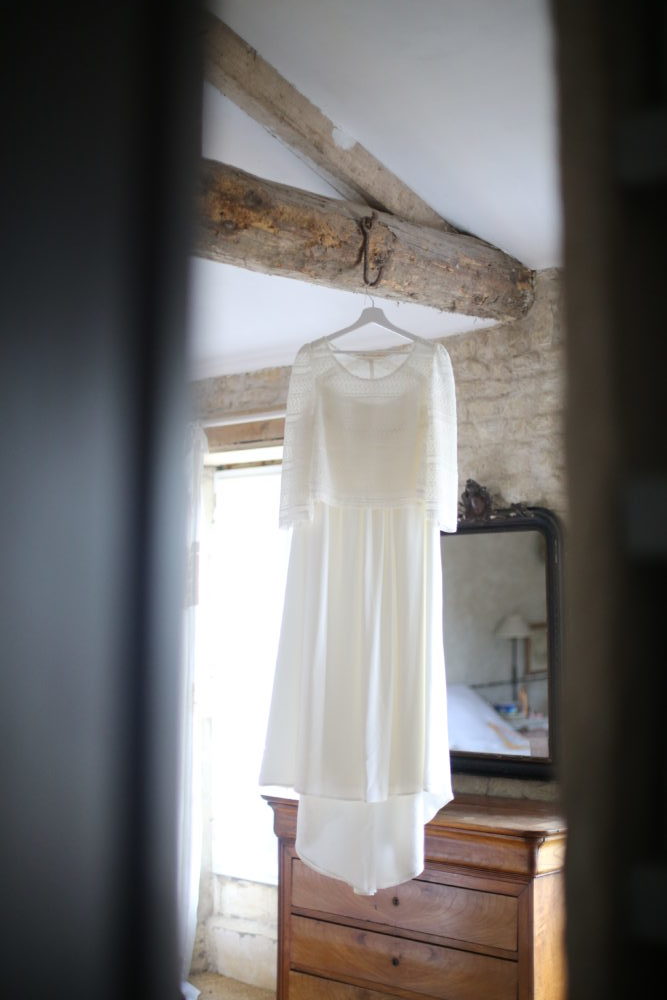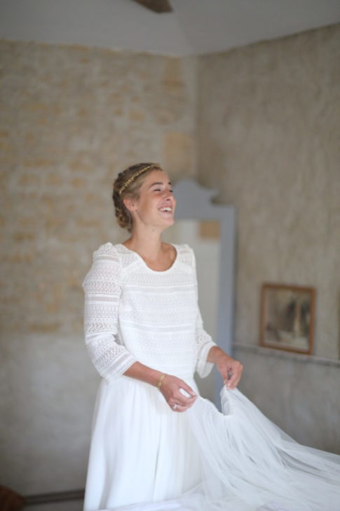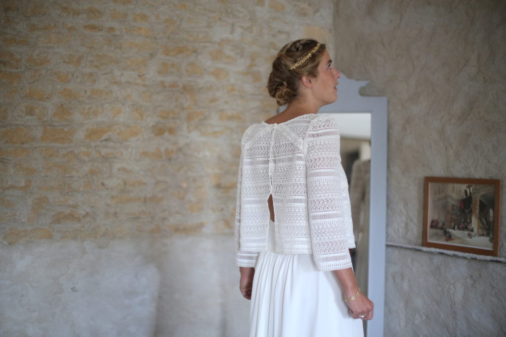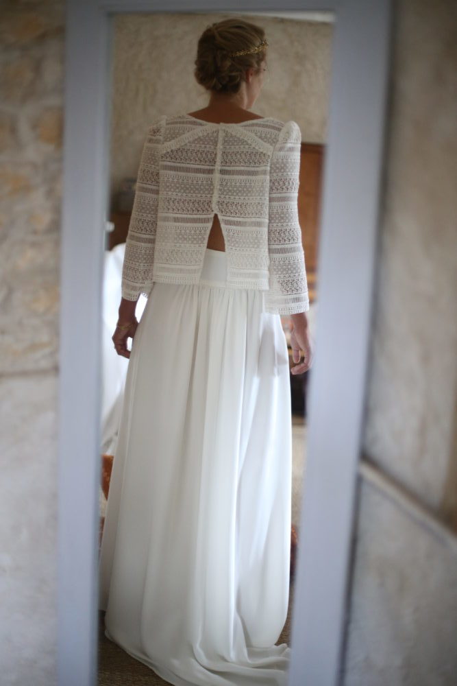 Jupe en crêpe de soie, doublée de coton. Top en guipure, boutons perles dans le dos