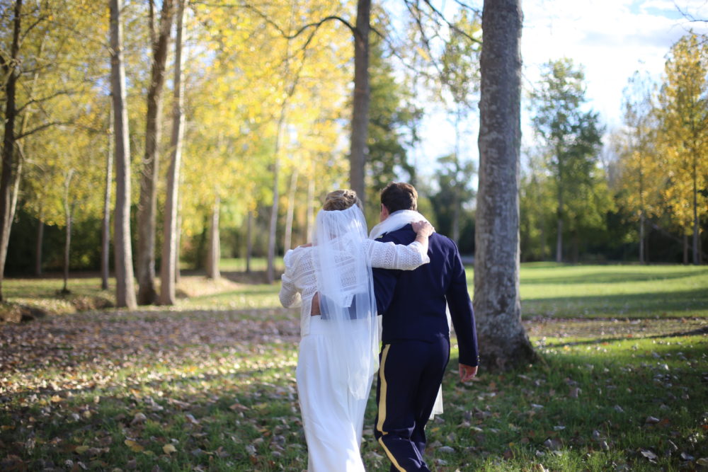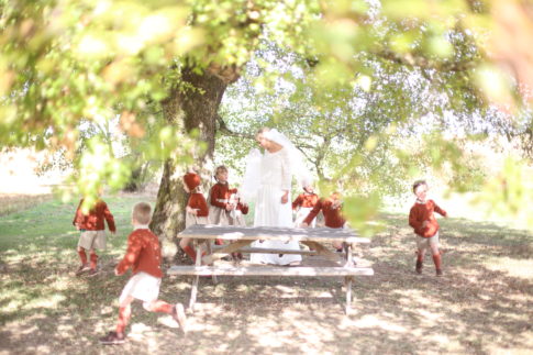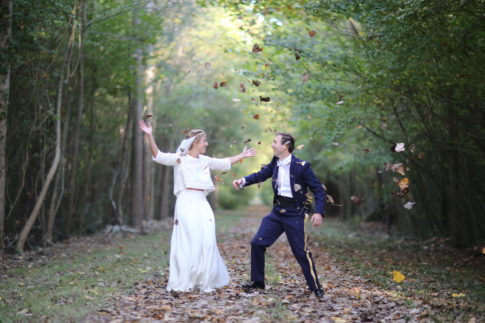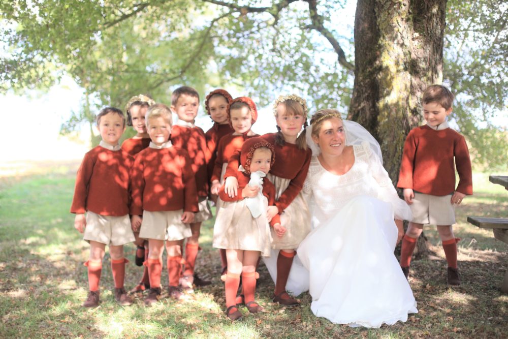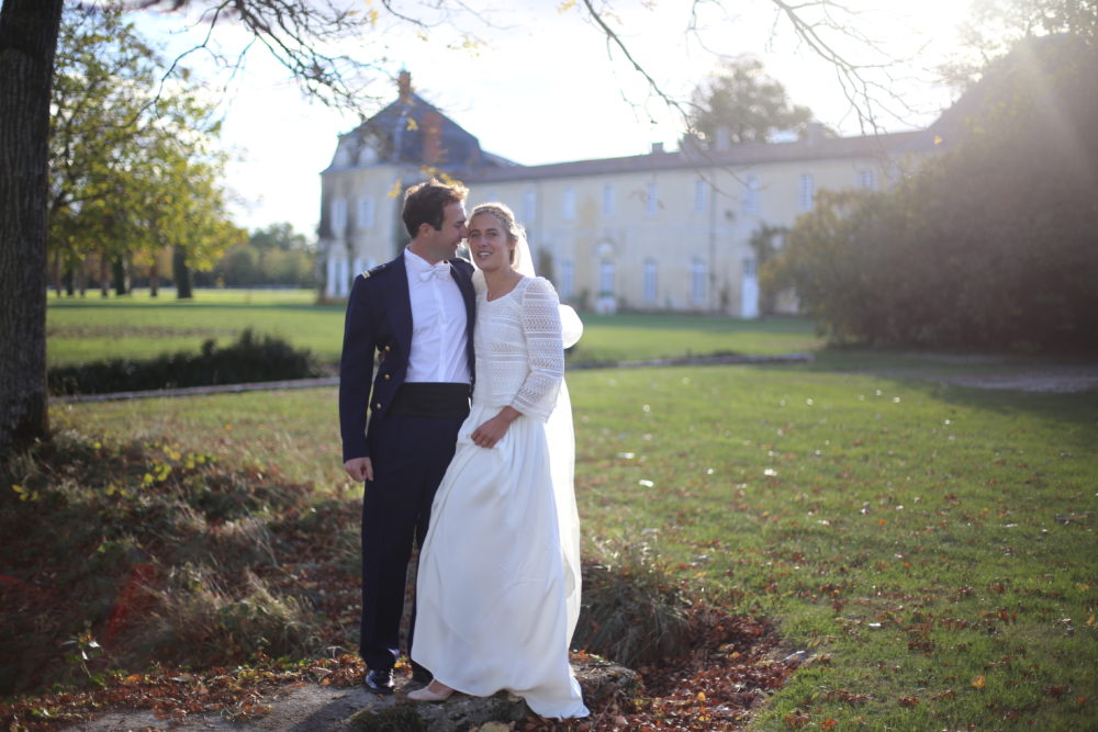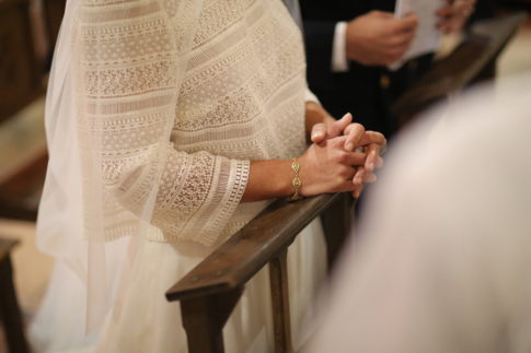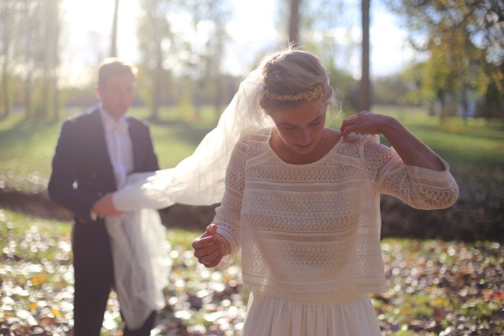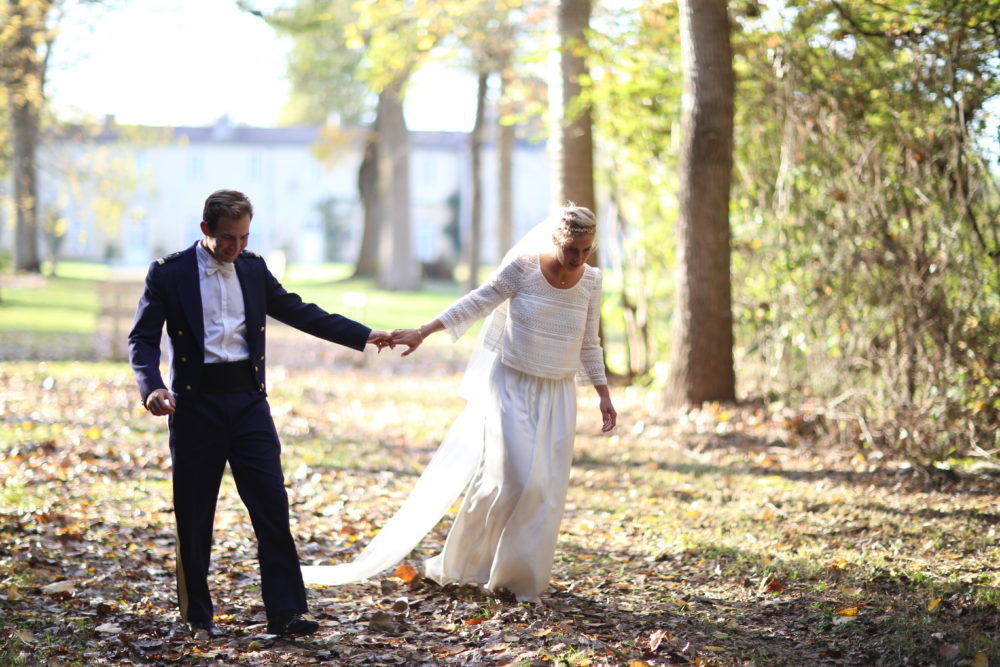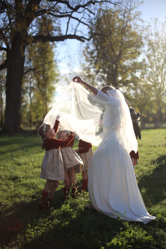 Jupe en crêpe de soie, doublée de coton. Top en guipure, boutons perles dans le dos