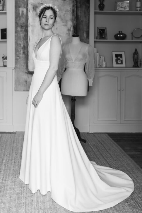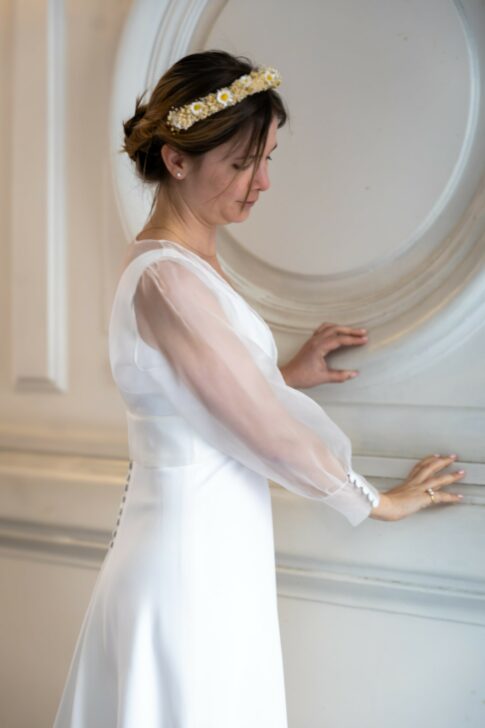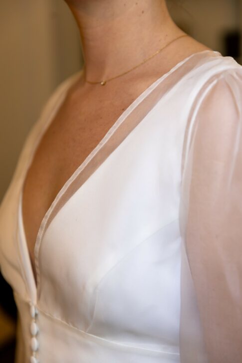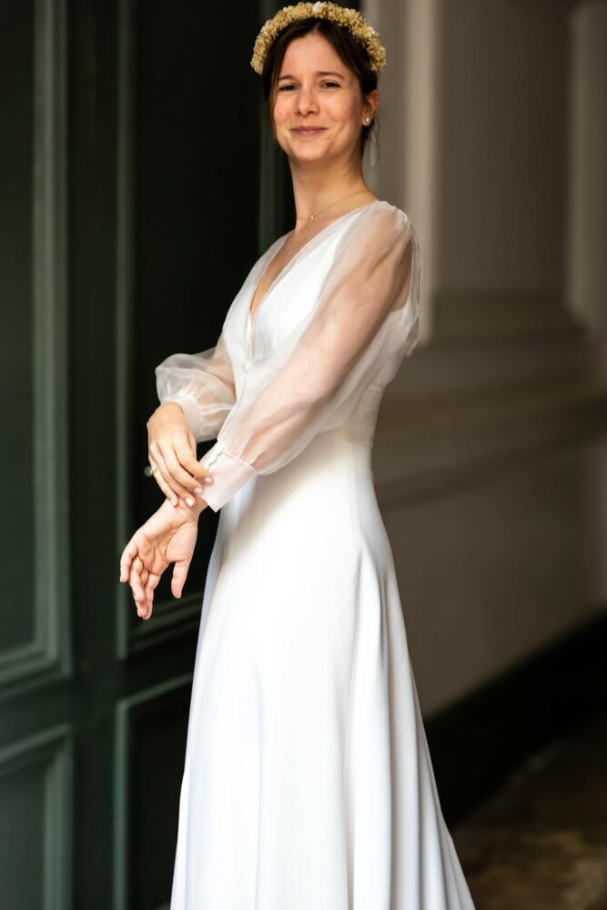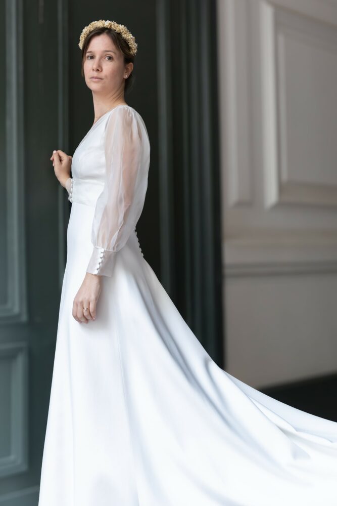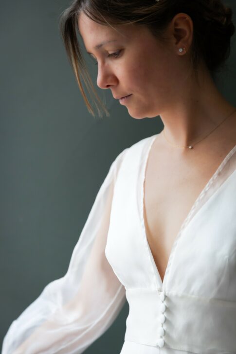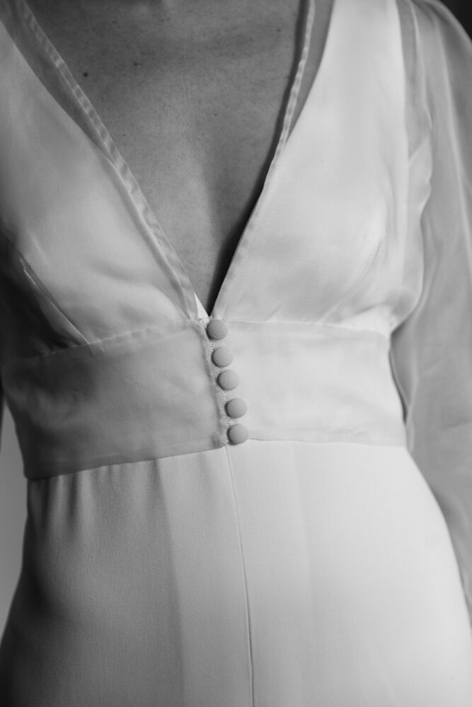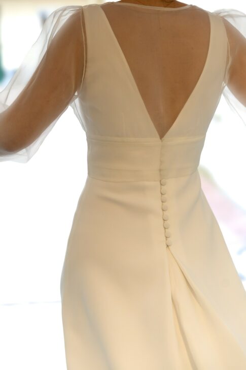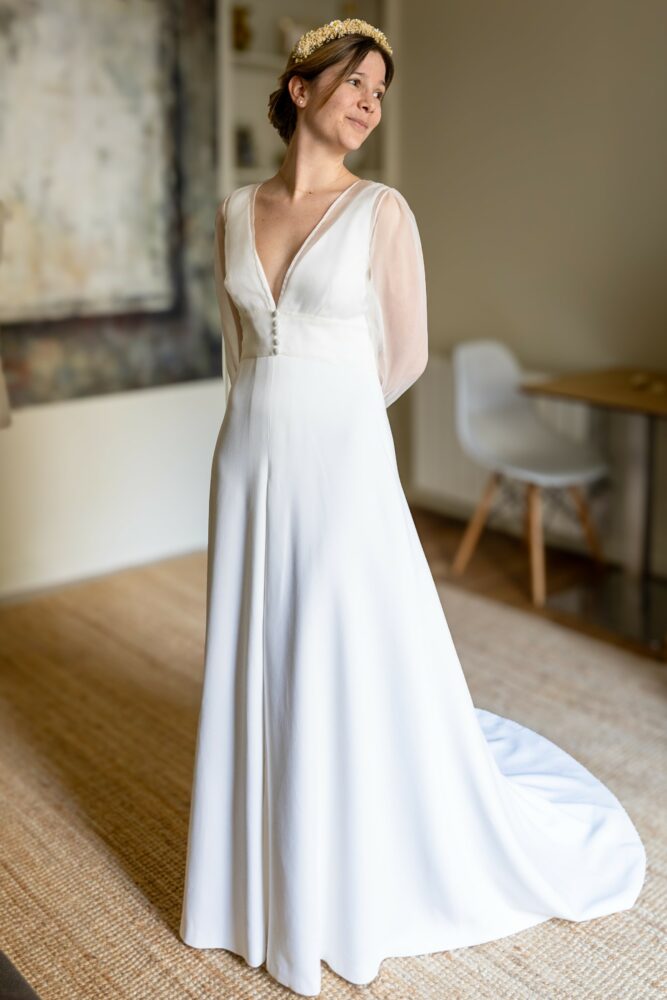 Robe en crêpe lourd de viscose, avec un top en organza par dessus.