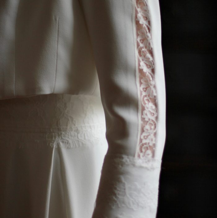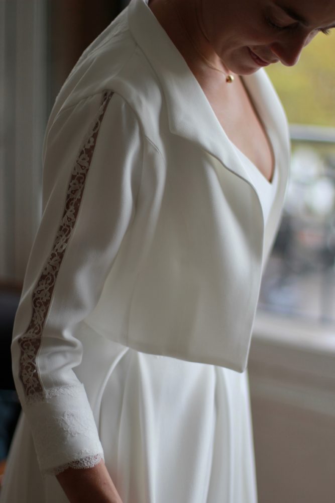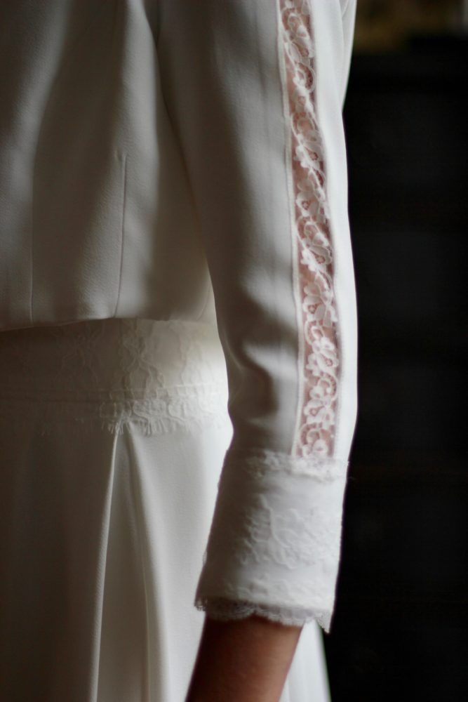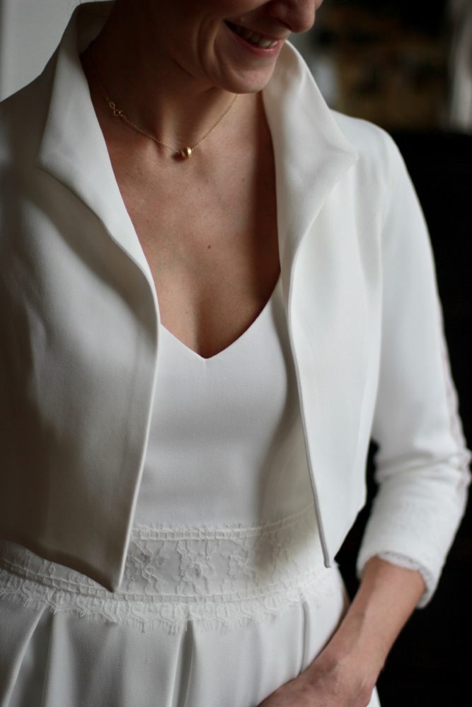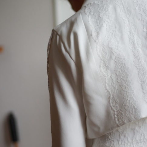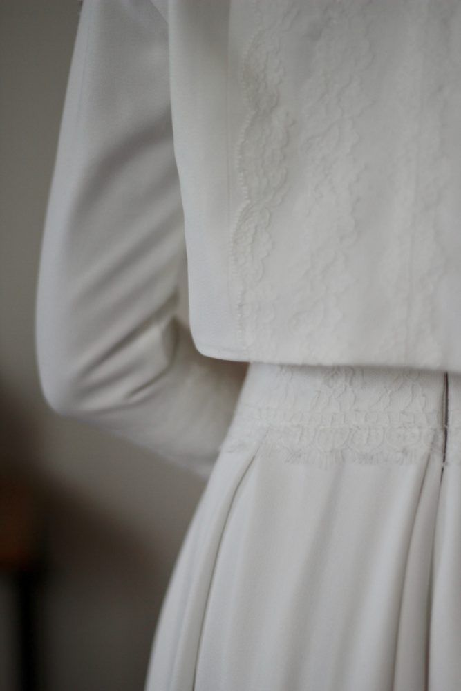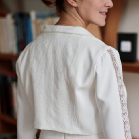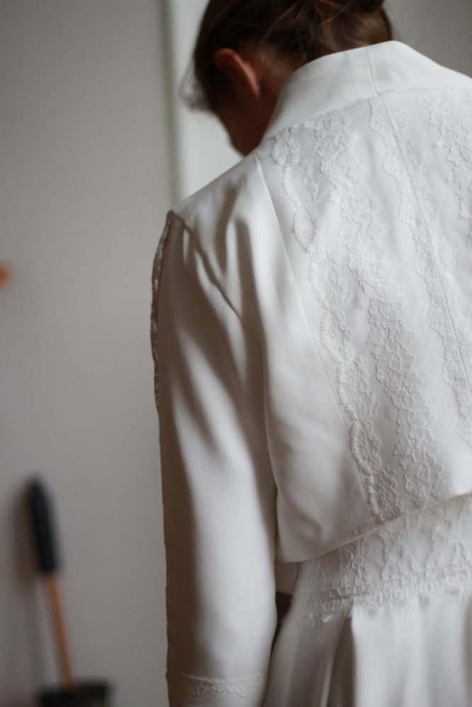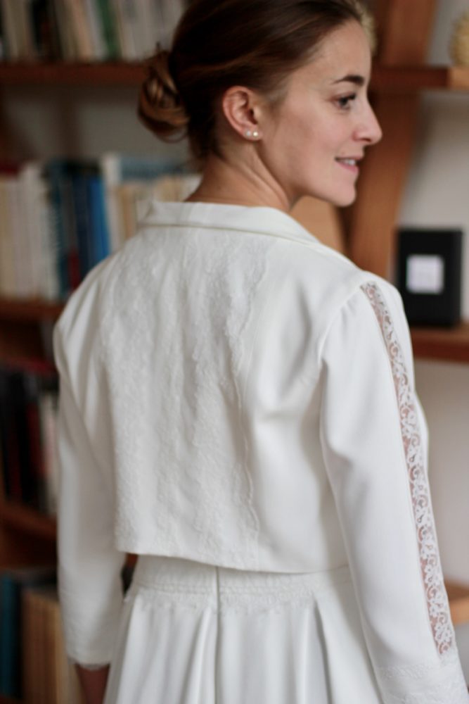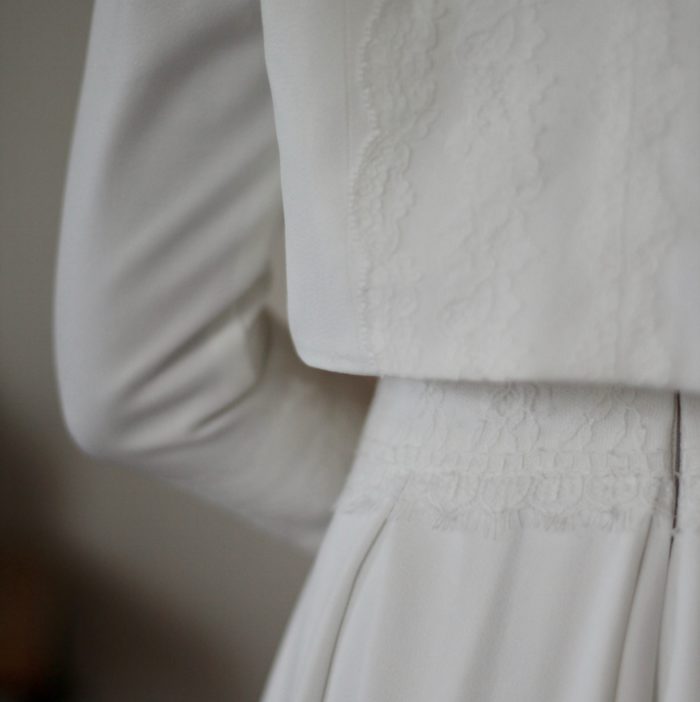 Galon de dentelle de Calais sur la taille de la robe, le dos et les manches de la veste.