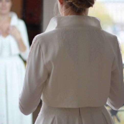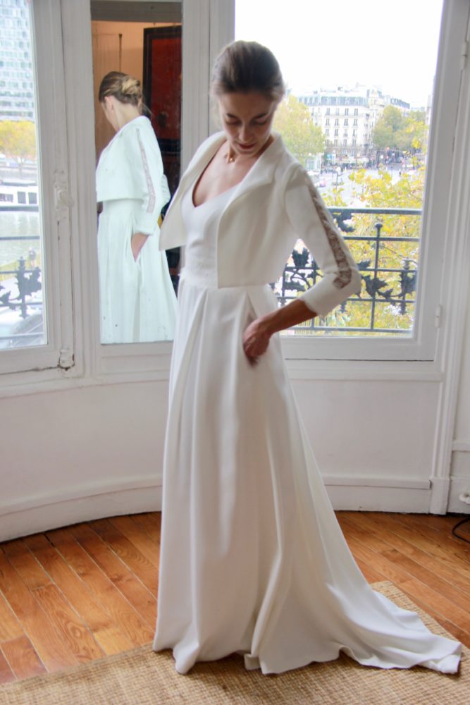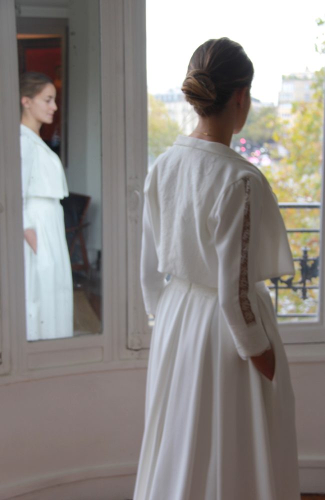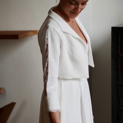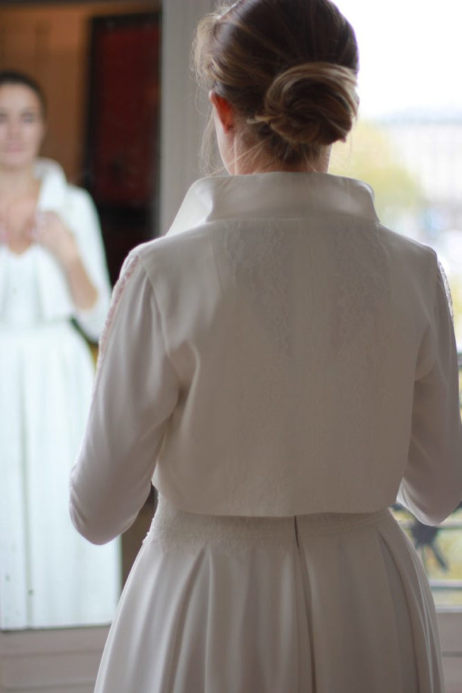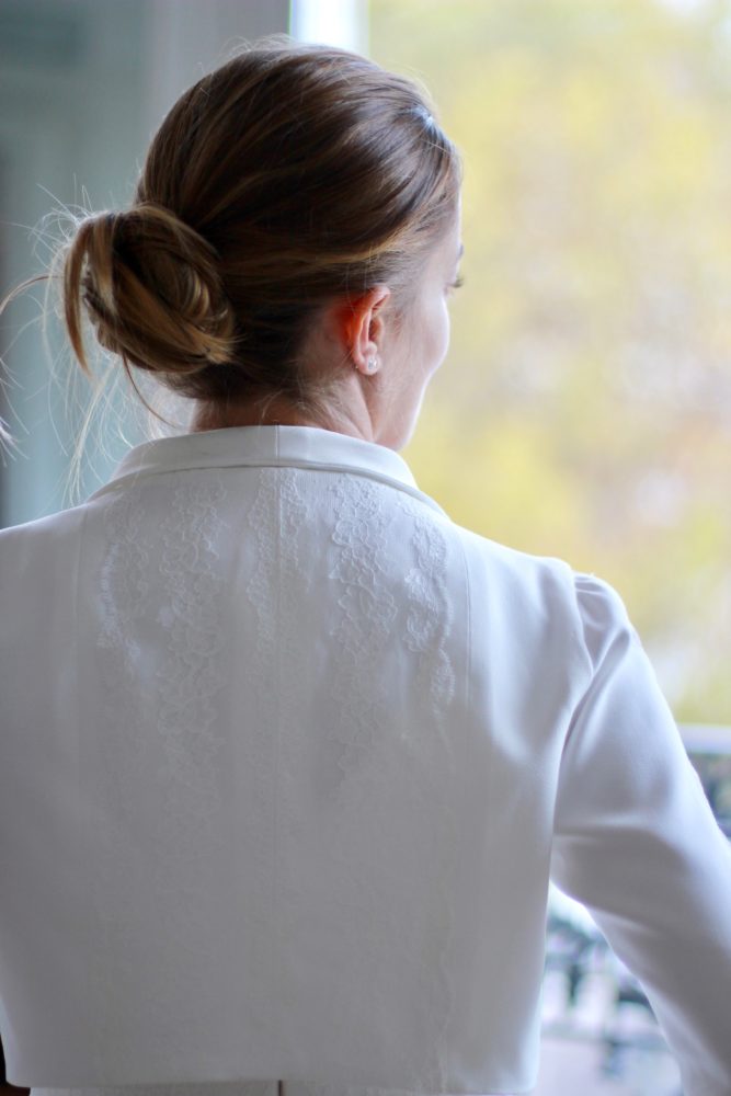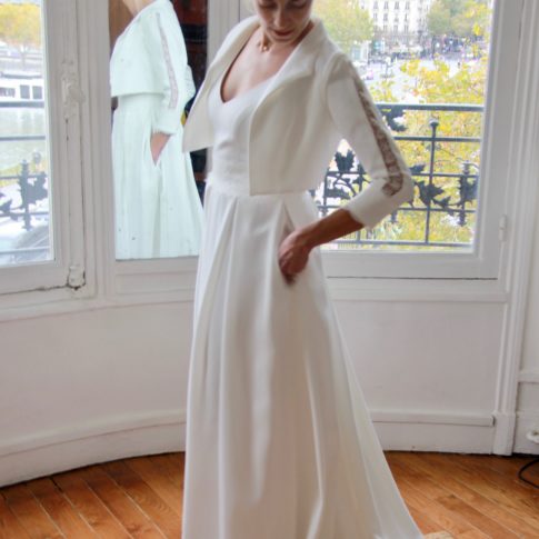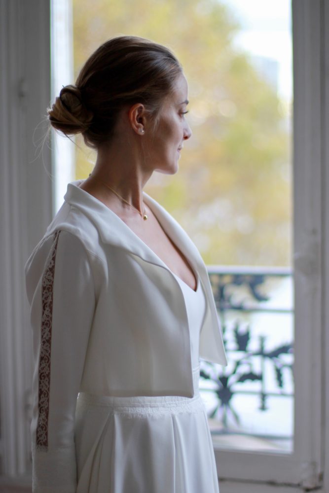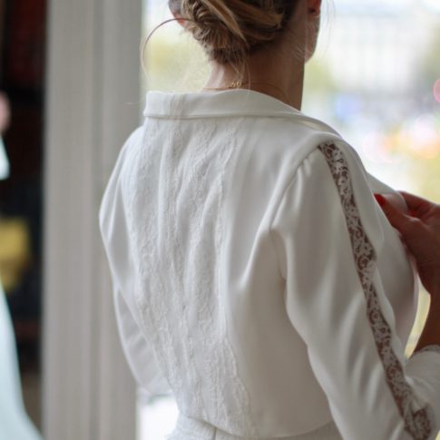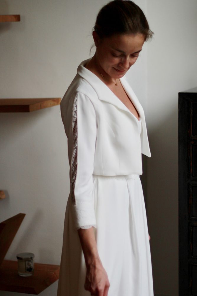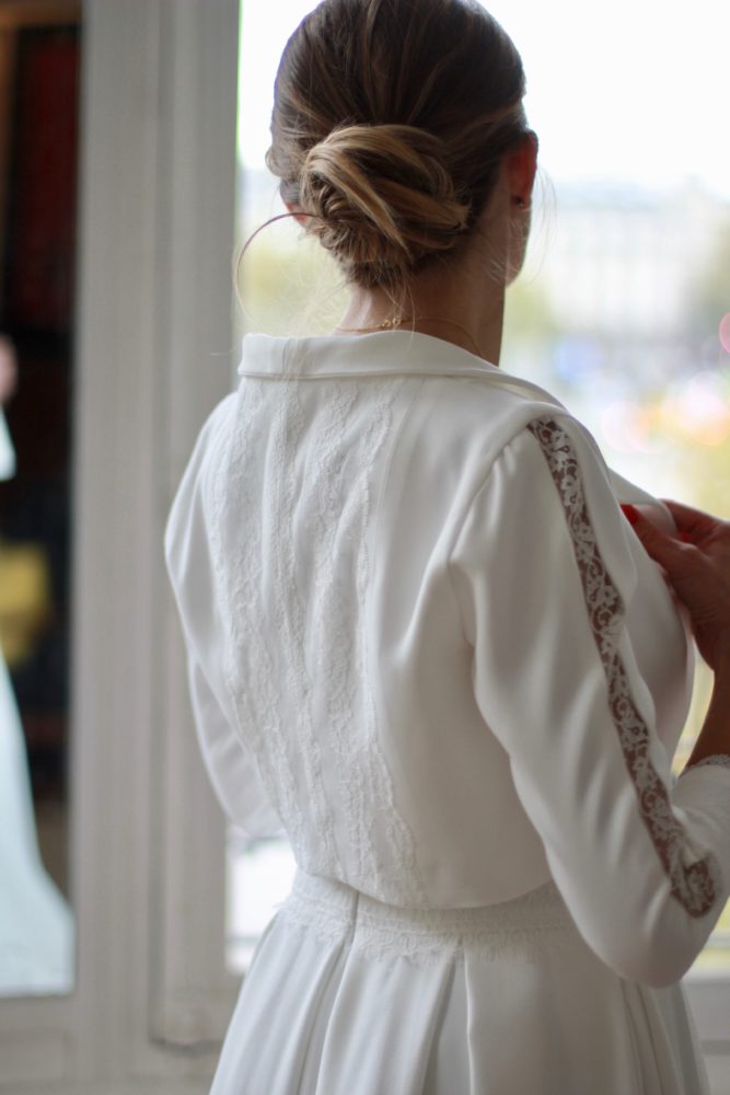 Galon de dentelle de Calais sur la taille de la robe, le dos et les manches de la veste.