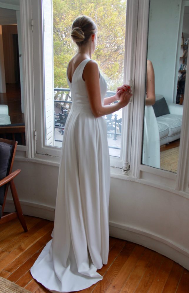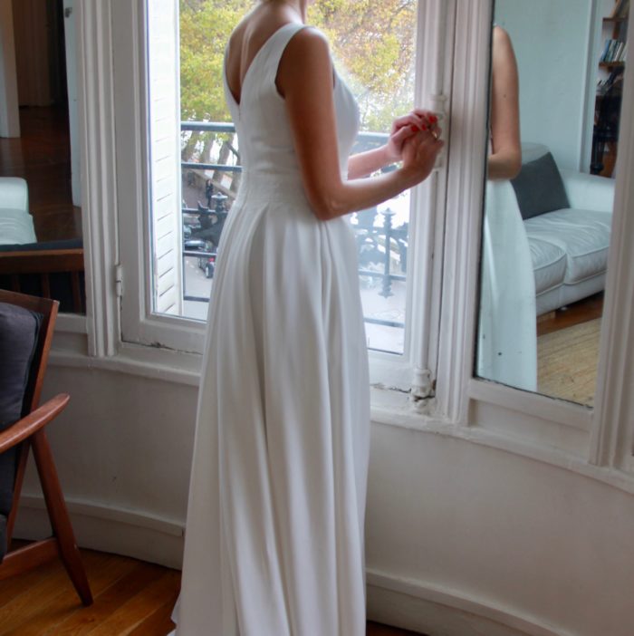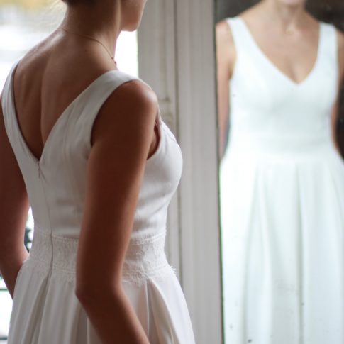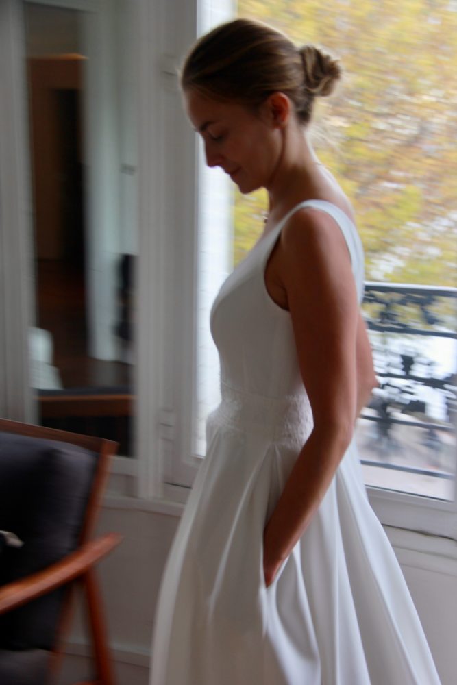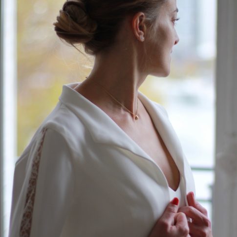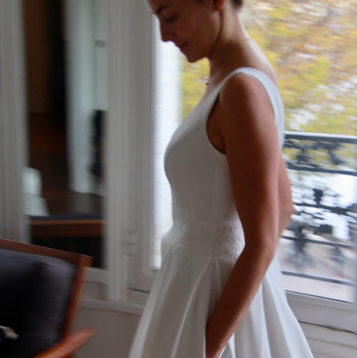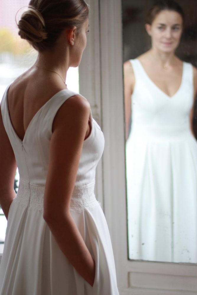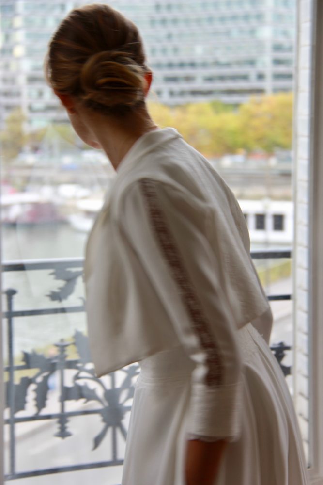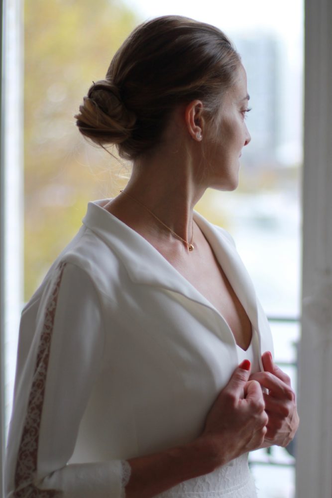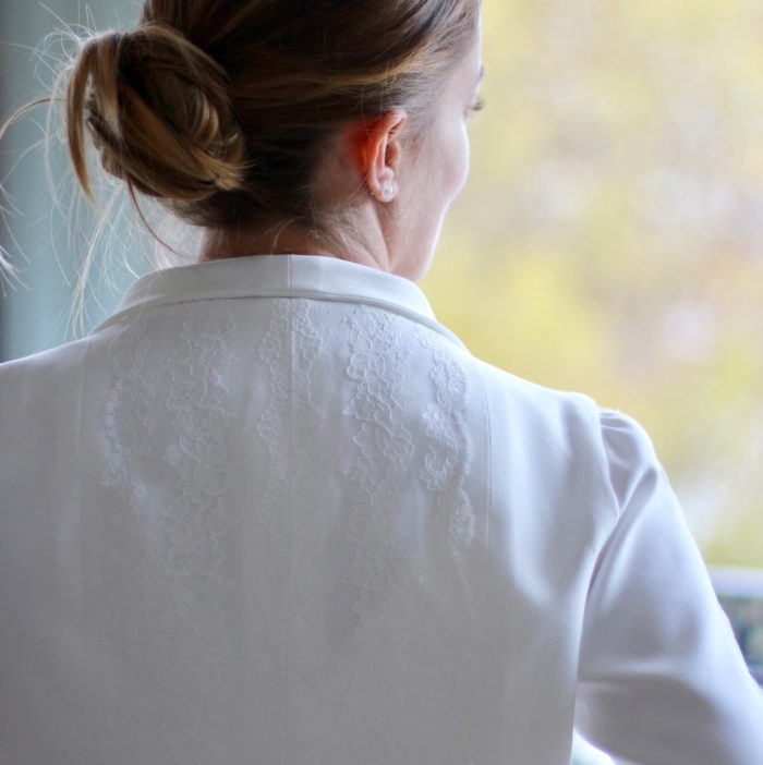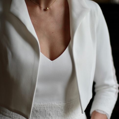 Galon de dentelle de Calais sur la taille de la robe, le dos et les manches de la veste.