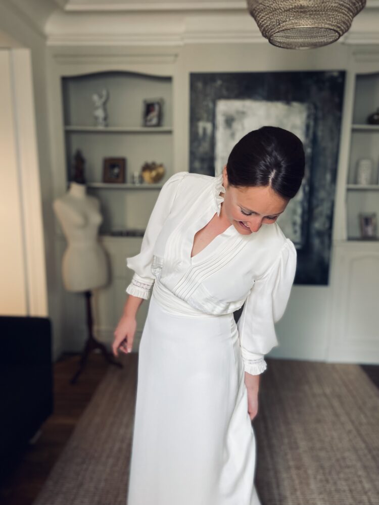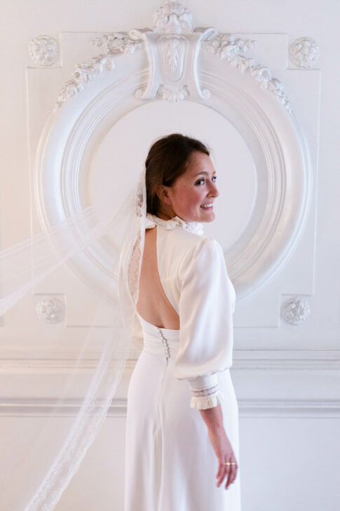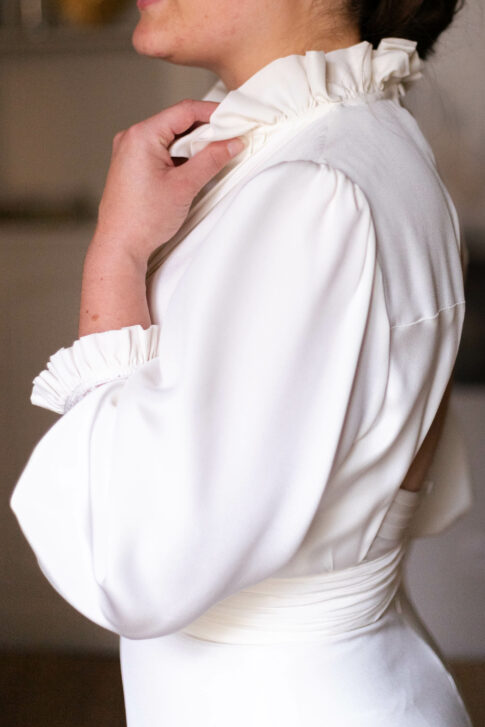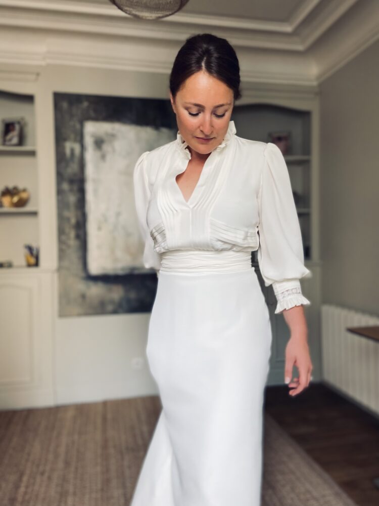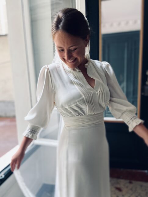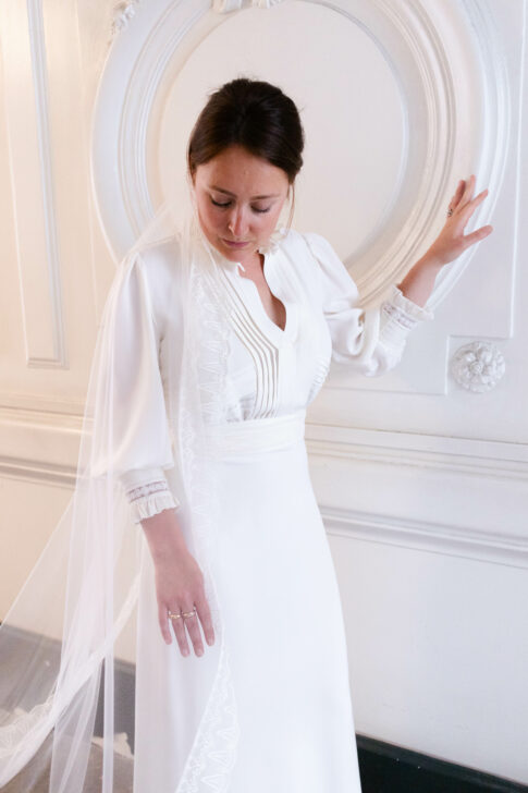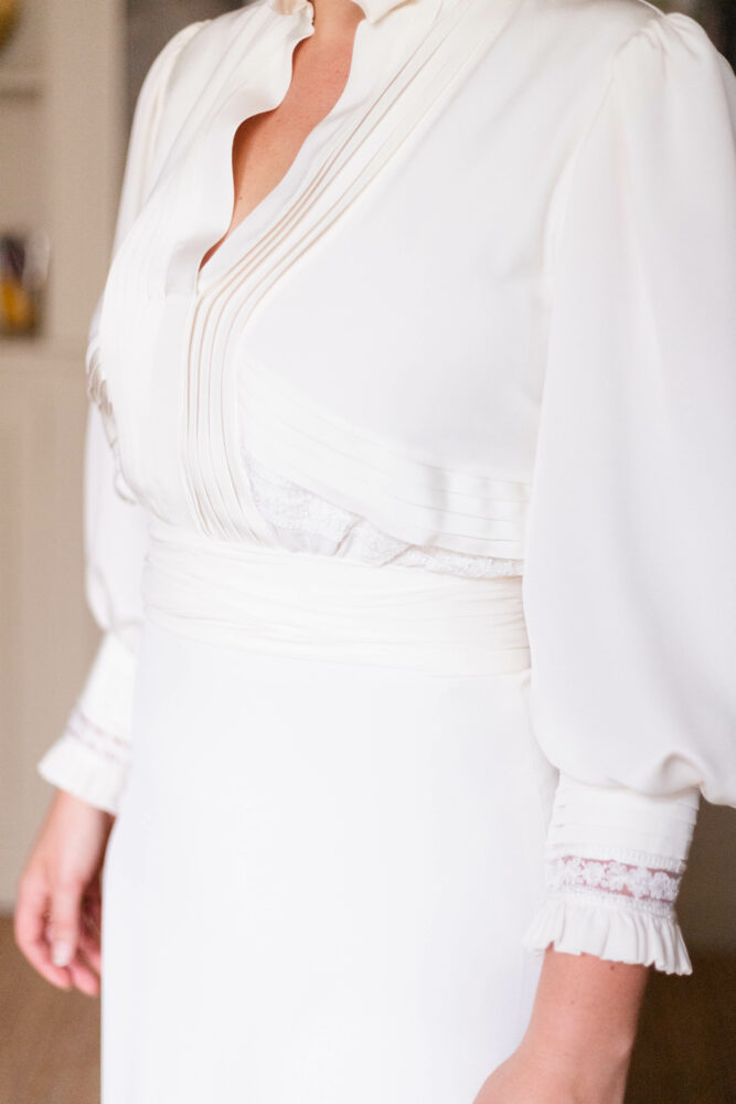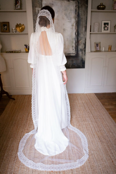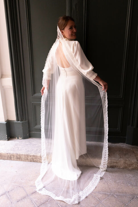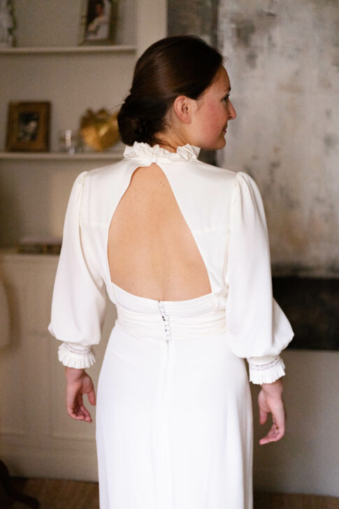 Dans le dos, des pans en crêpe Georgette de soie amovibles on été rajoutés.