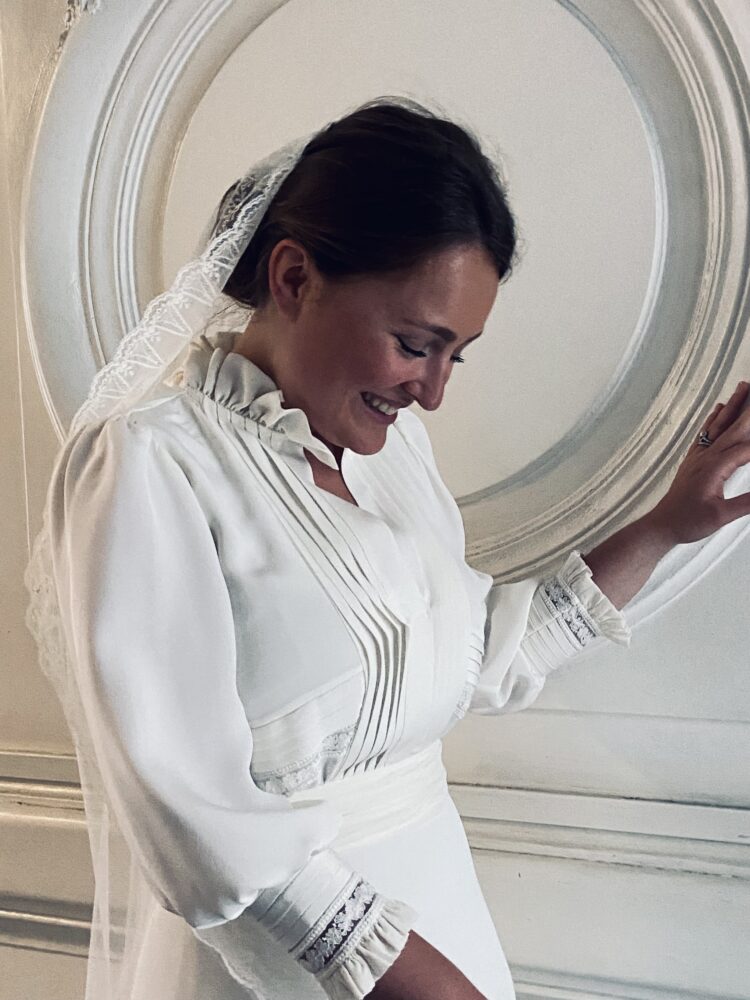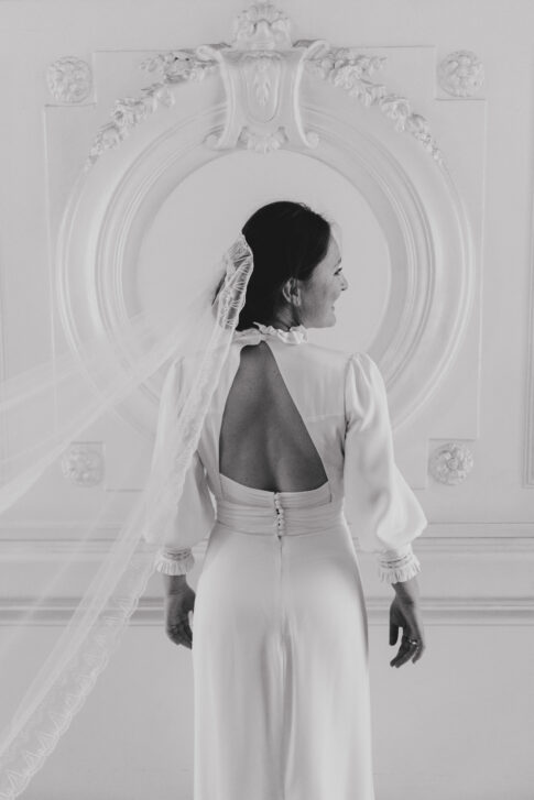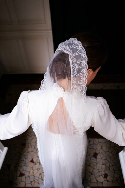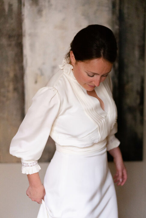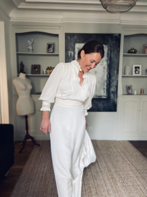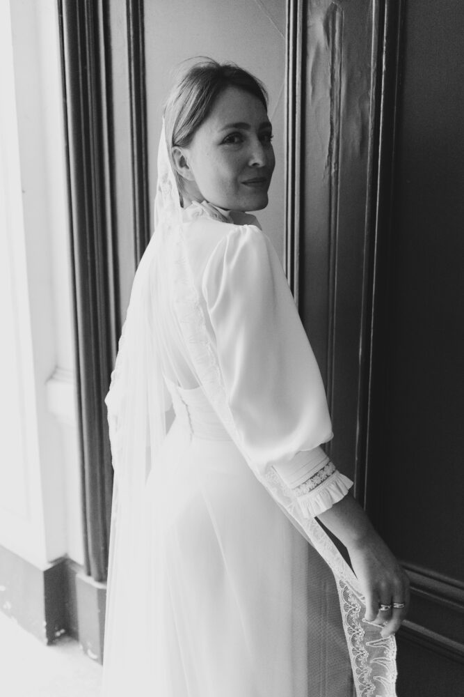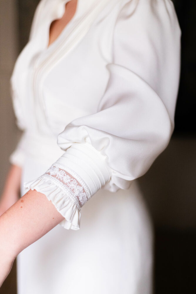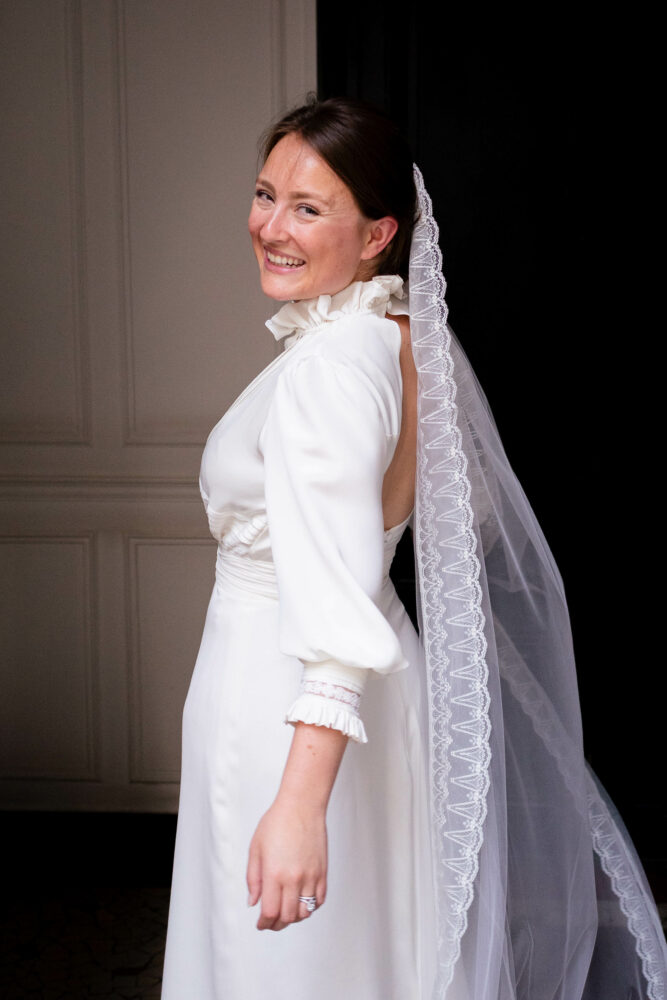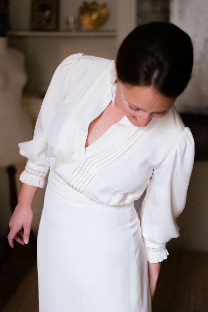 Dans le dos, des pans en crêpe Georgette de soie amovibles on été rajoutés.