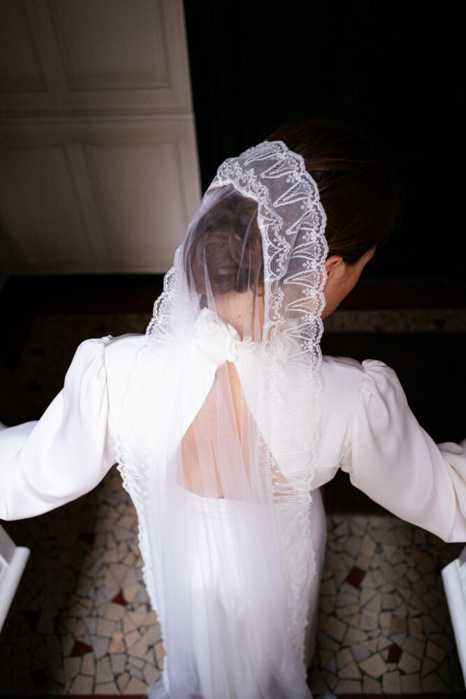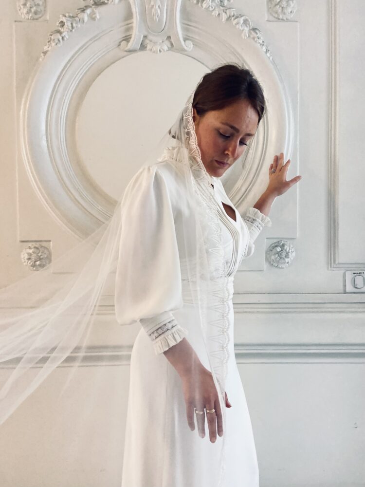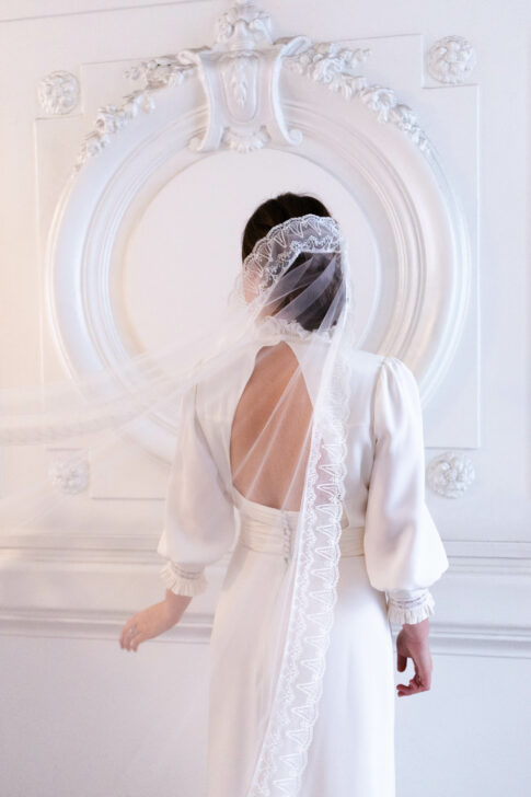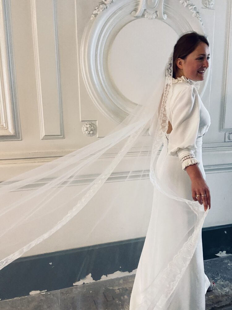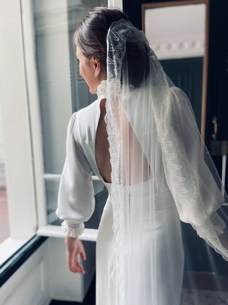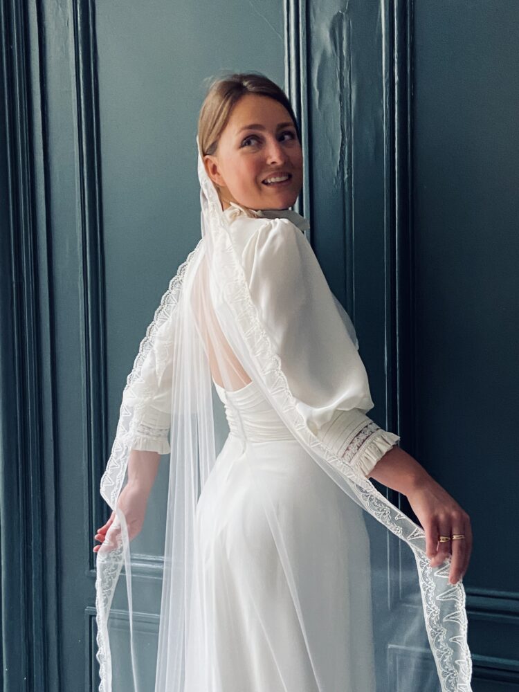 Voile en plumetis, fait sur-mesure, avec une dentelle en tulle brodée.