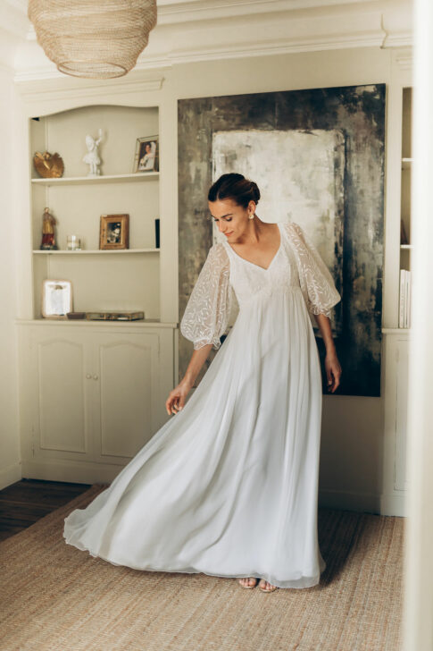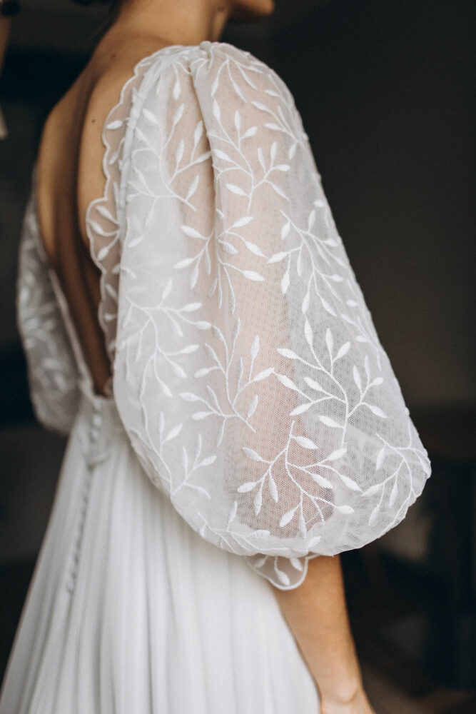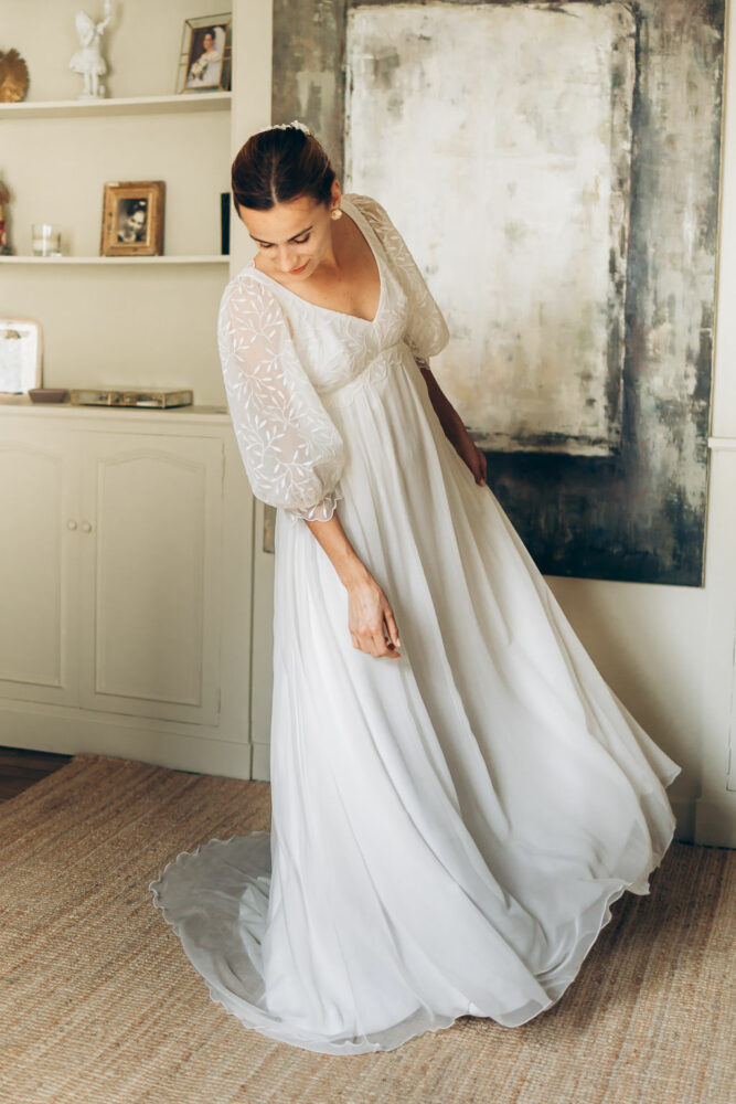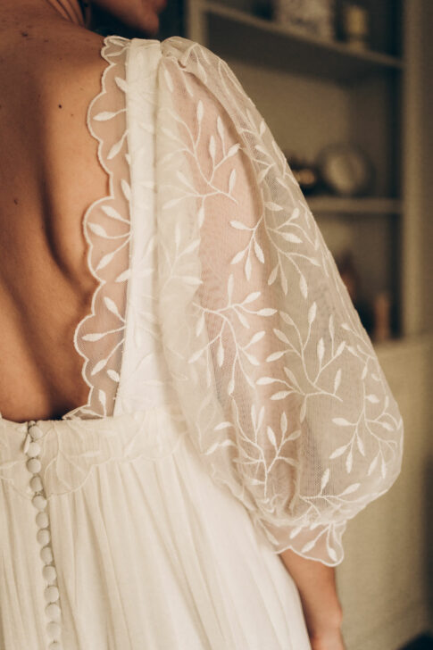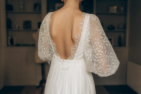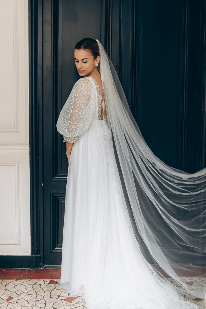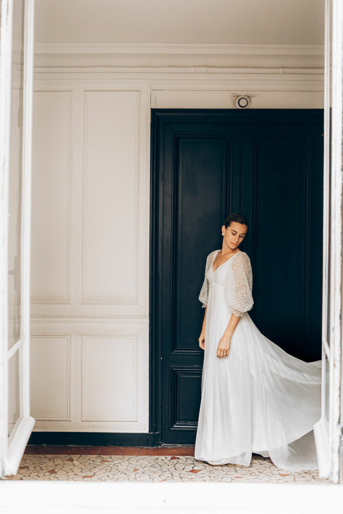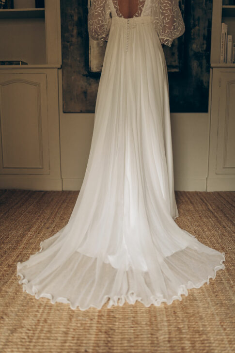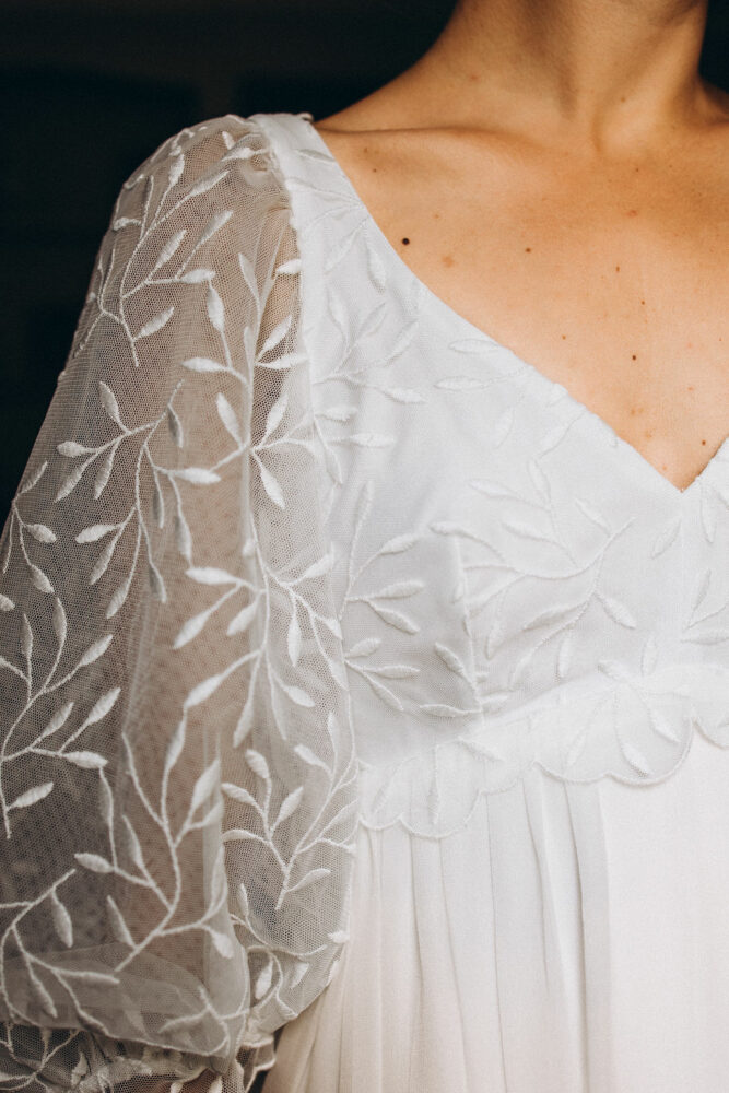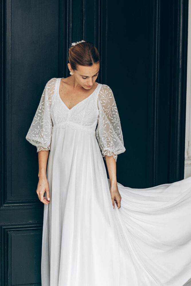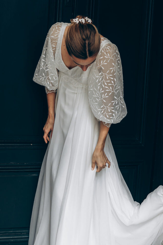 Robe en crêpe fluide avec une sur-jupe amovible en crêpe Georgette de soie, et des manches en tulle brodé, amovibles.