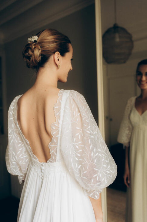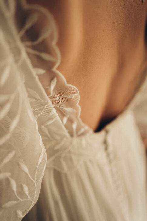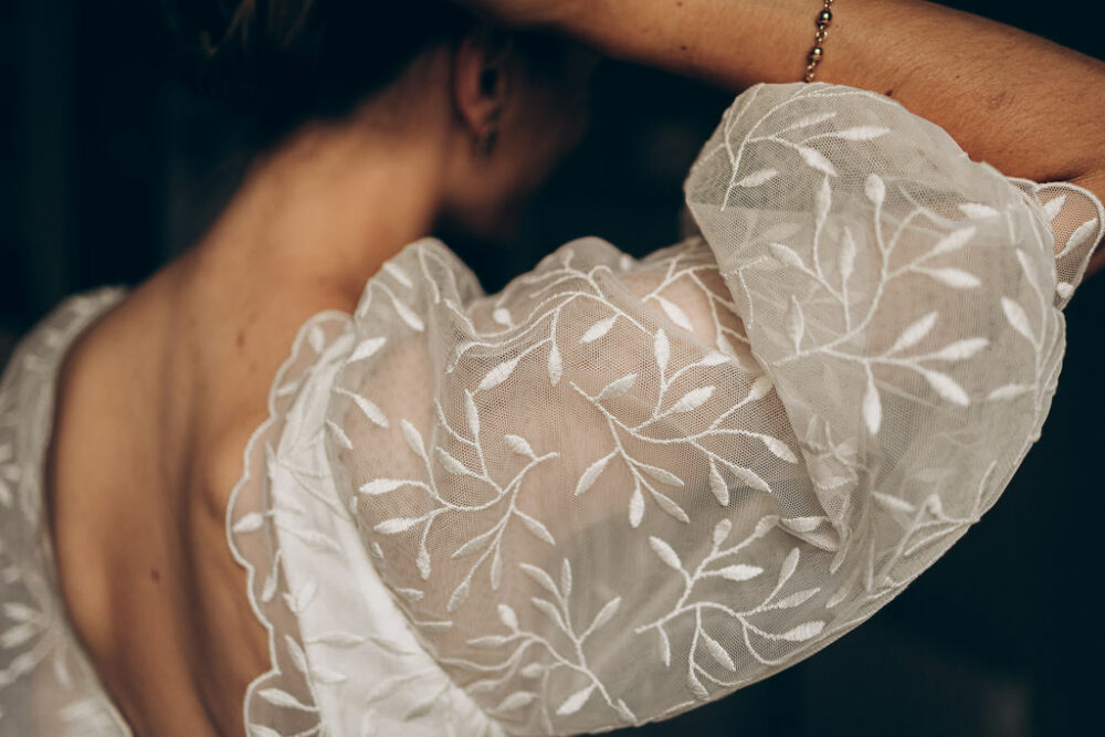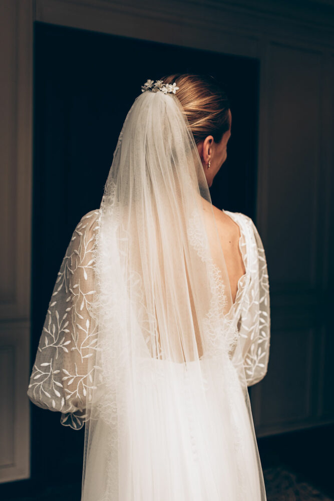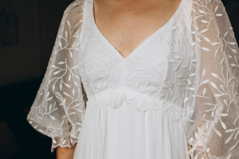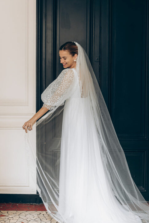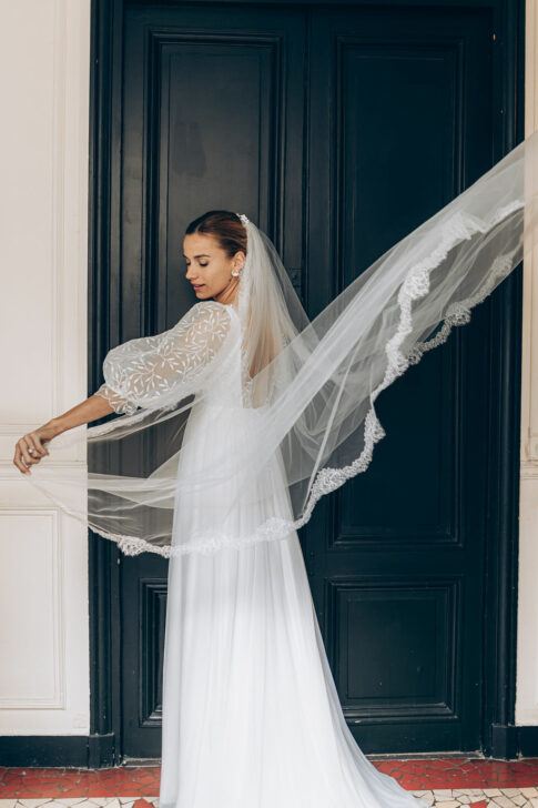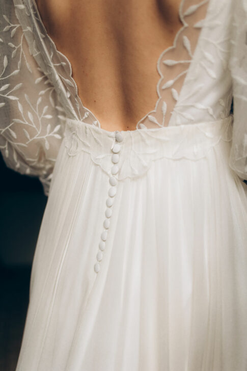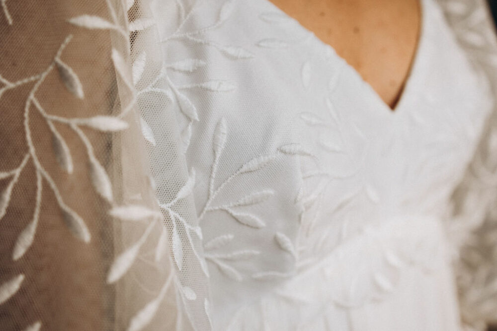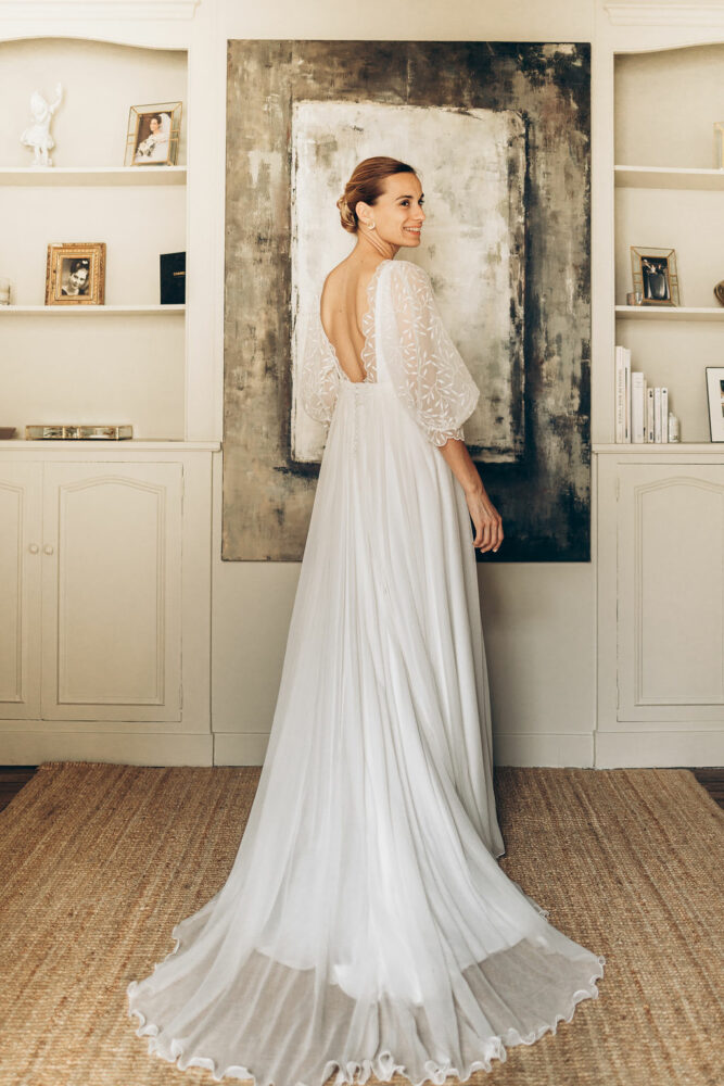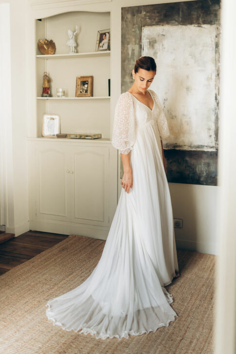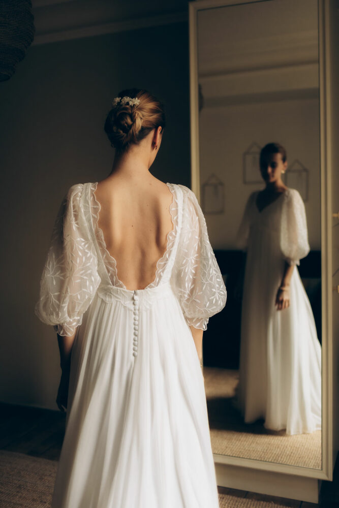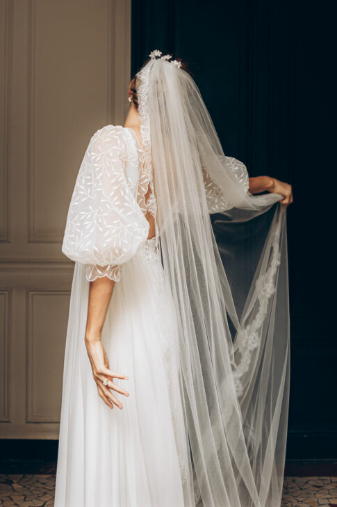 Robe en crêpe fluide avec une sur-jupe amovible en crêpe Georgette de soie, et des manches en tulle brodé, amovibles.