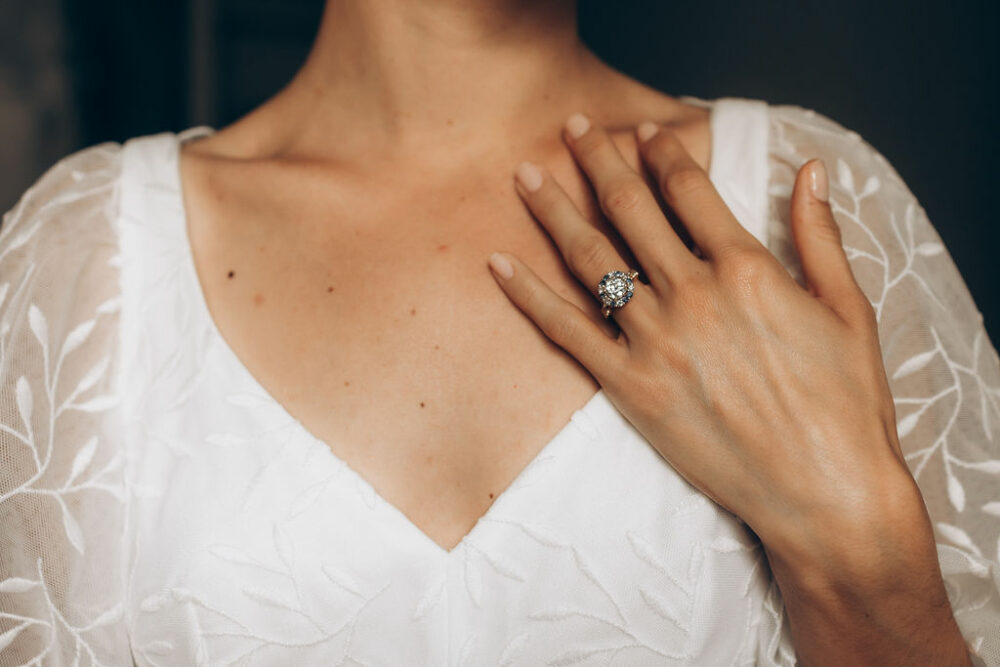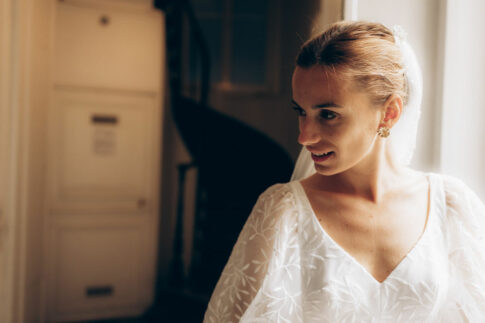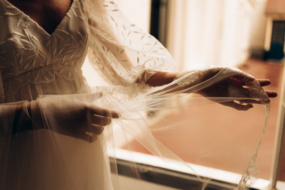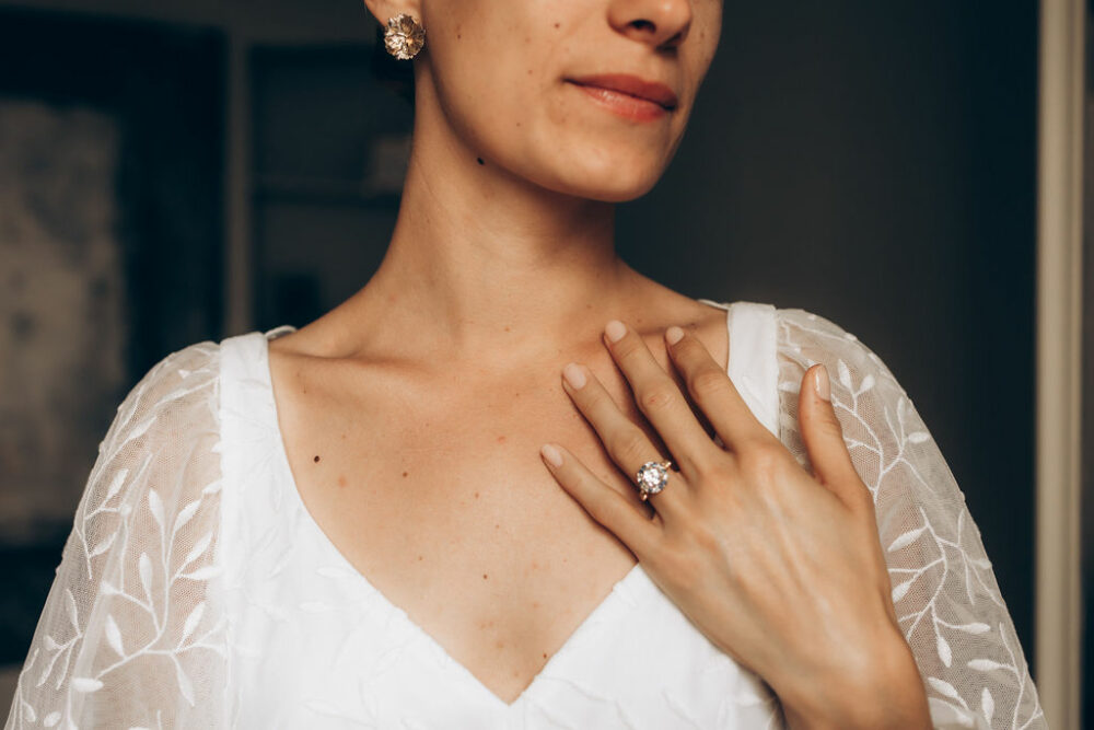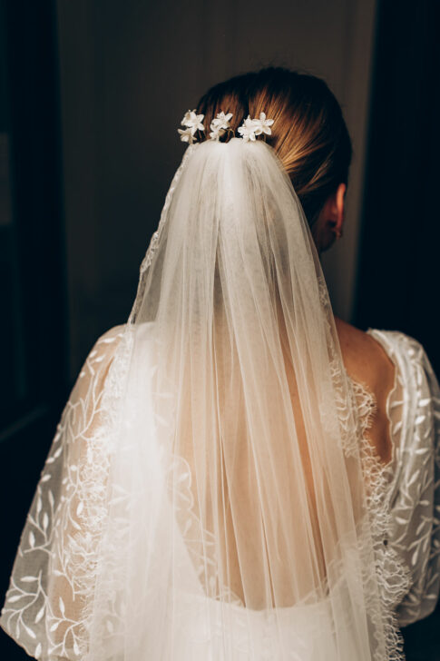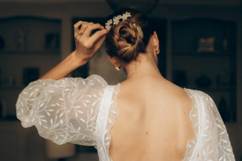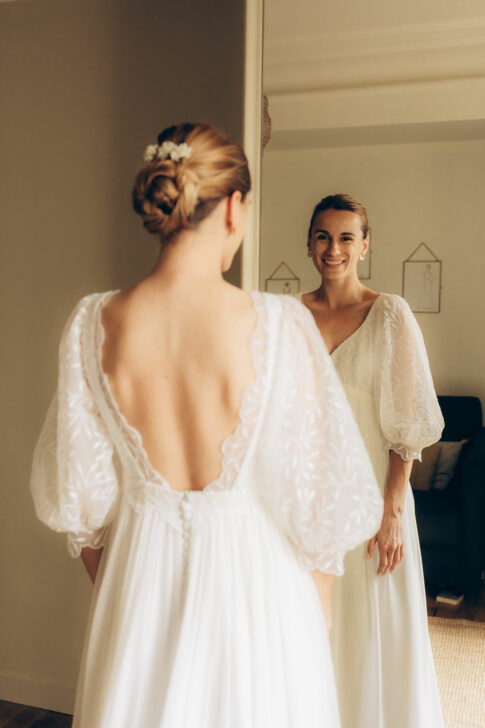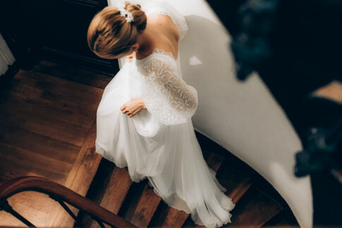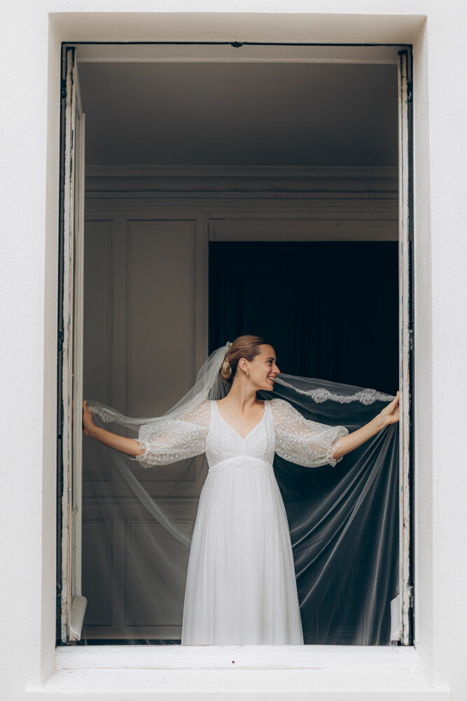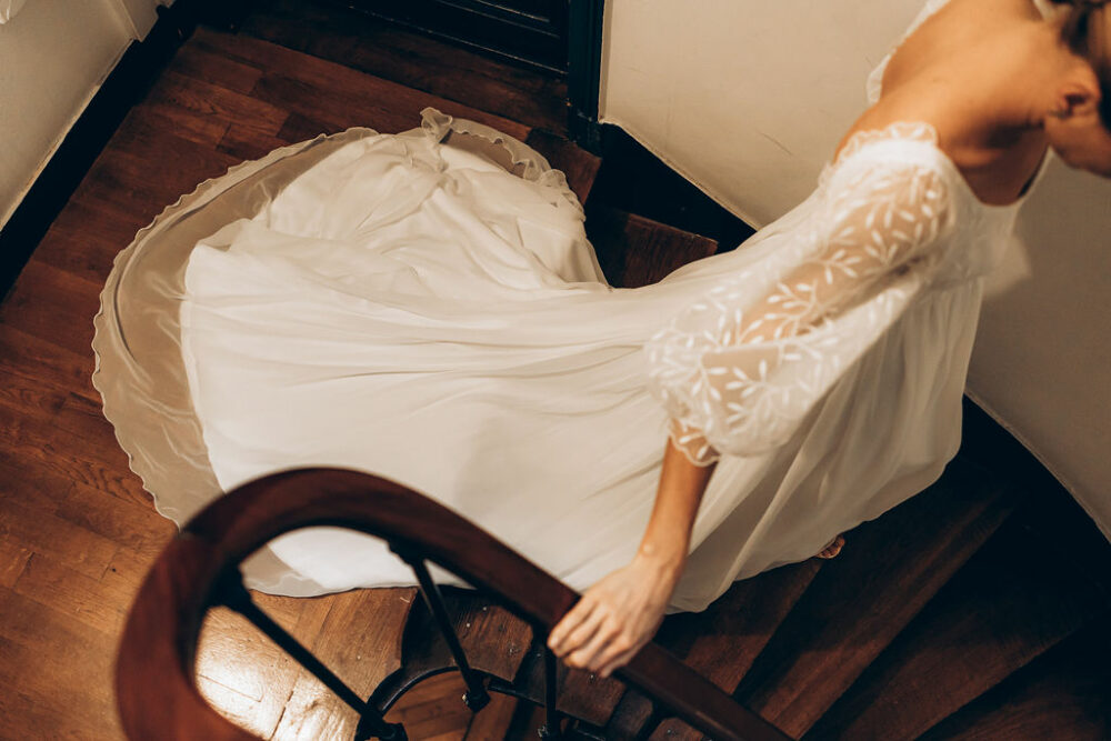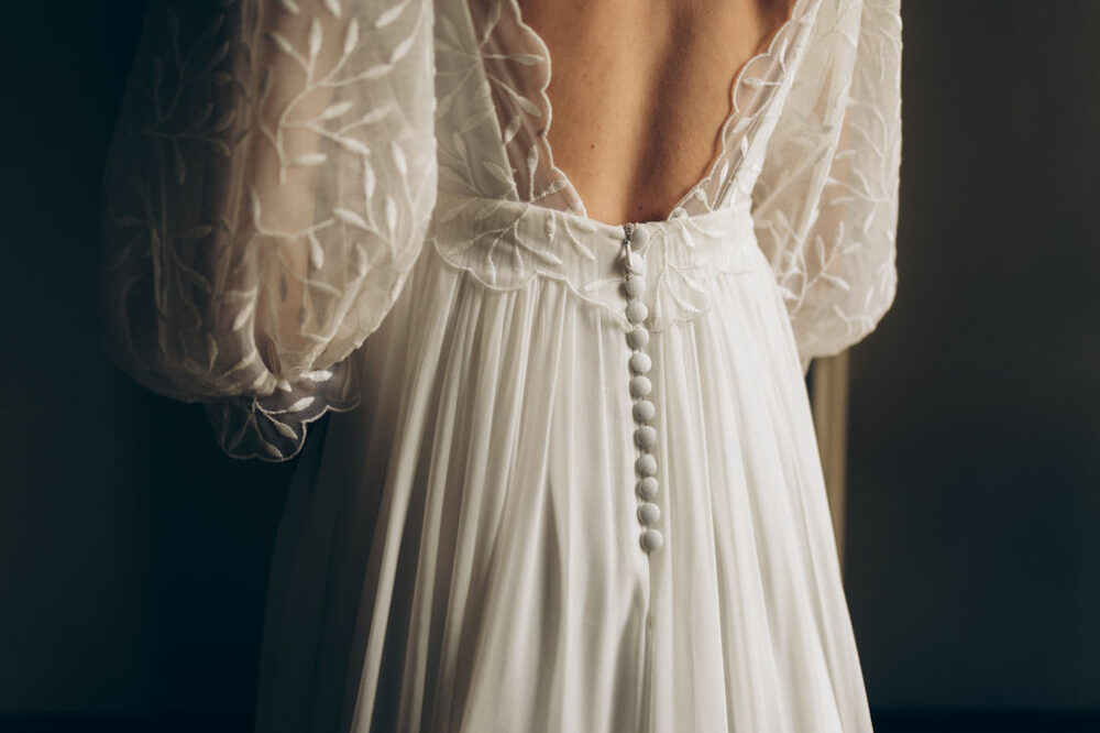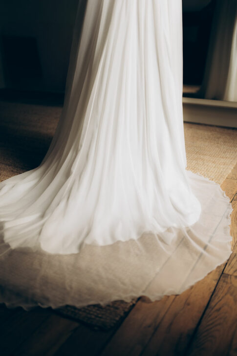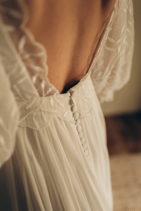 Robe en crêpe fluide avec une sur-jupe amovible en crêpe Georgette de soie, et des manches en tulle brodé, amovibles.