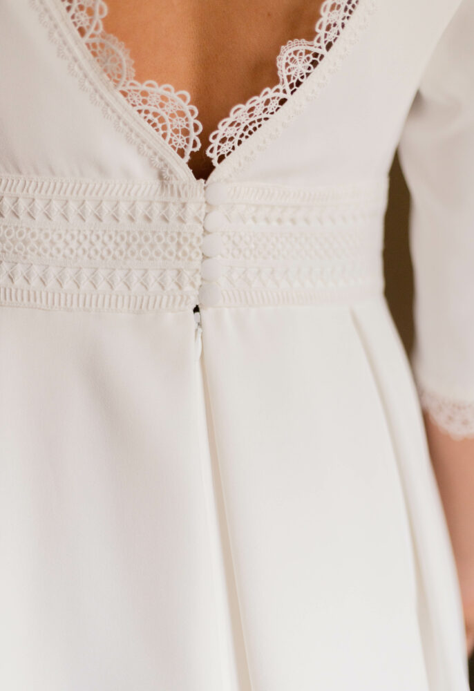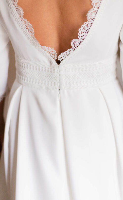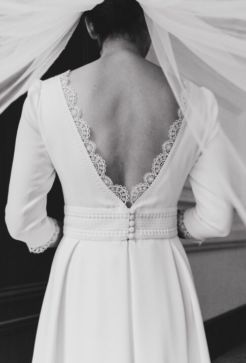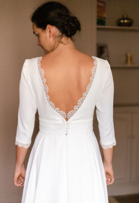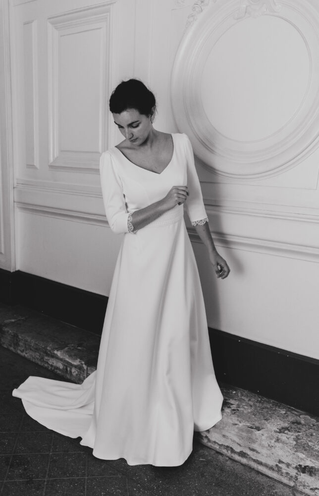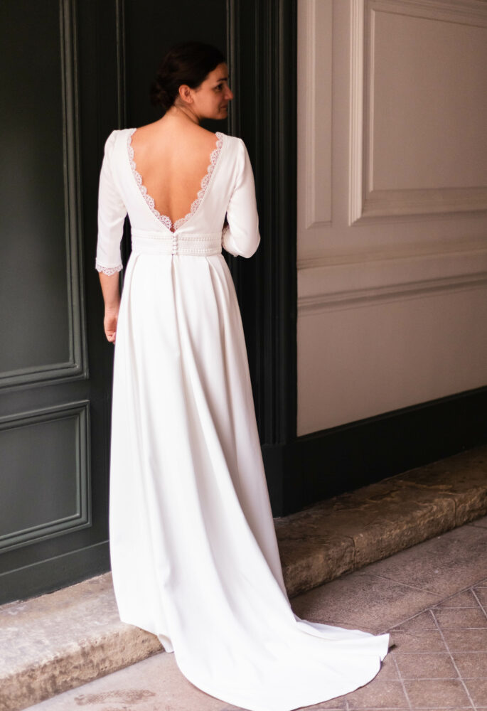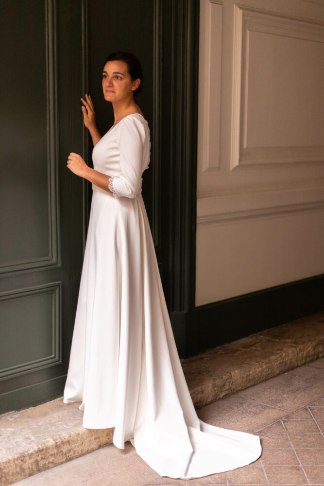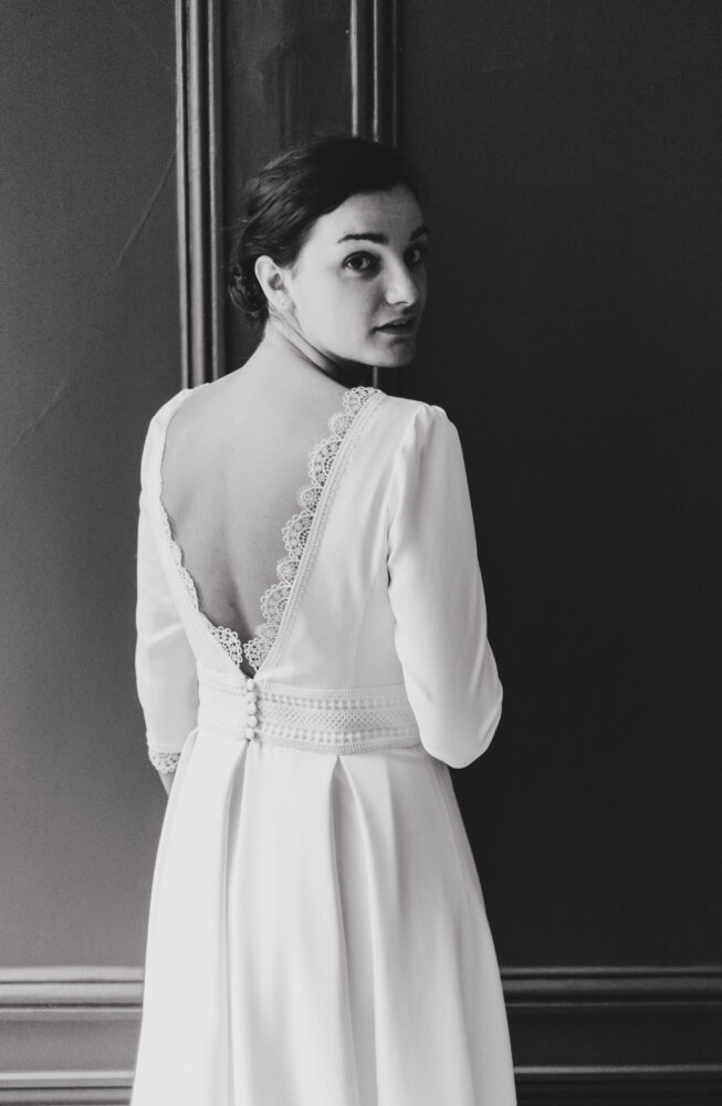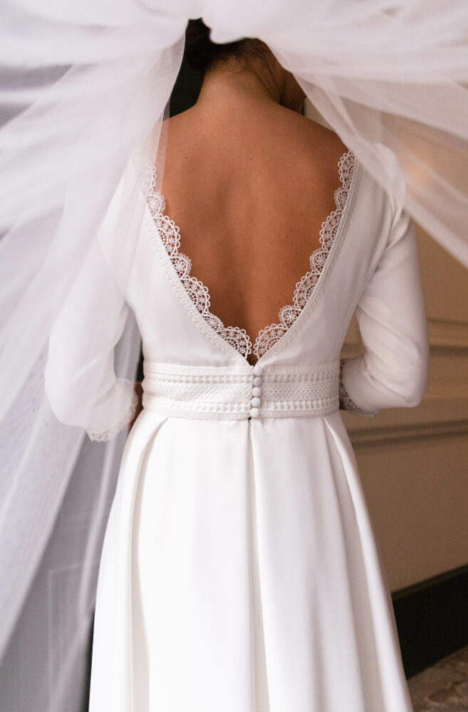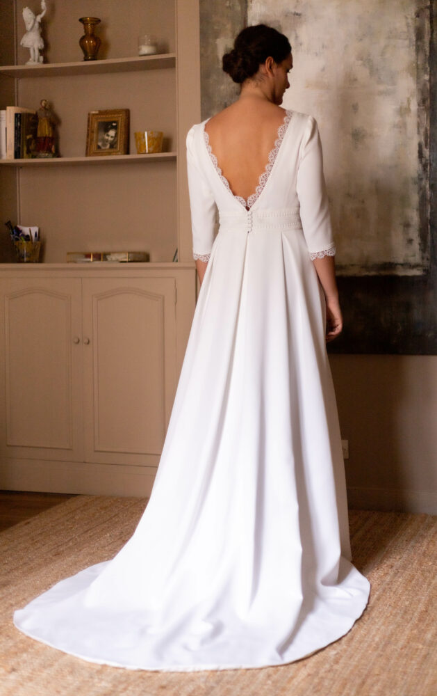 Robe en crêpe lourd, jupe trapèze et avec plis creux dans le dos et longue traine. La ceinture, les manches et le dos sont rehaussés d’un galon de guipure.