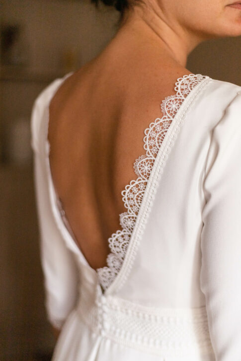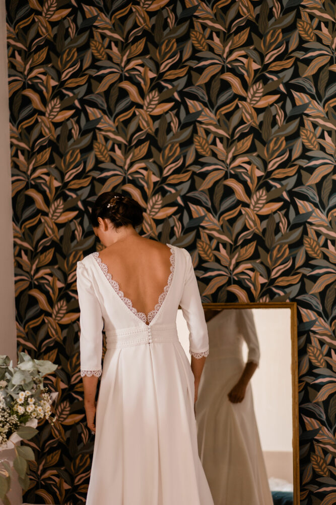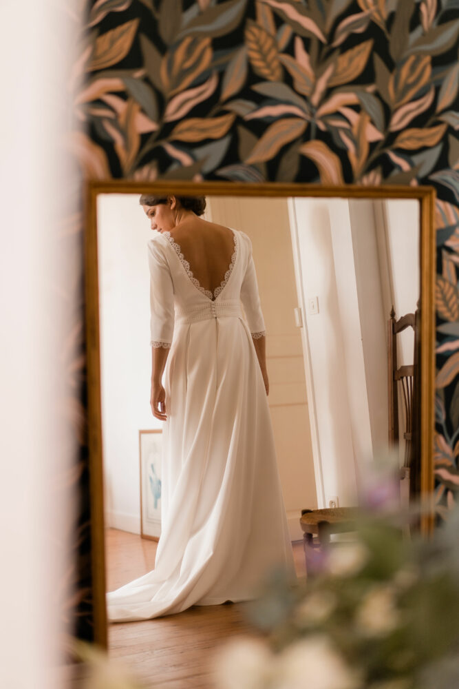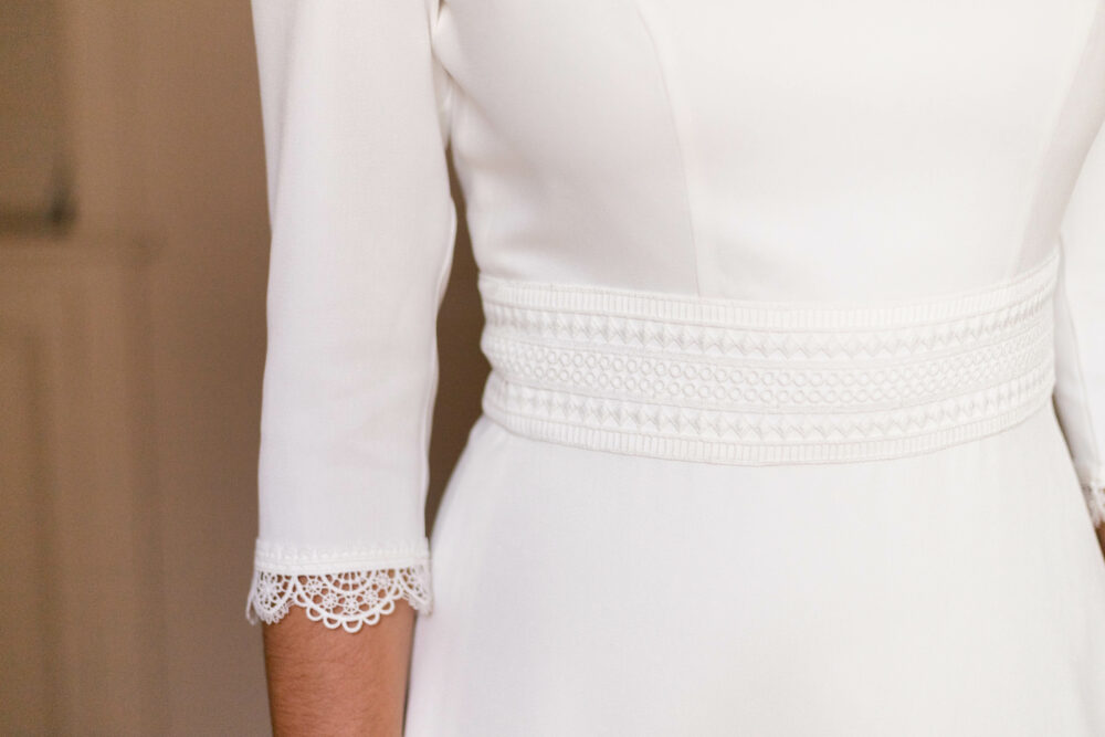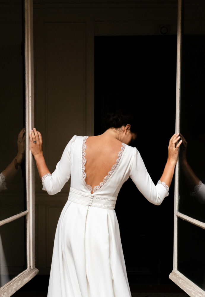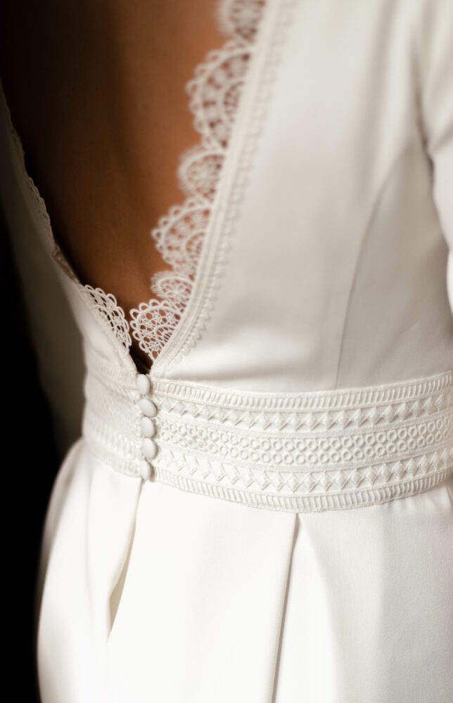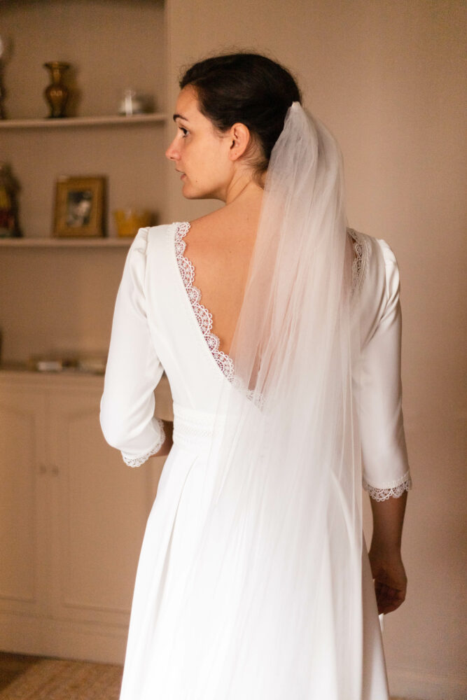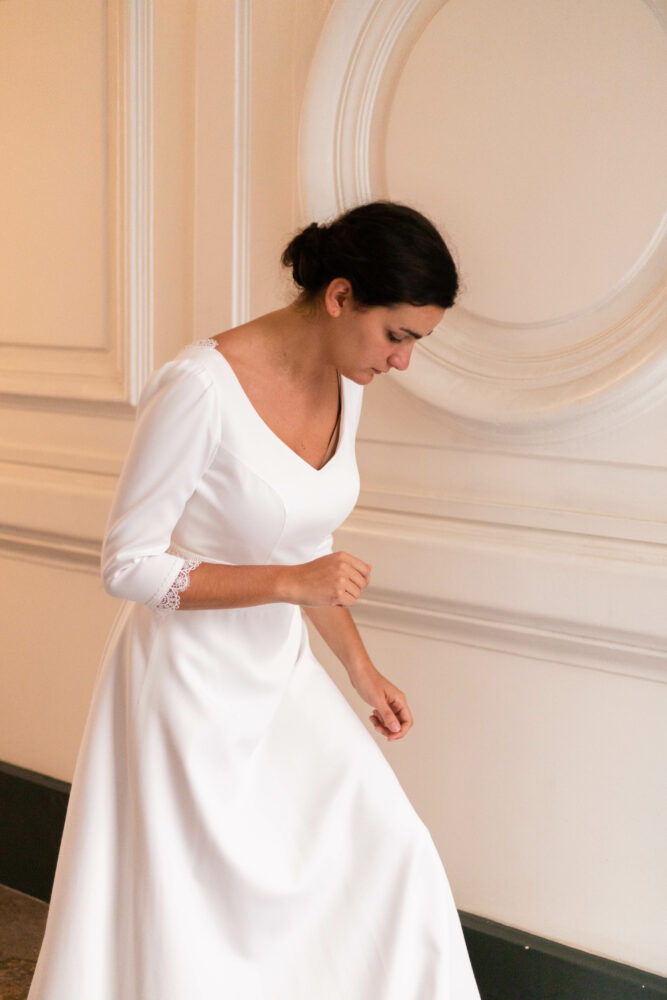 Robe en crêpe lourd, jupe trapèze et avec plis creux dans le dos et longue traine. La ceinture, les manches et le dos sont rehaussés d’un galon de guipure.
