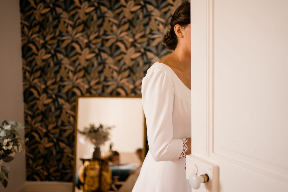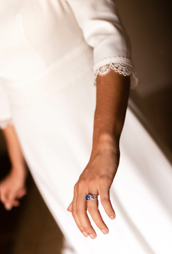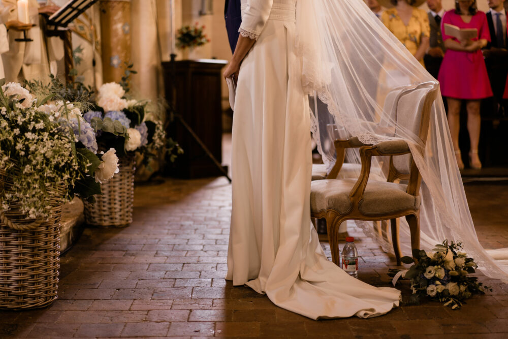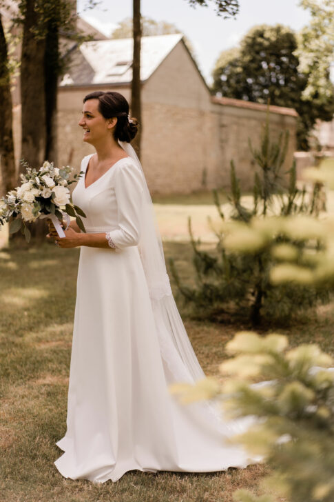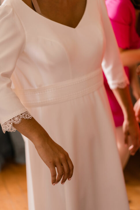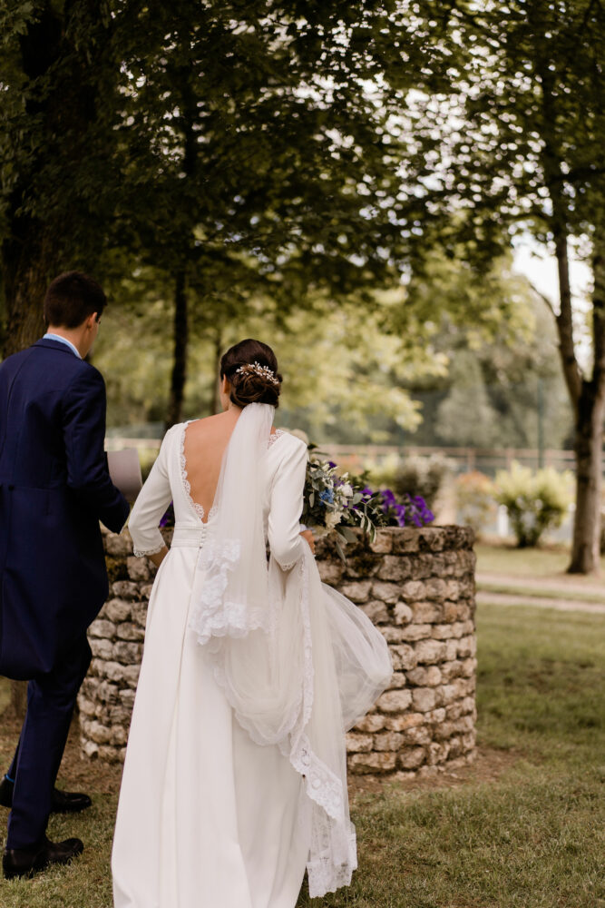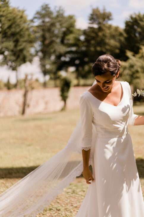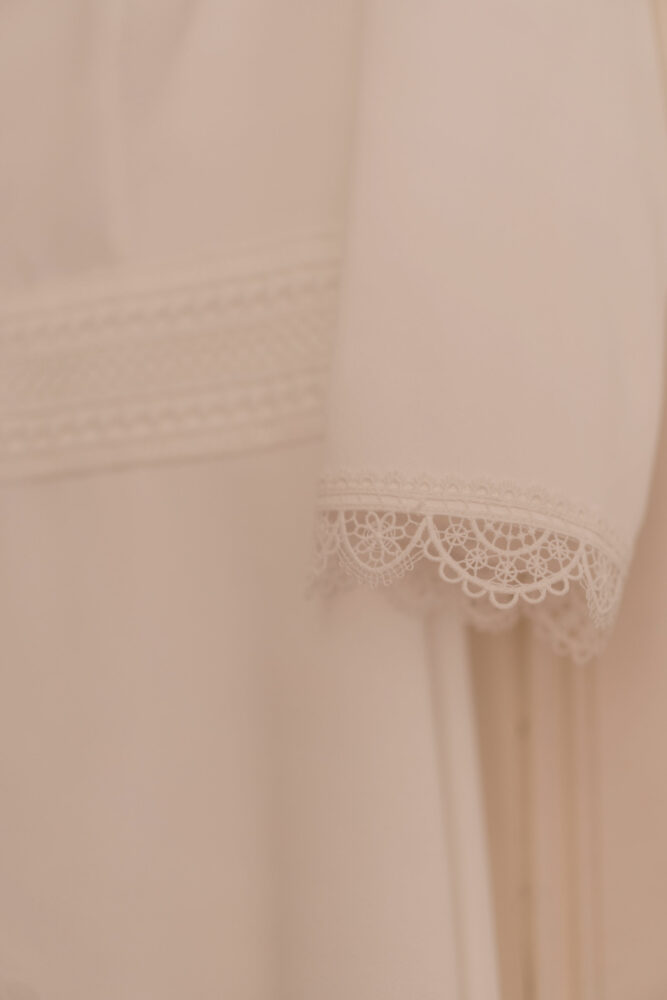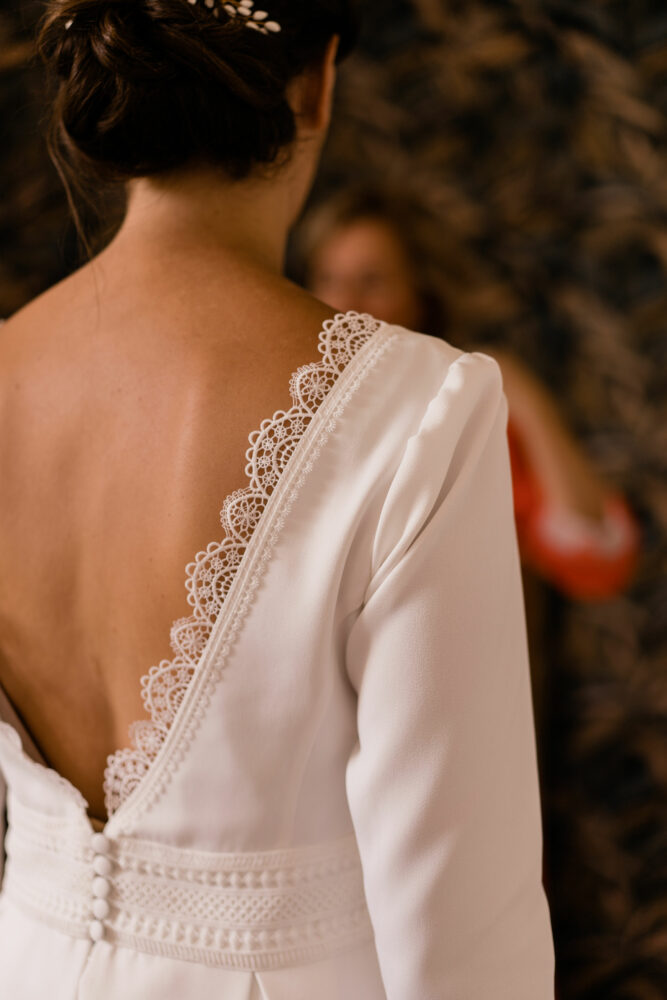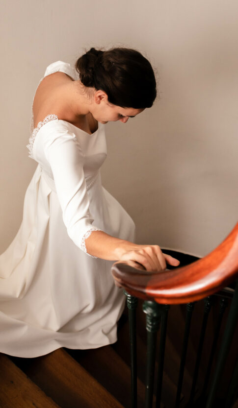 Robe en crêpe lourd, jupe trapèze et avec plis creux dans le dos et longue traine. La ceinture, les manches et le dos sont rehaussés d’un galon de guipure.