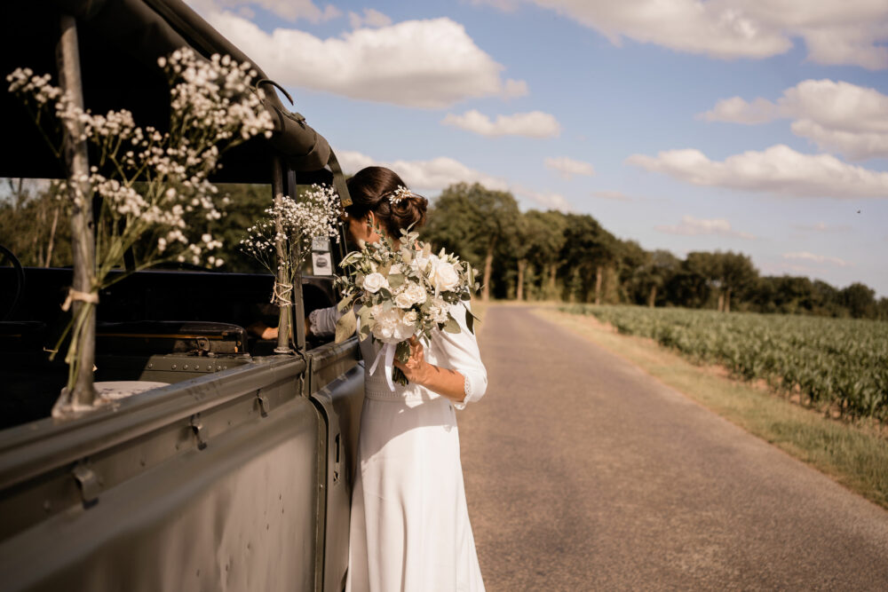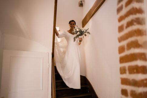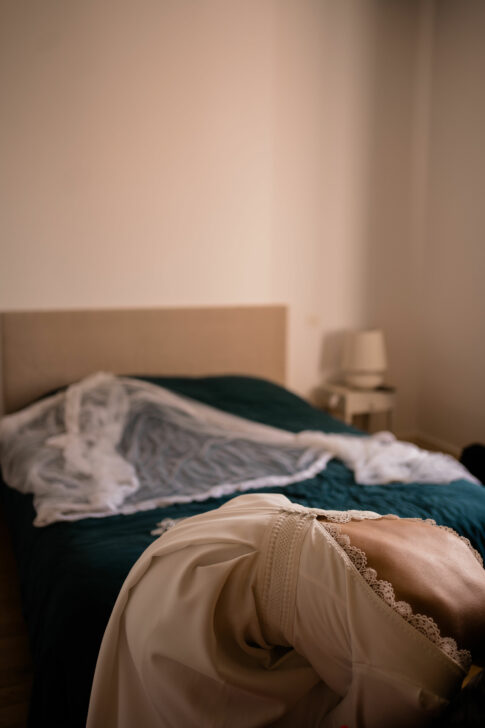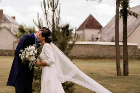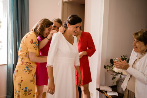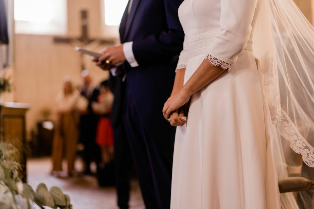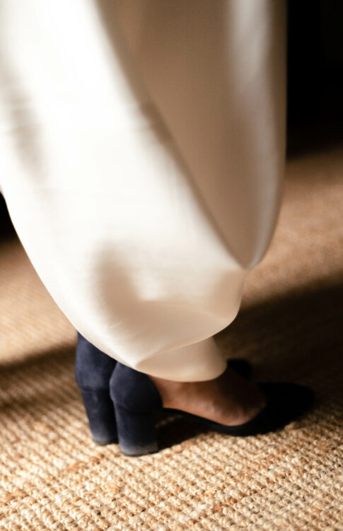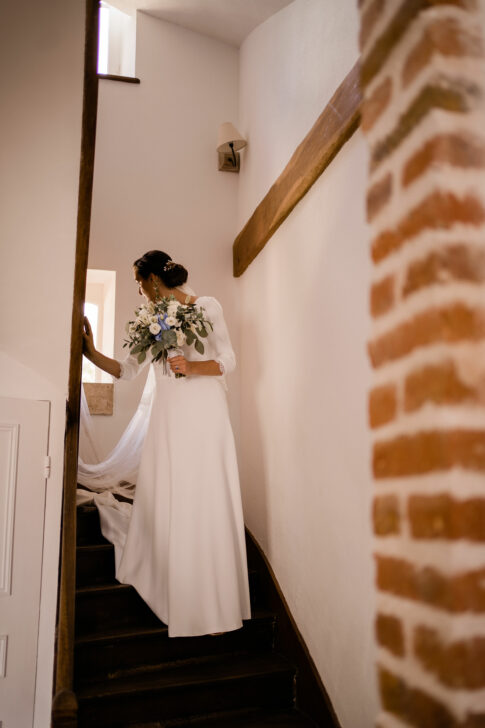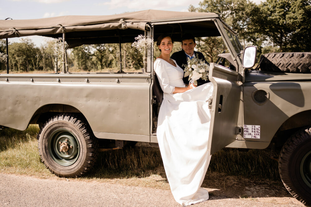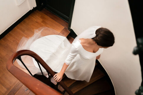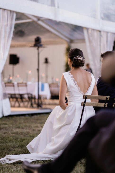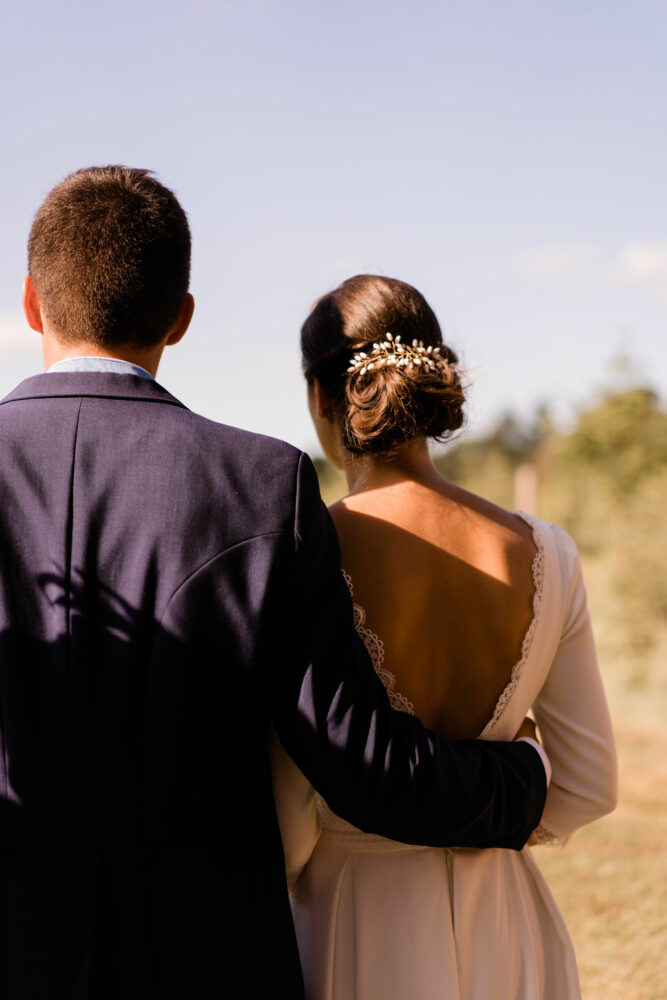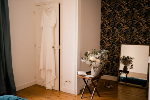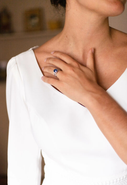 Robe en crêpe lourd, jupe trapèze et avec plis creux dans le dos et longue traine. La ceinture, les manches et le dos sont rehaussés d’un galon de guipure.