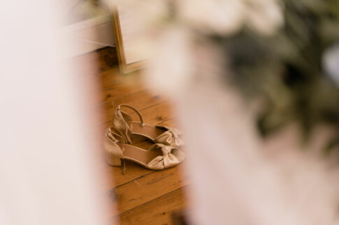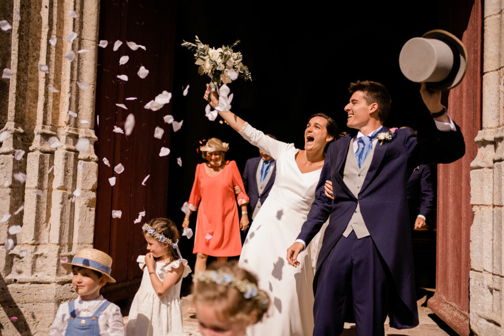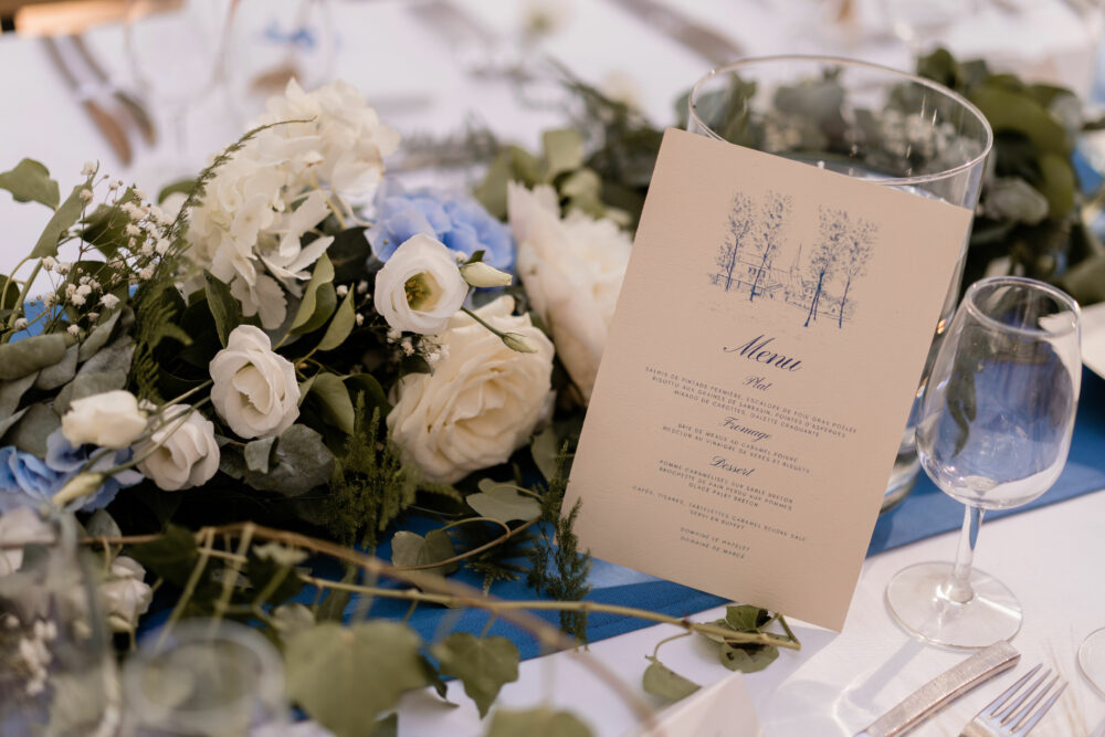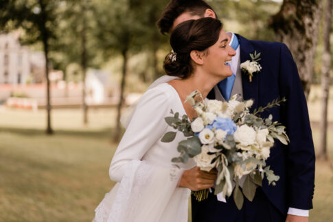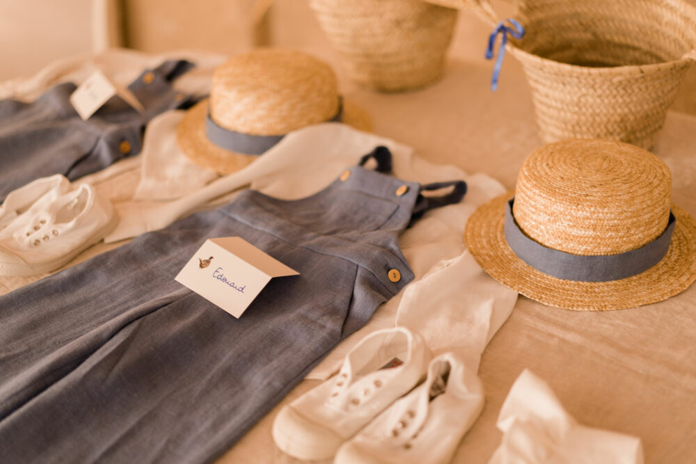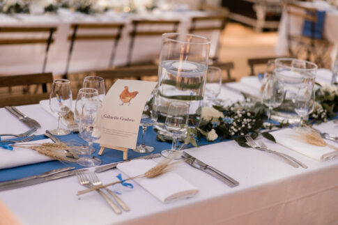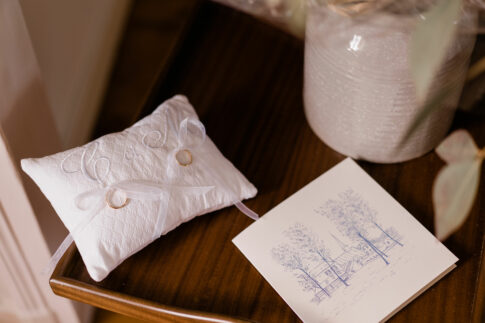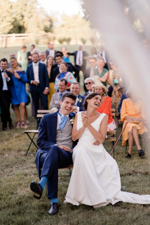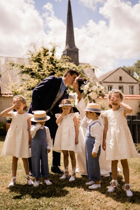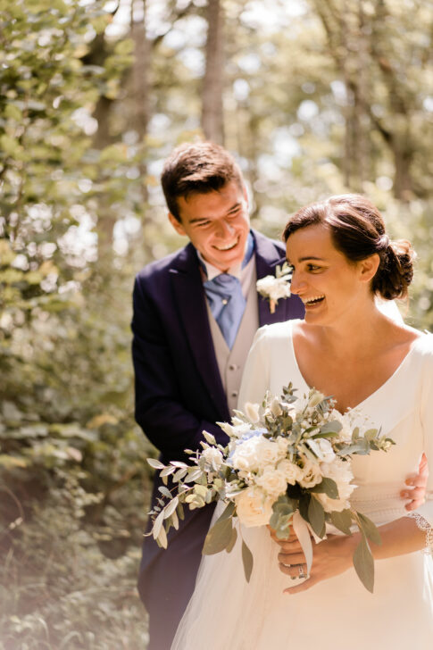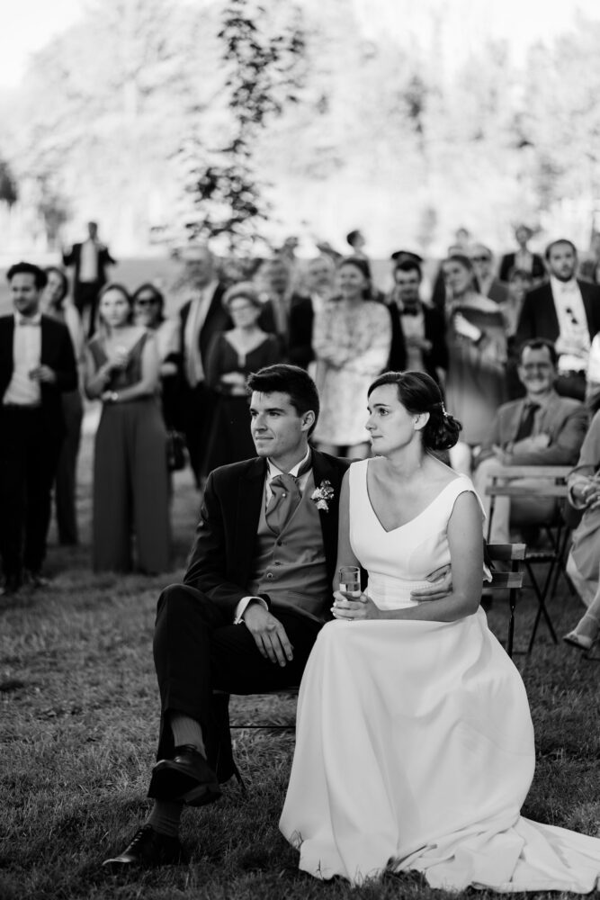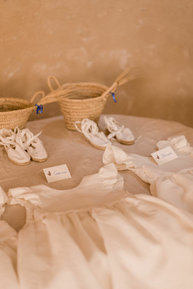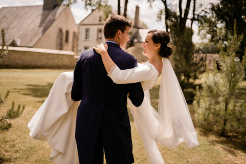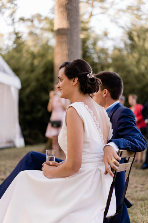 Robe en crêpe lourd, jupe trapèze et avec plis creux dans le dos et longue traine. La ceinture, les manches et le dos sont rehaussés d’un galon de guipure.