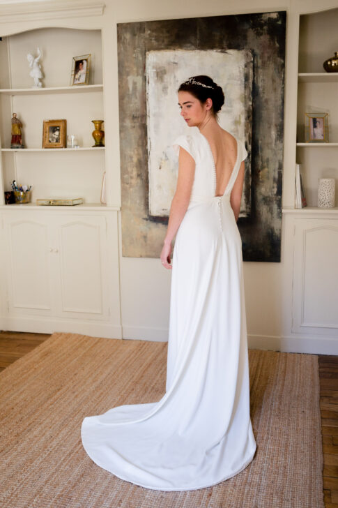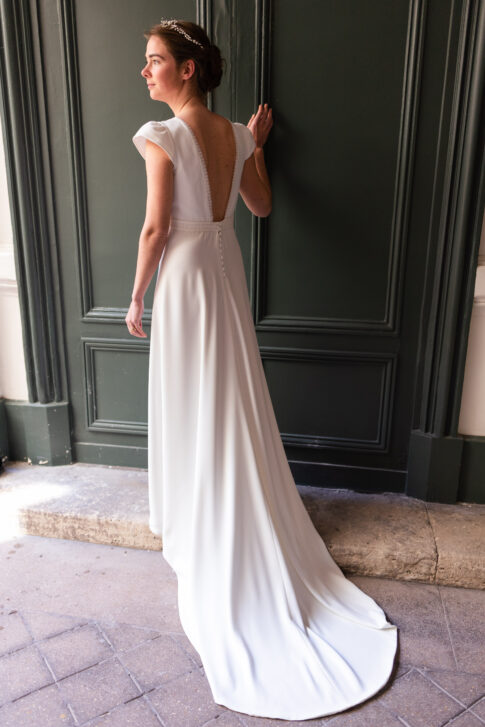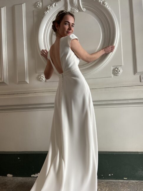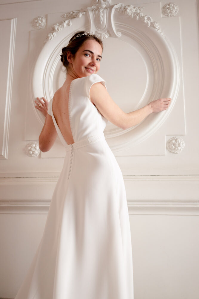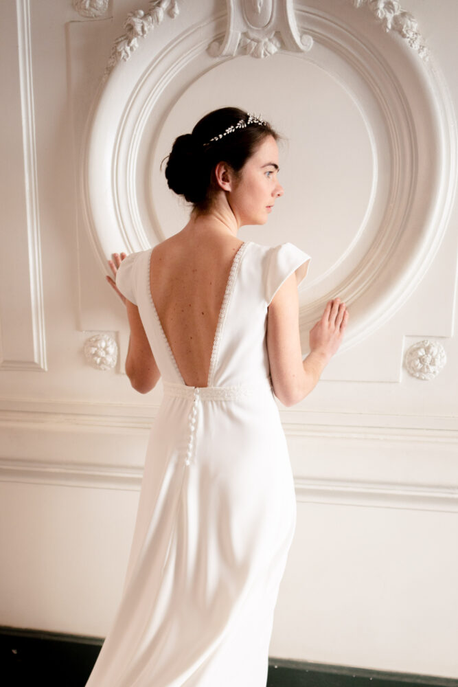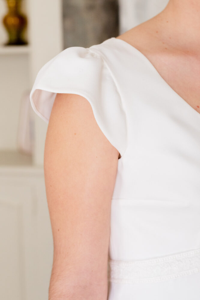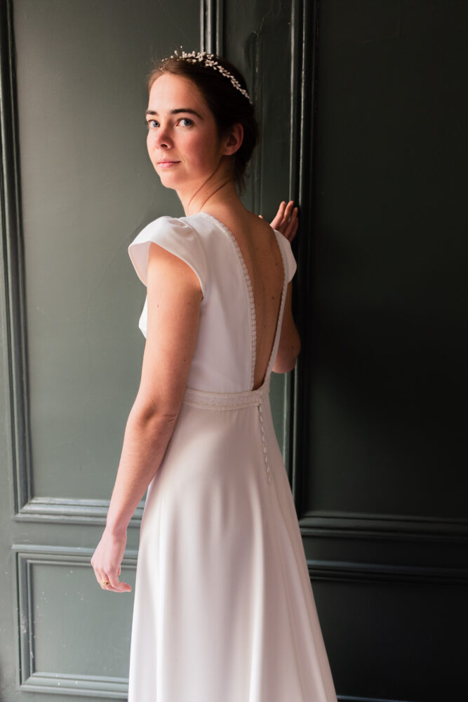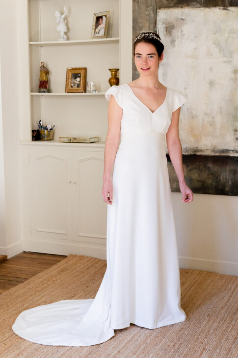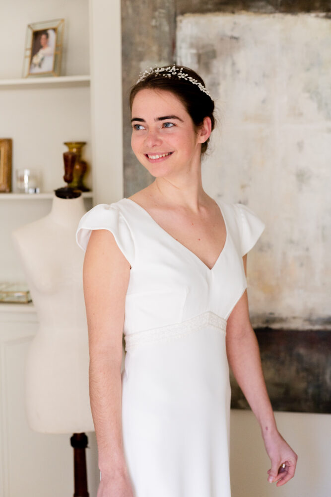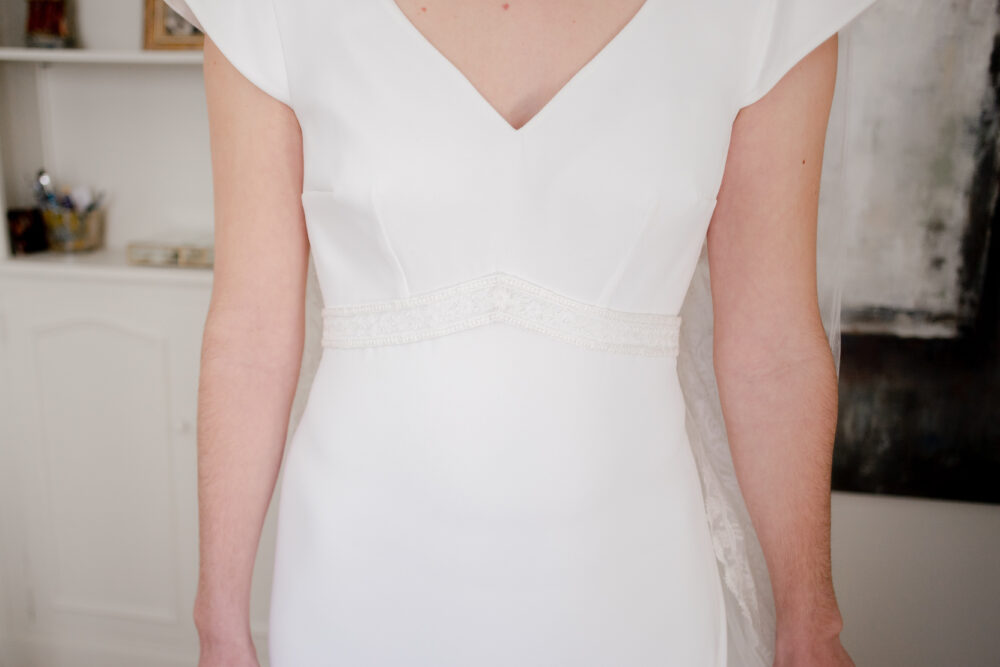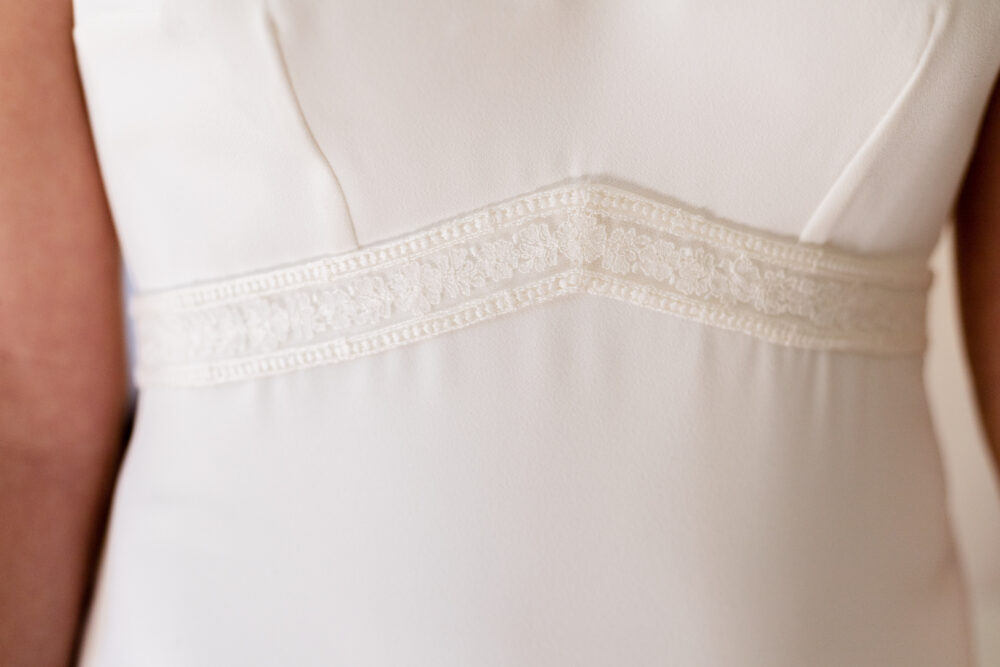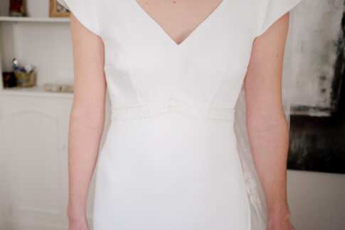 Robe en crêpe lourd, taille haute en pointe rehaussée d’une dentelle en tulle brodé.