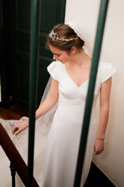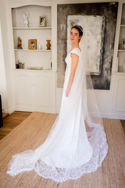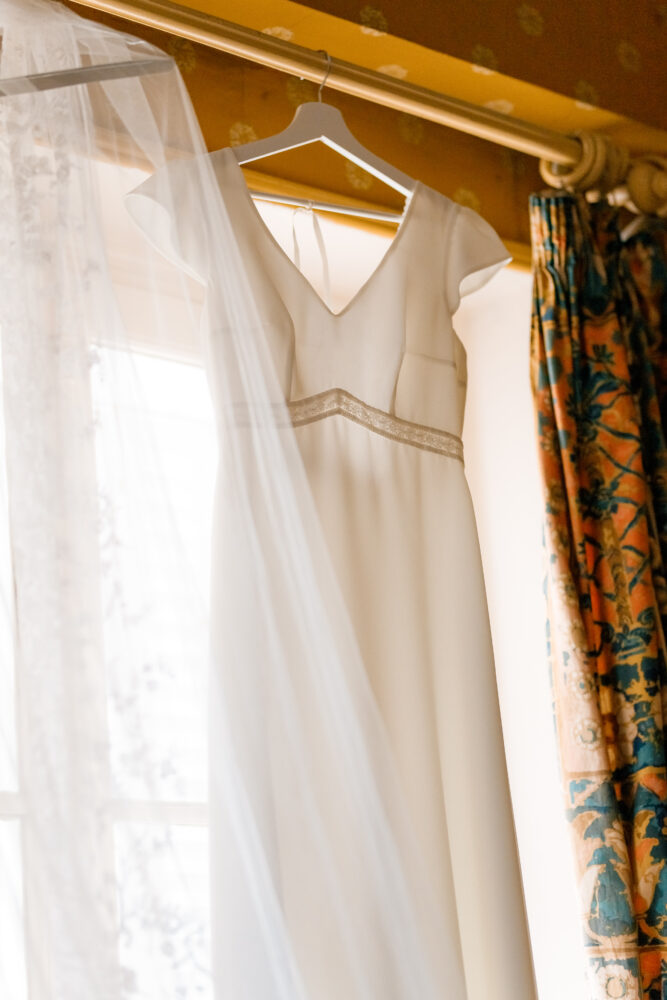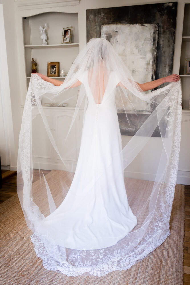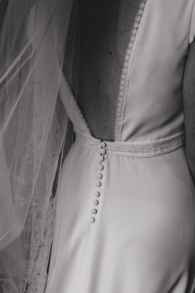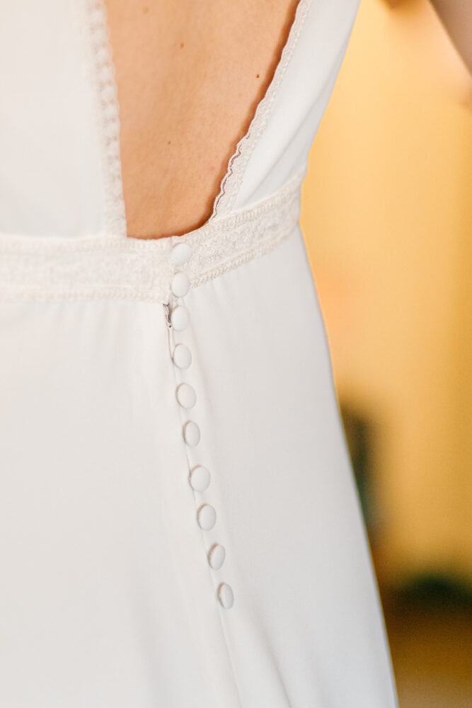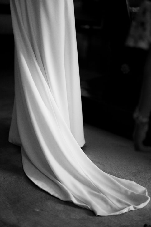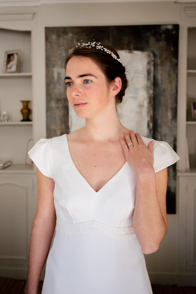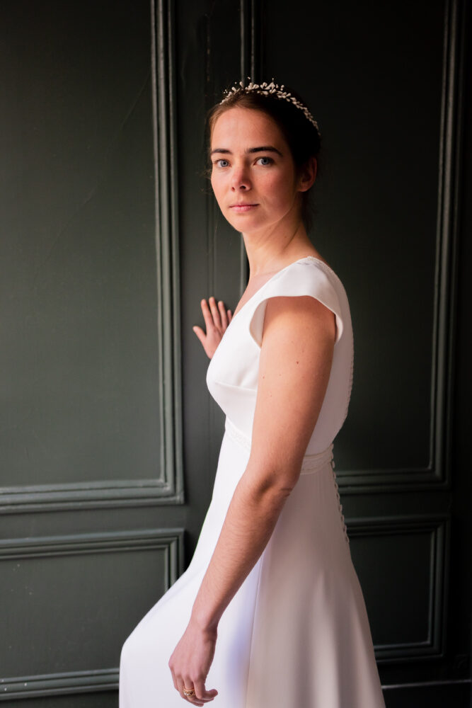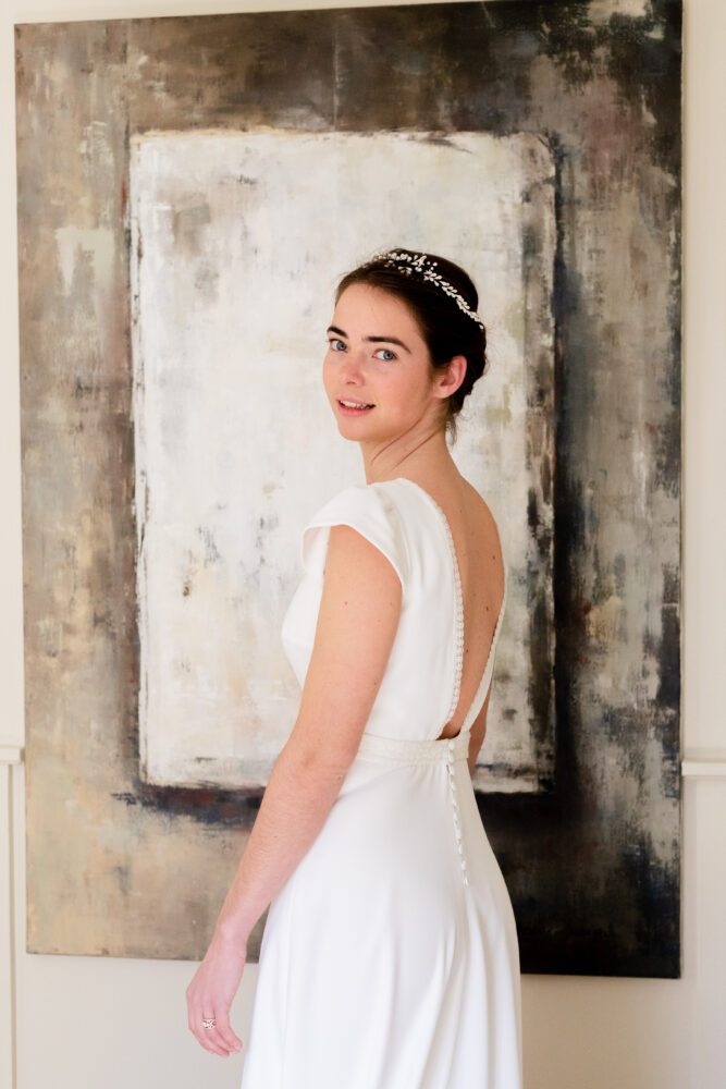 Robe en crêpe lourd, taille haute en pointe rehaussée d’une dentelle en tulle brodé.