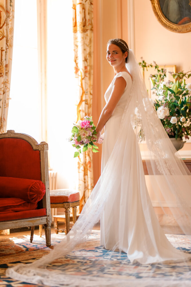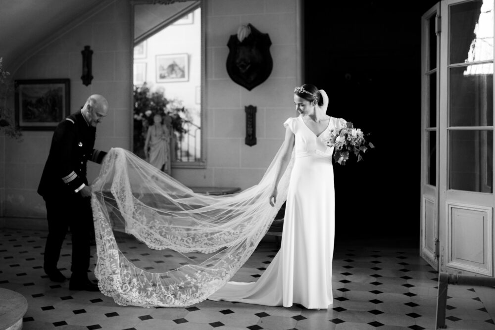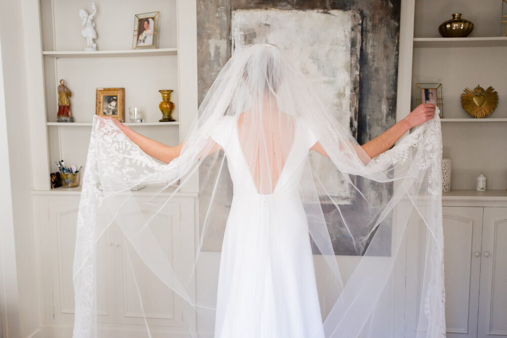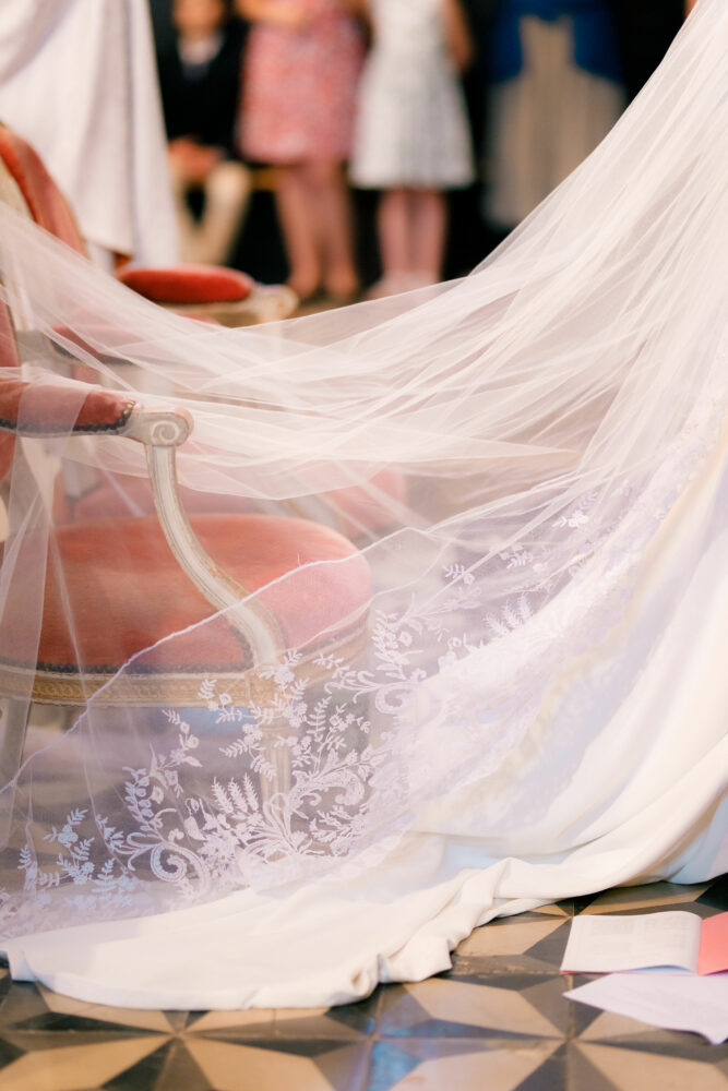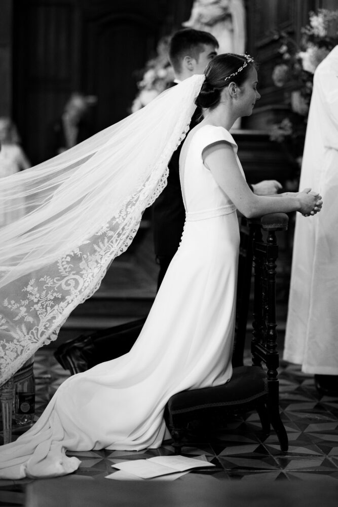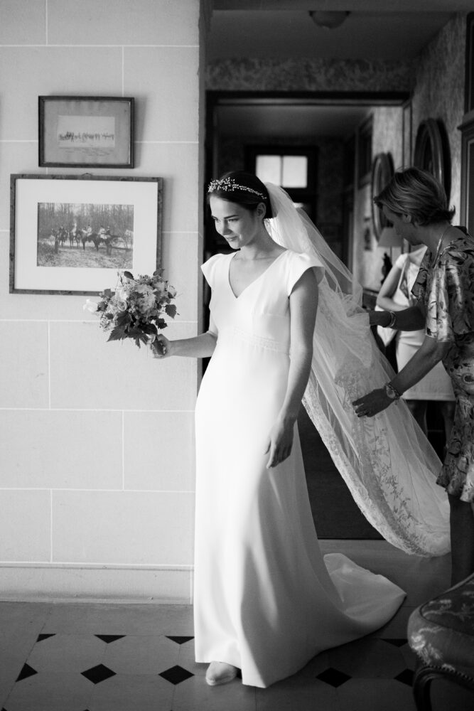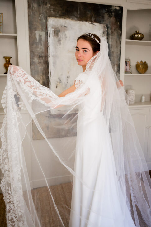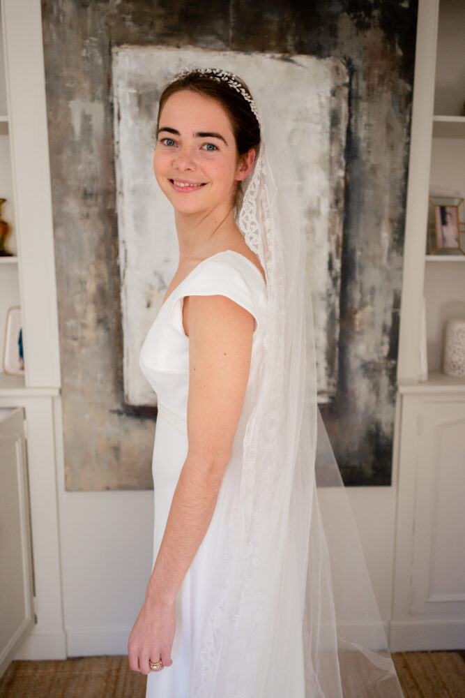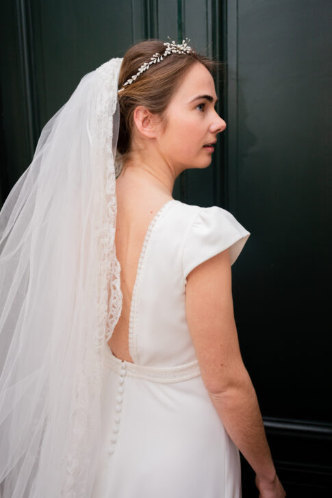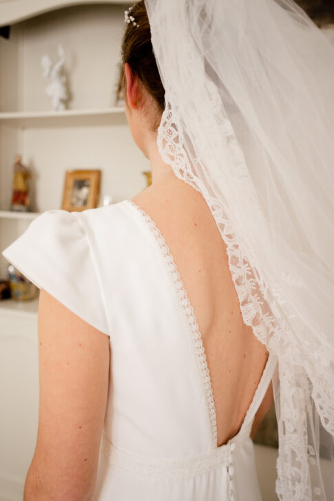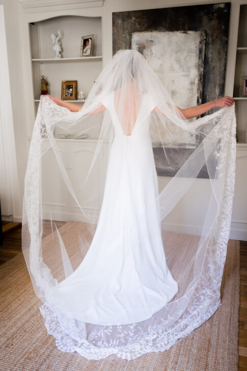 Robe en crêpe lourd, taille haute en pointe rehaussée d’une dentelle en tulle brodé.