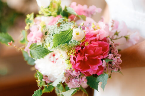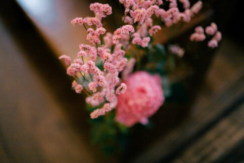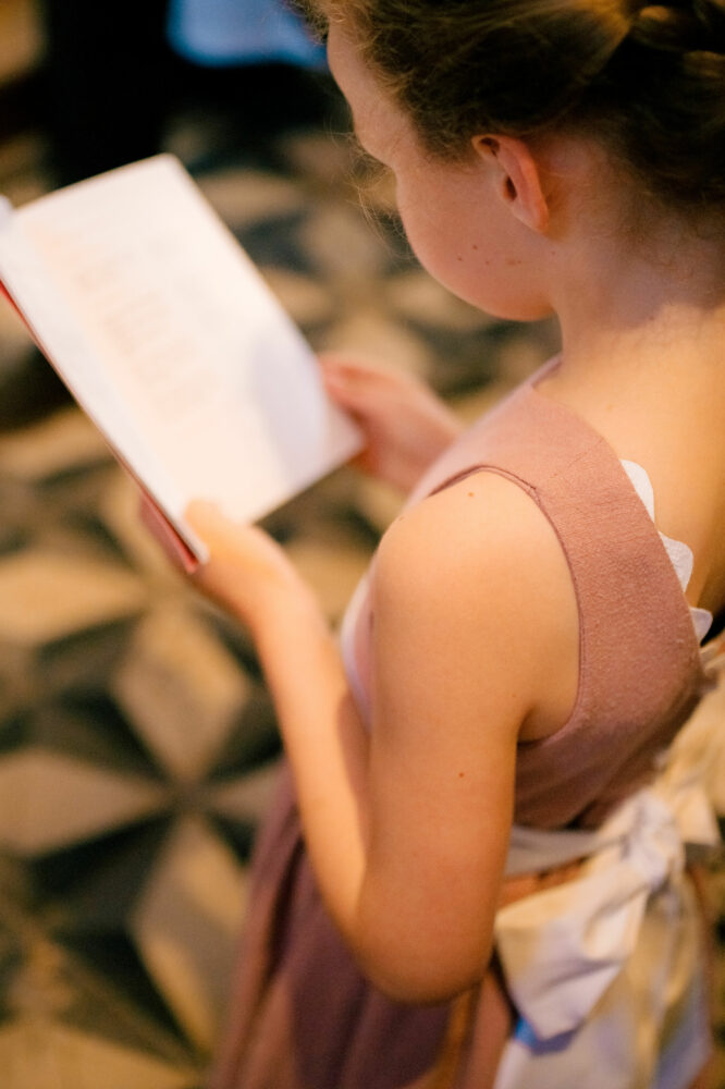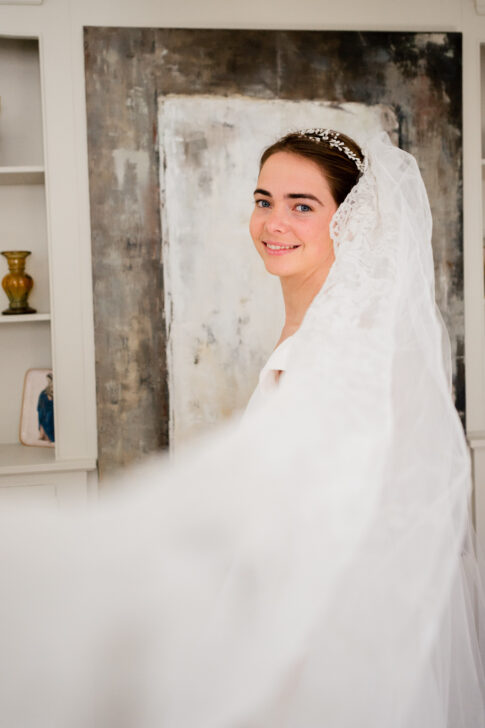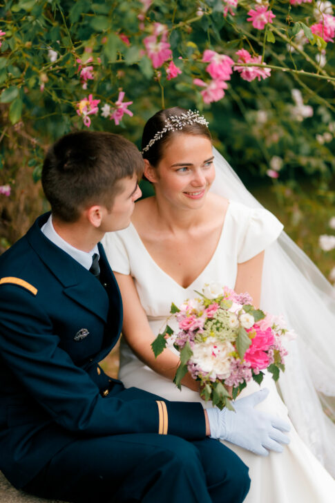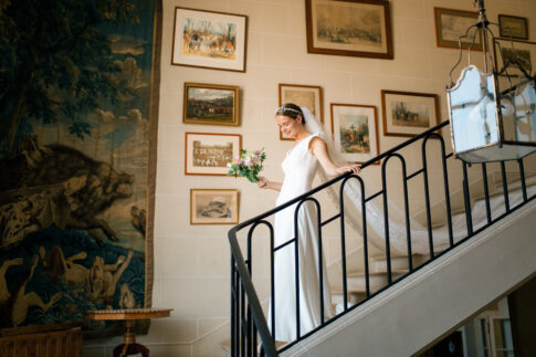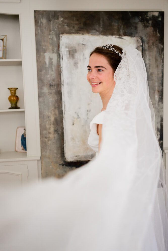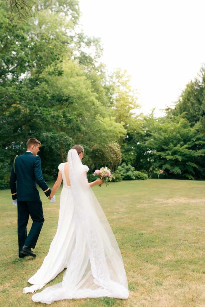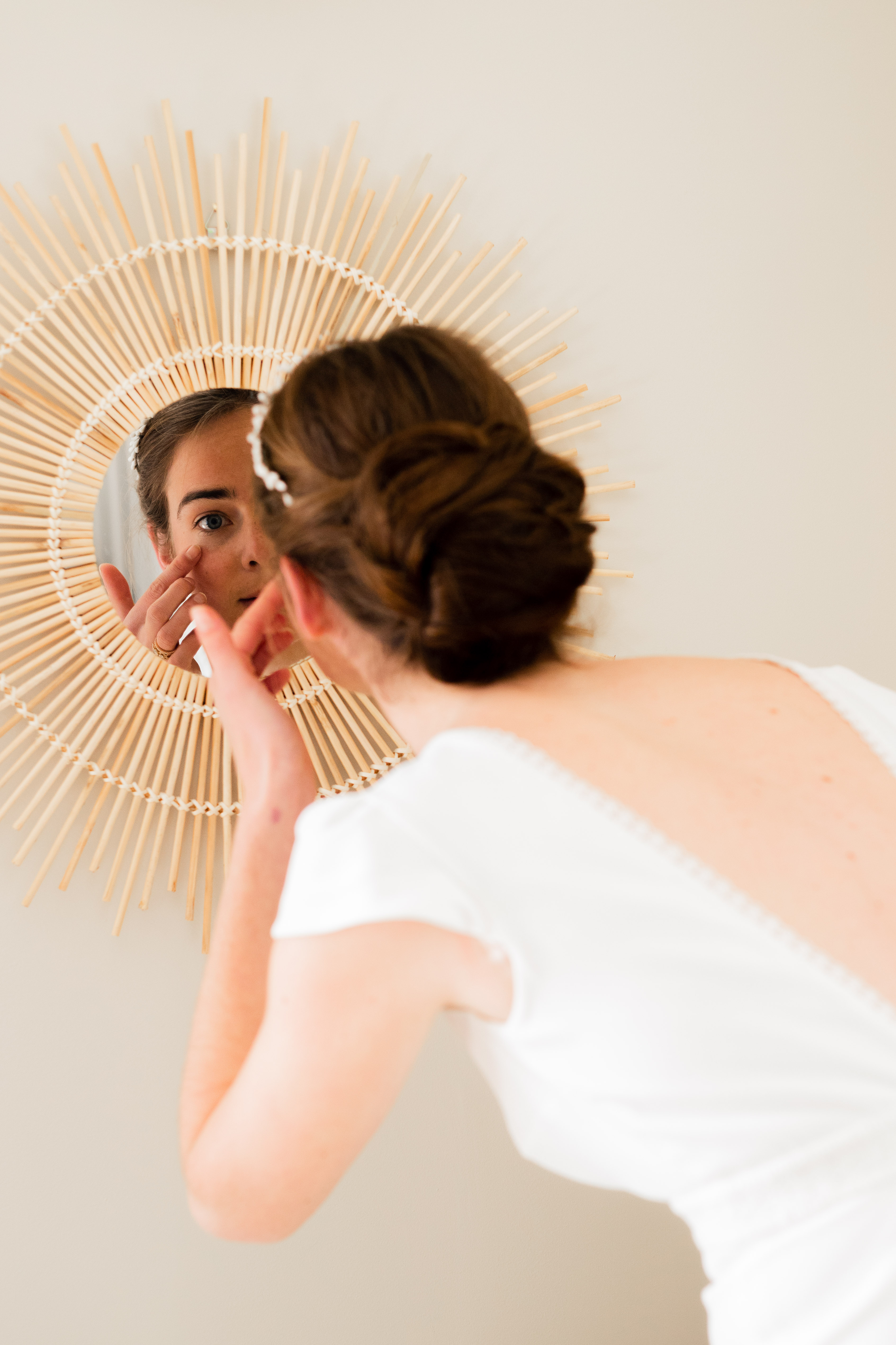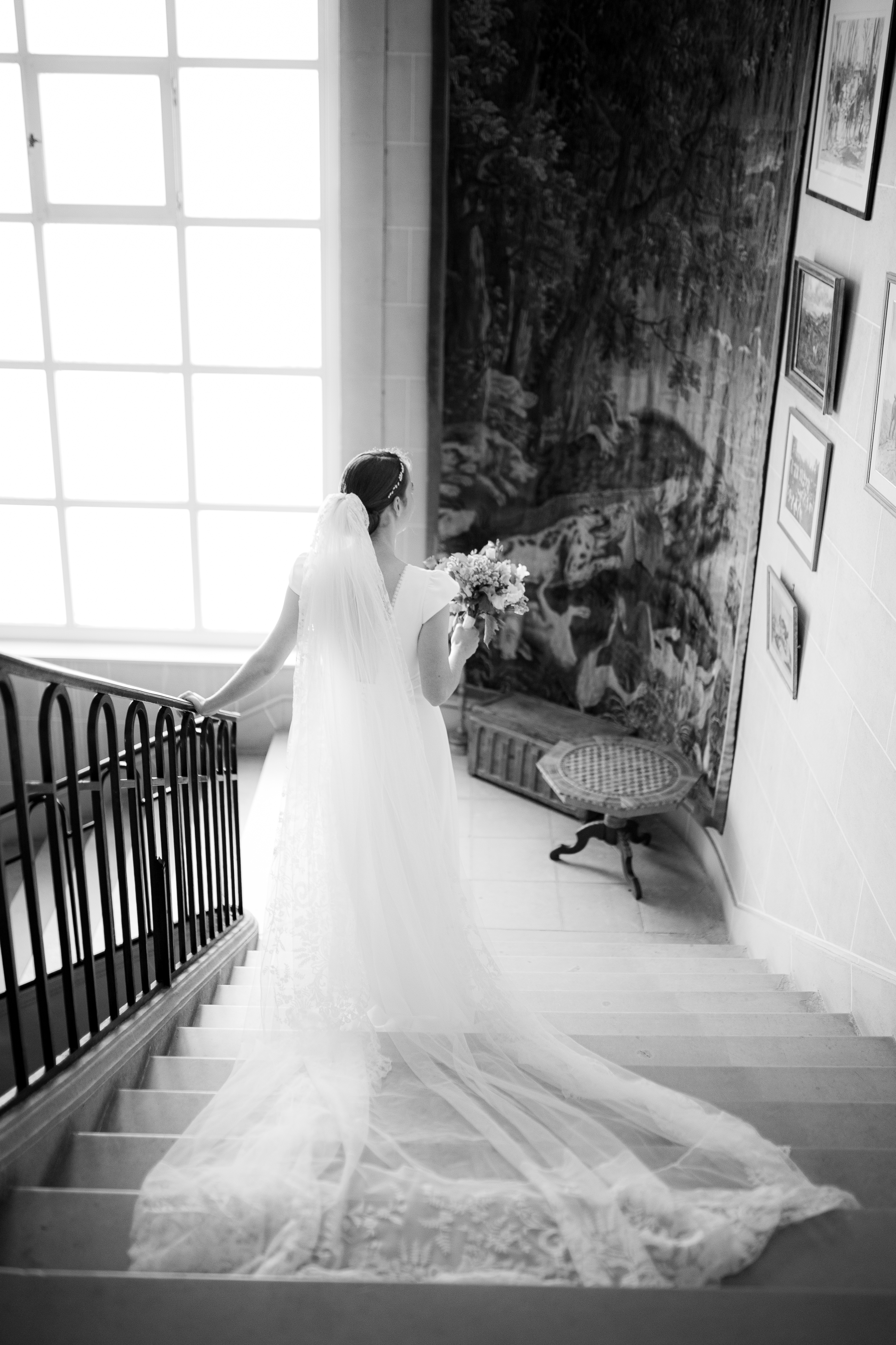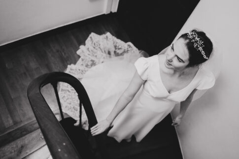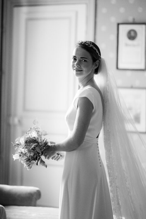 Robe en crêpe lourd, taille haute en pointe rehaussée d’une dentelle en tulle brodé.