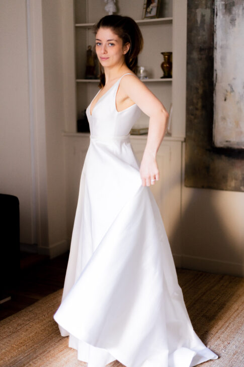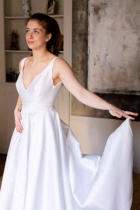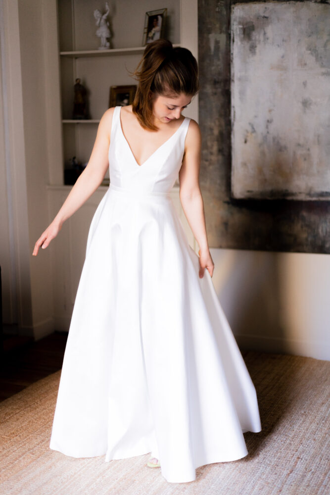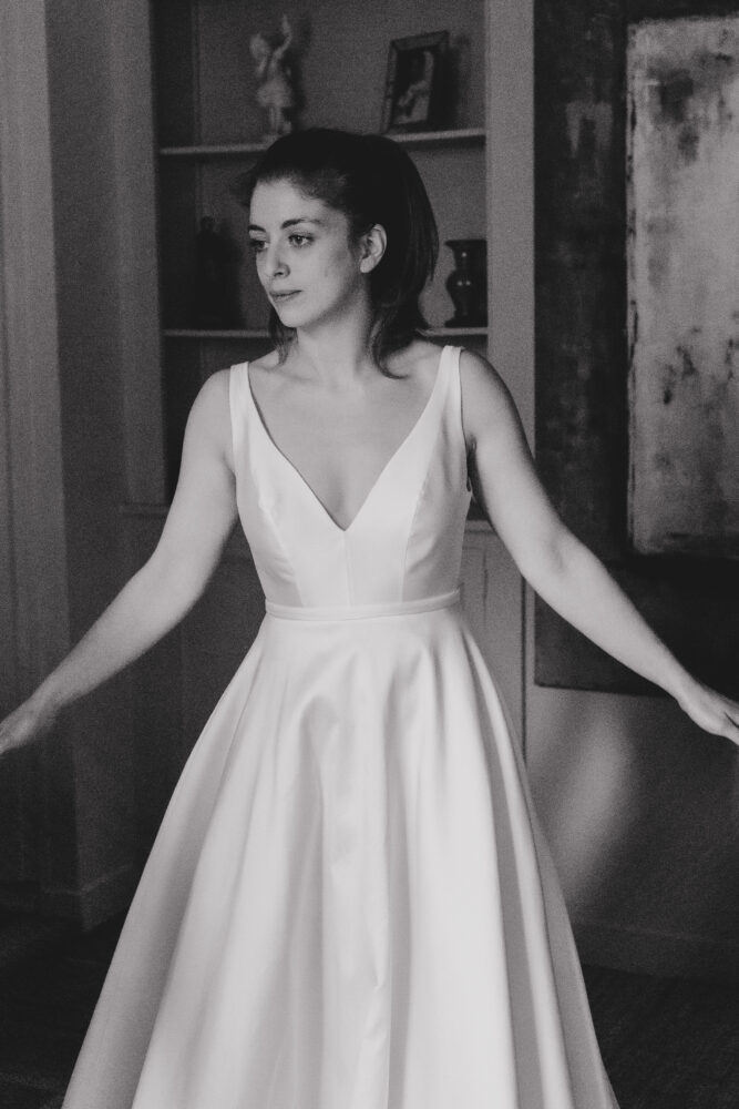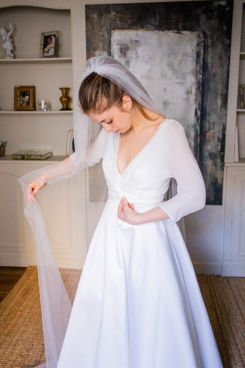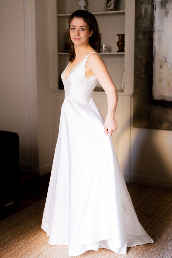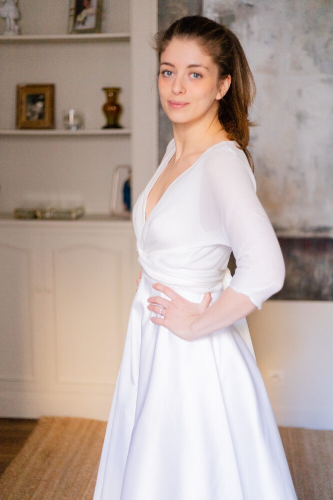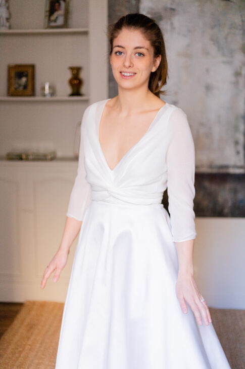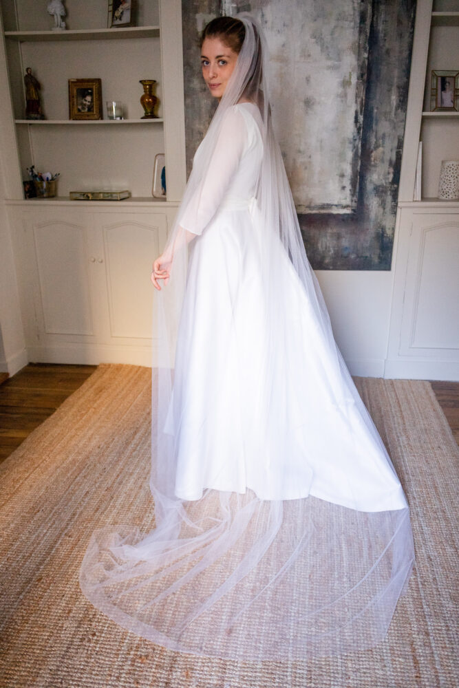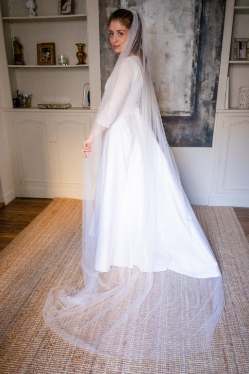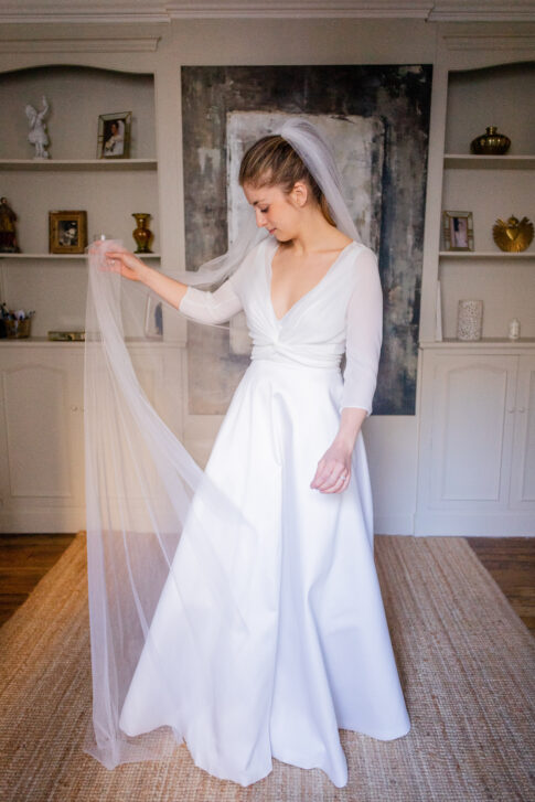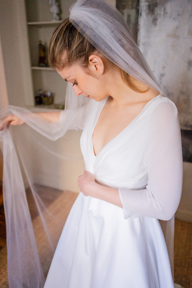 Robe en mikado de soie, avec un top en crêpe crinkle noué dans le dos. Voile simple en tulle fin.