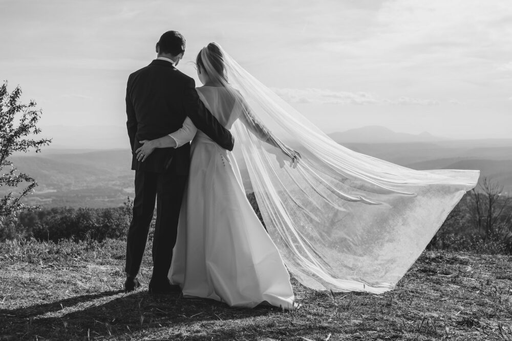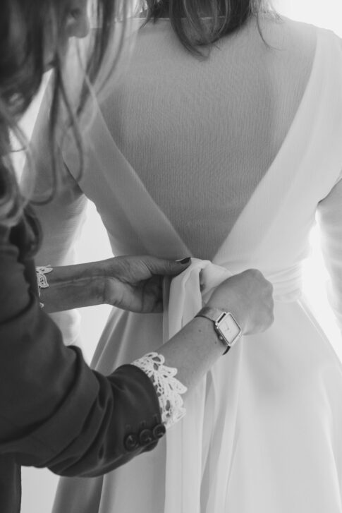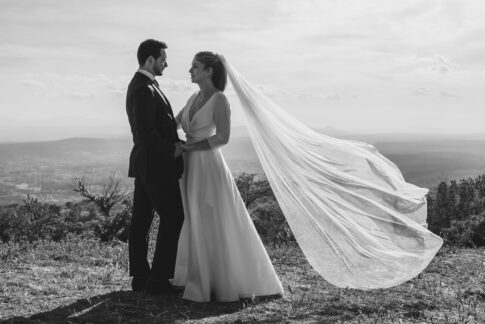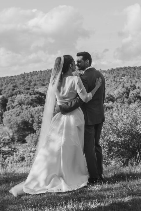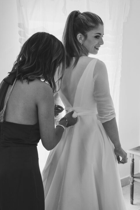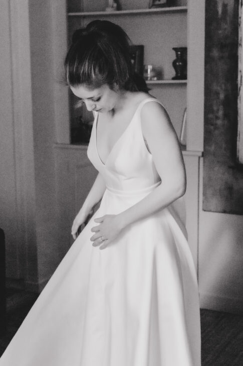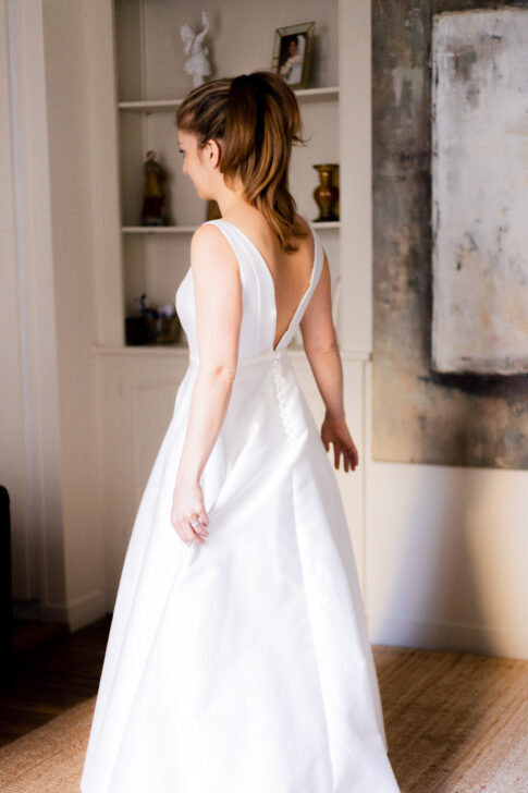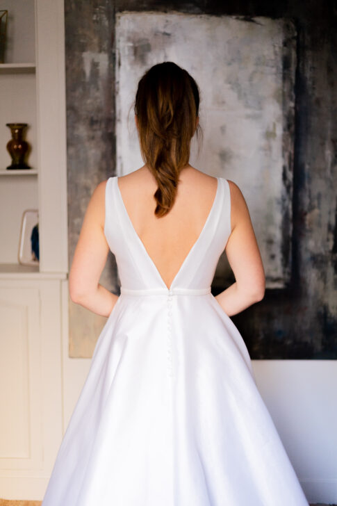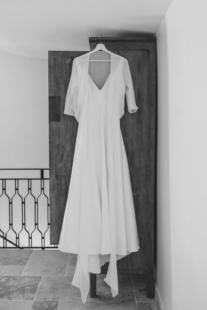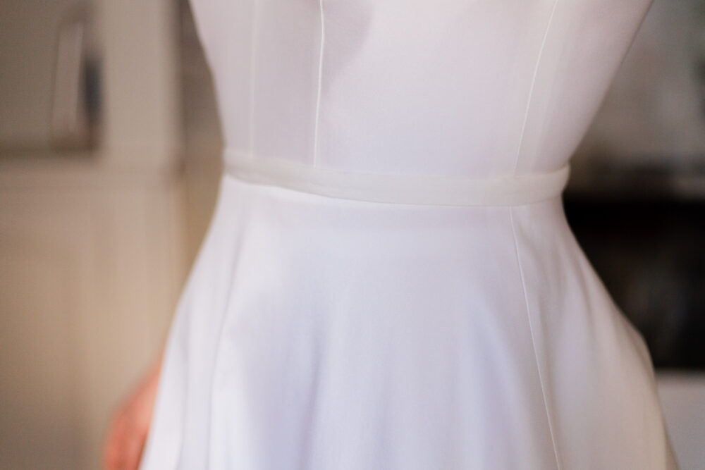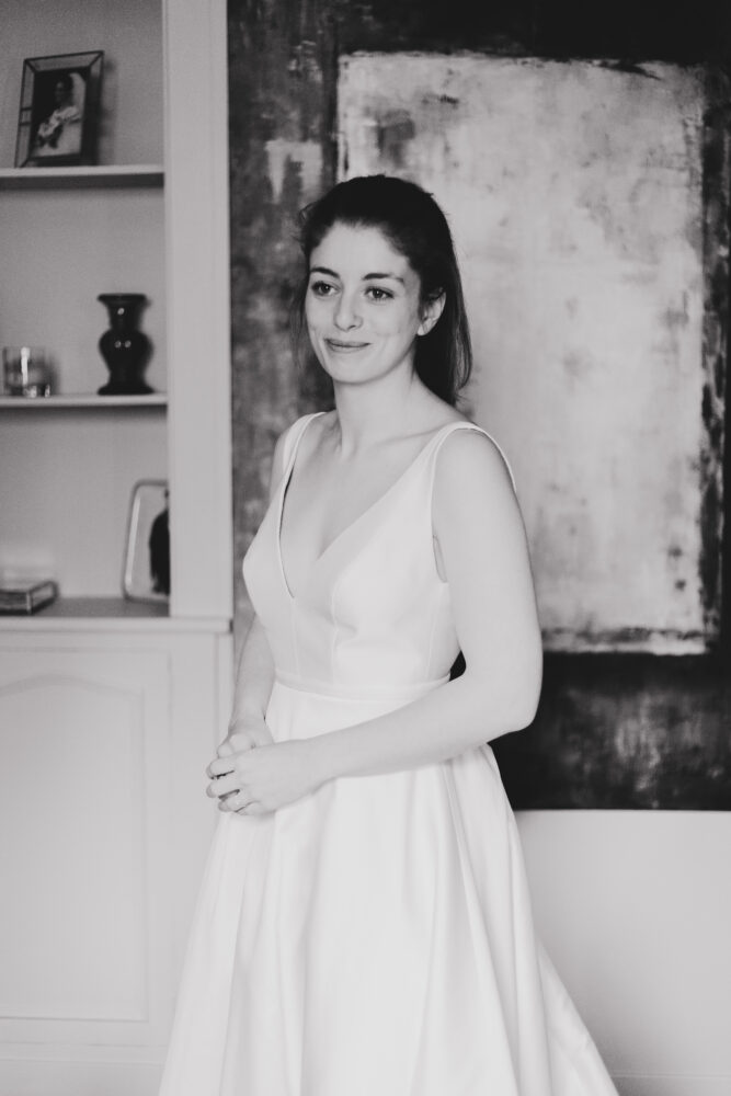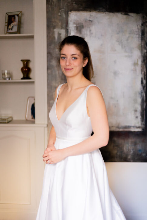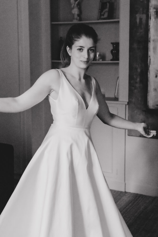 Robe en mikado de soie, avec un top en crêpe crinkle noué dans le dos. Voile simple en tulle fin.