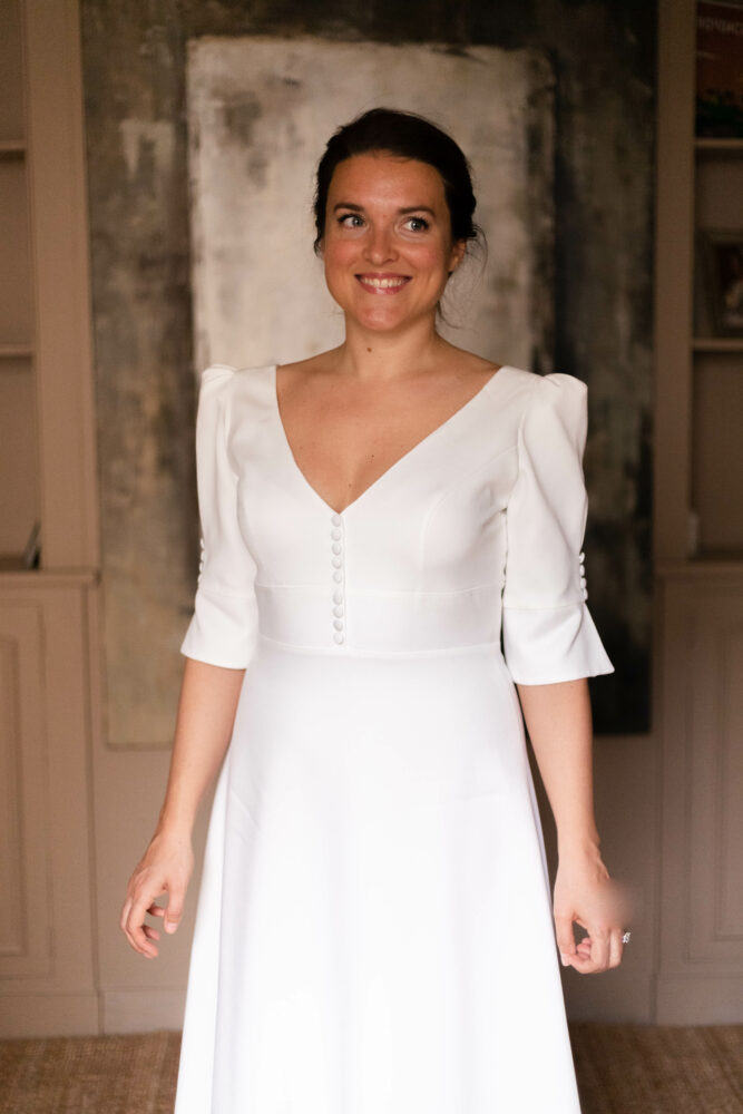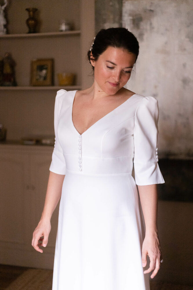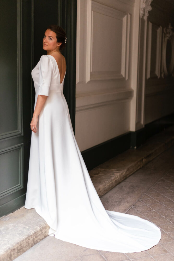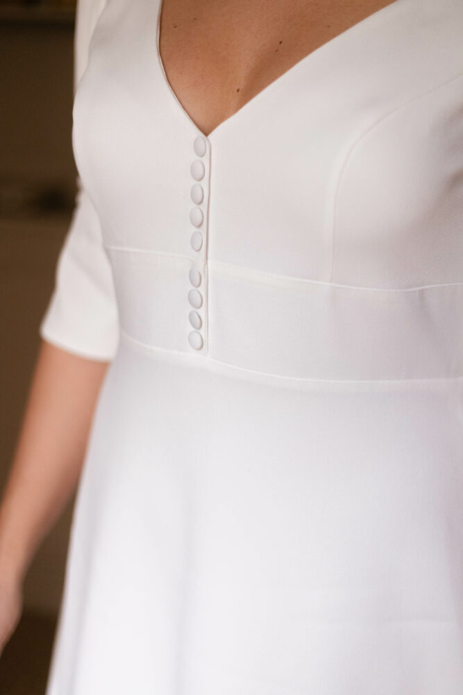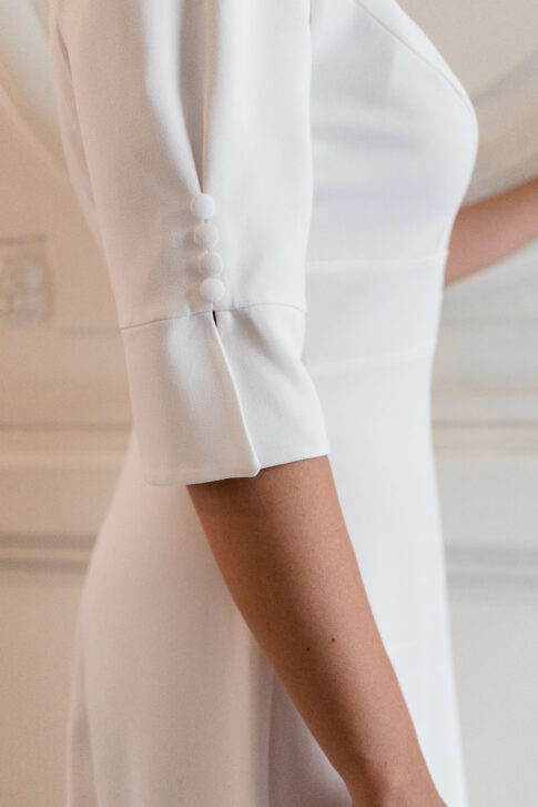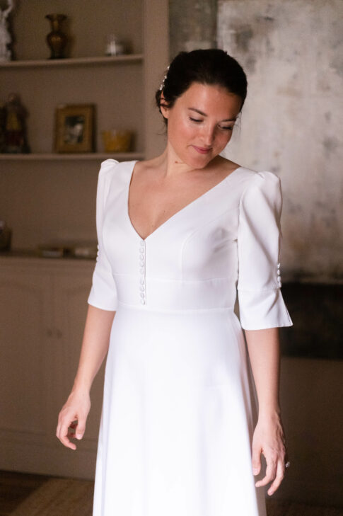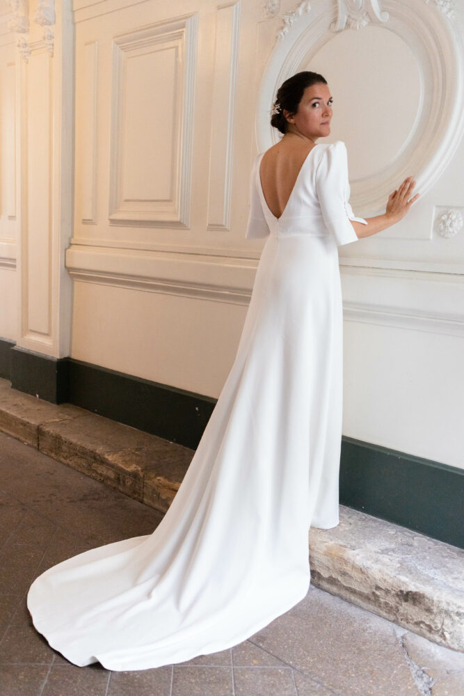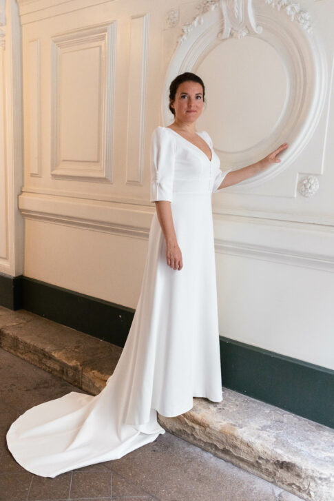 Robe en crêpe lourd, avec un top boutonné devant et une jupe trapèze avec une longue traine.