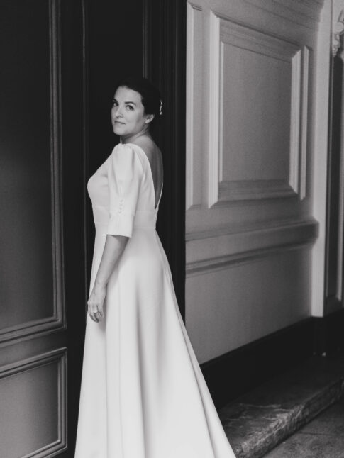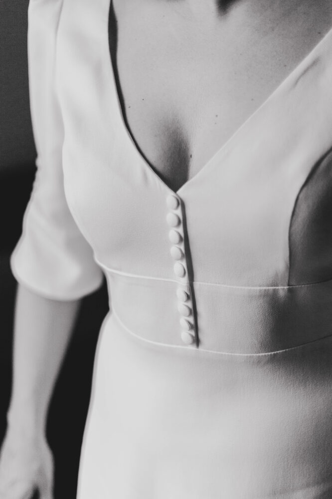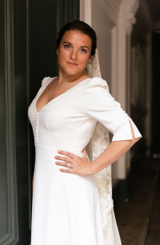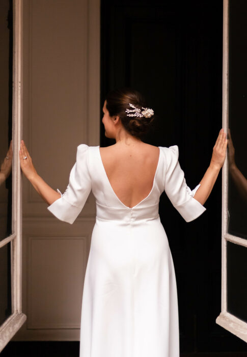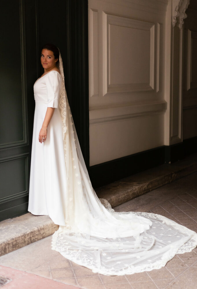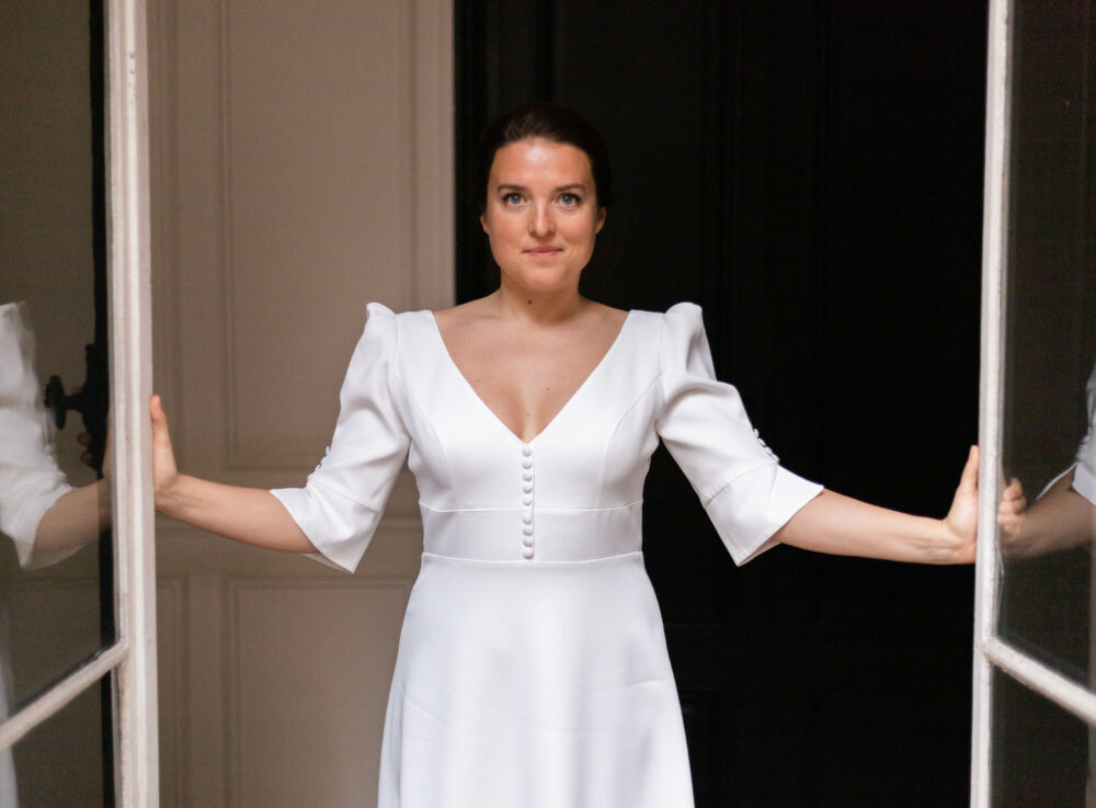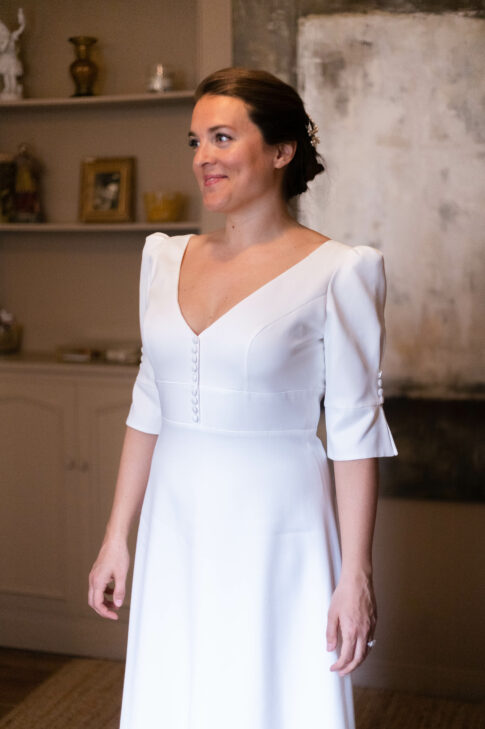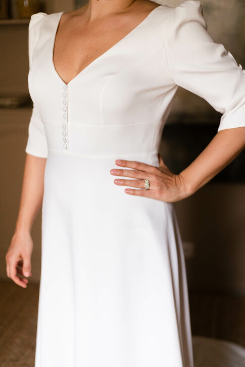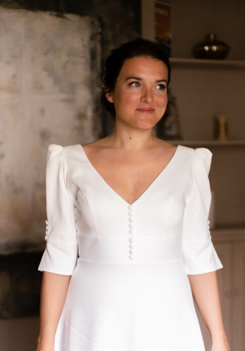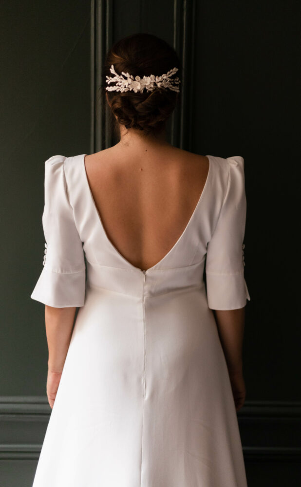 Robe en crêpe lourd, avec un top boutonné devant et une jupe trapèze avec une longue traine.