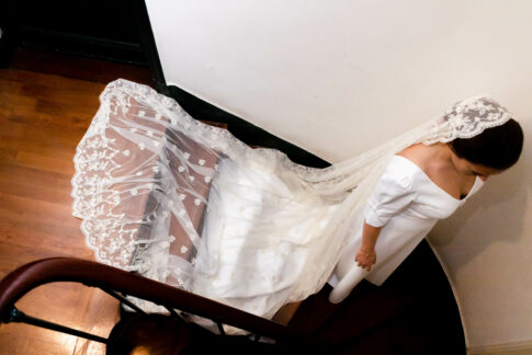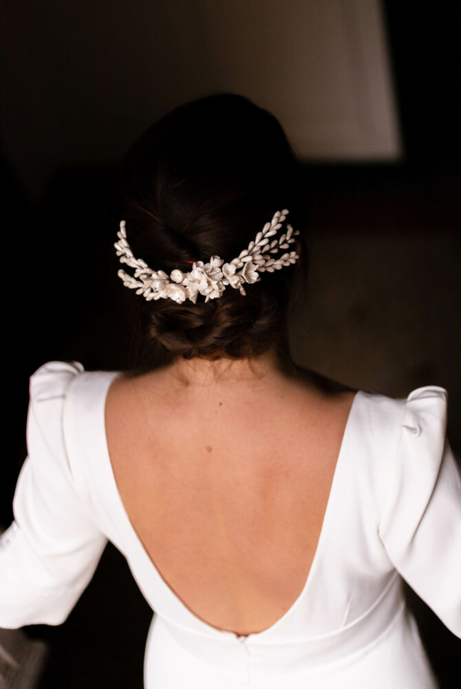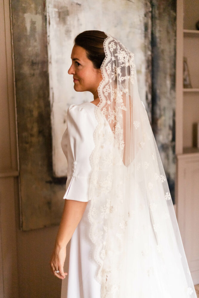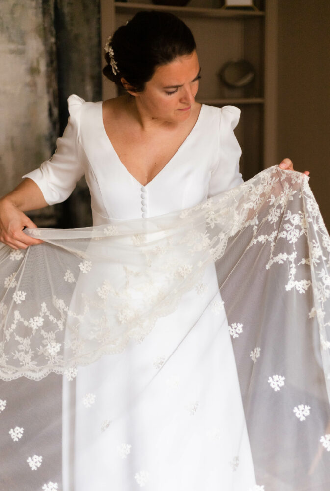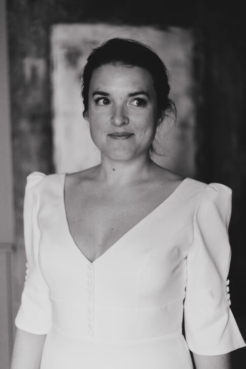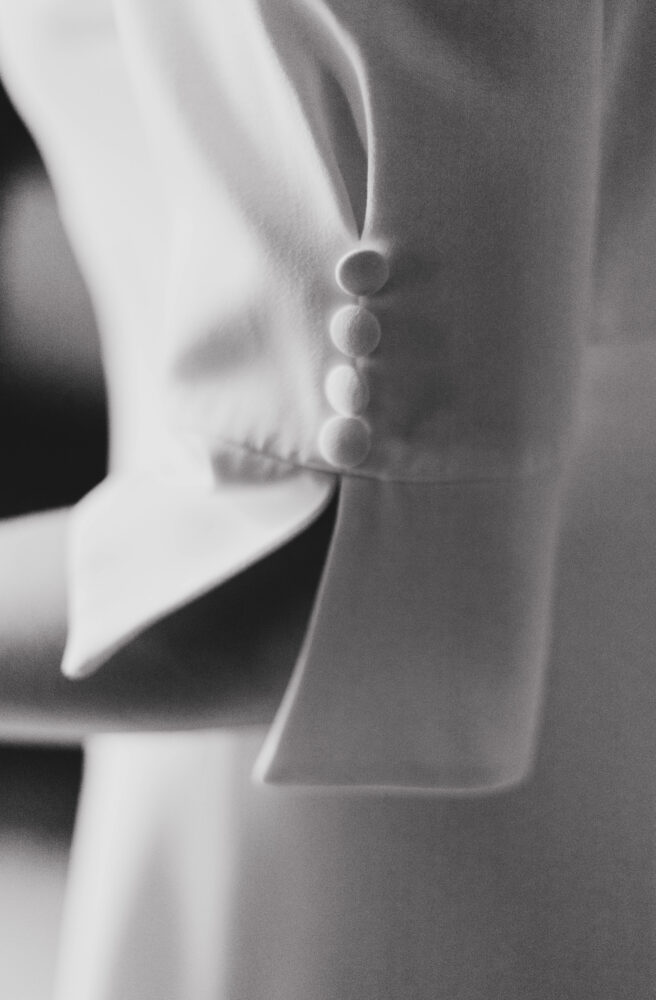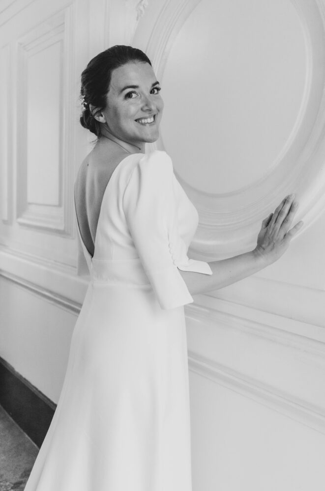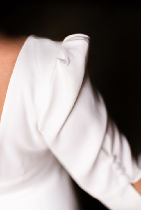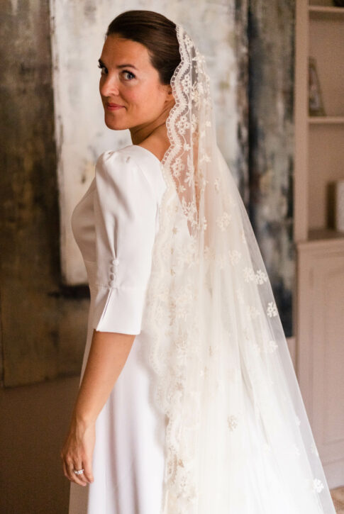 Robe en crêpe lourd, avec un top boutonné devant et une jupe trapèze avec une longue traine.