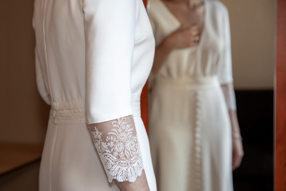 Ceinture et manches, rehaussés d’un galon de dentelle.