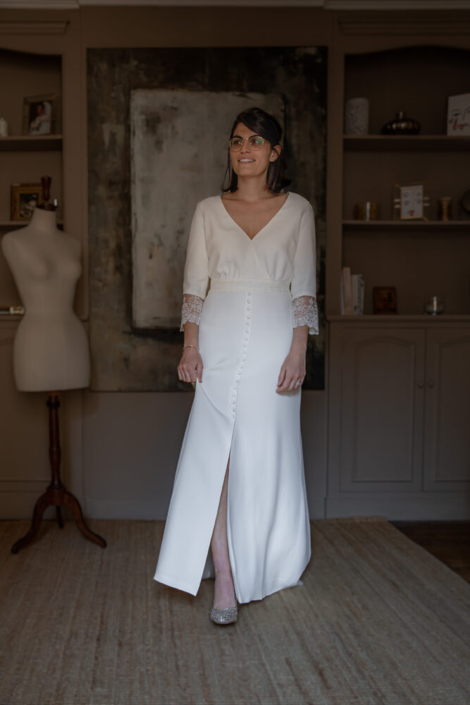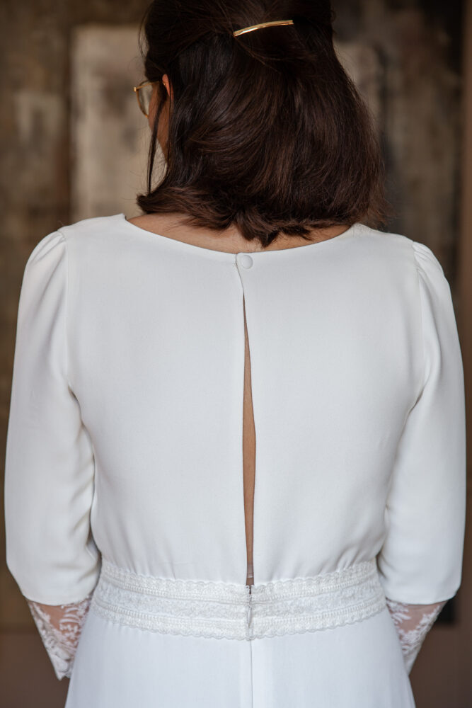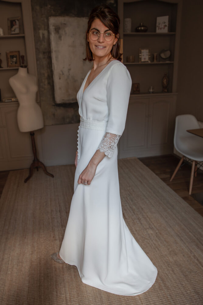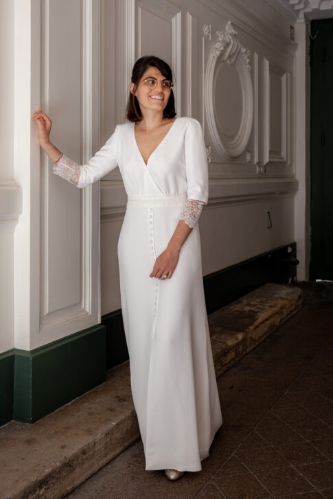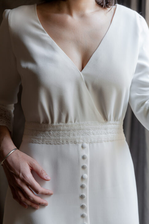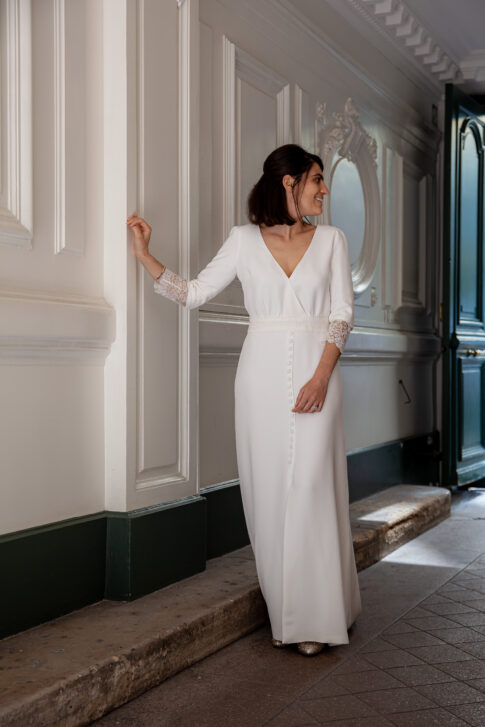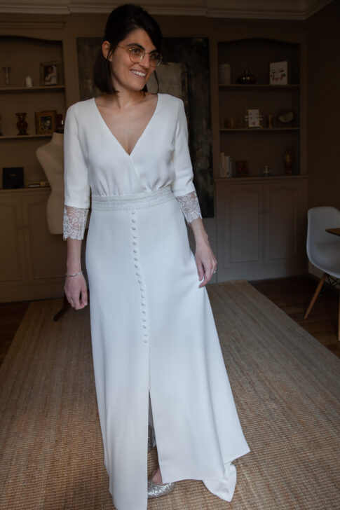 Robe manche longue en crêpe lourd, boutonnée devant et fendue dans le dos.