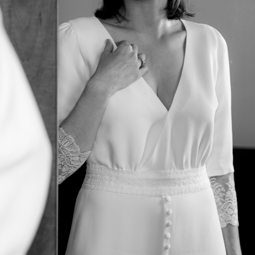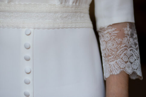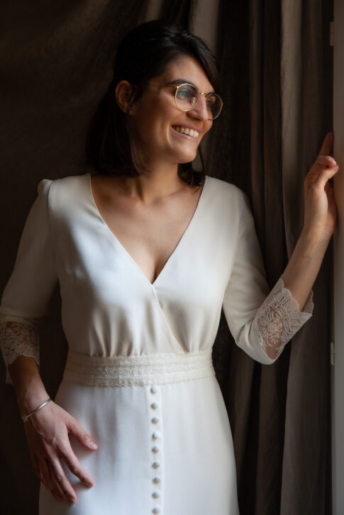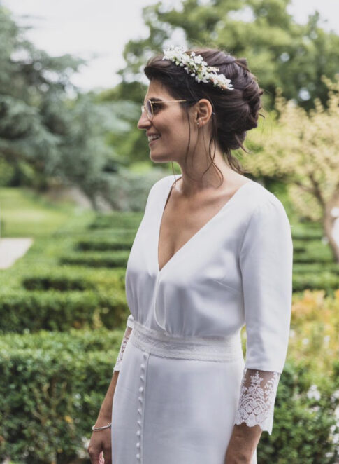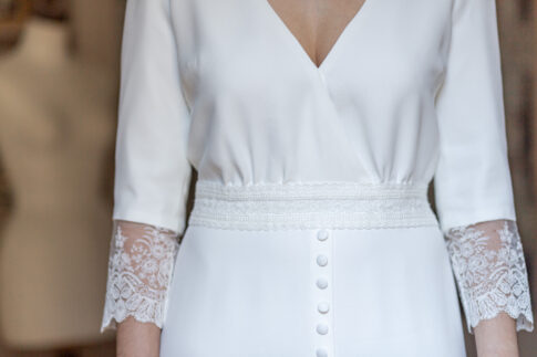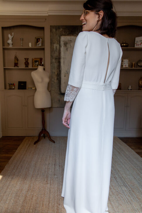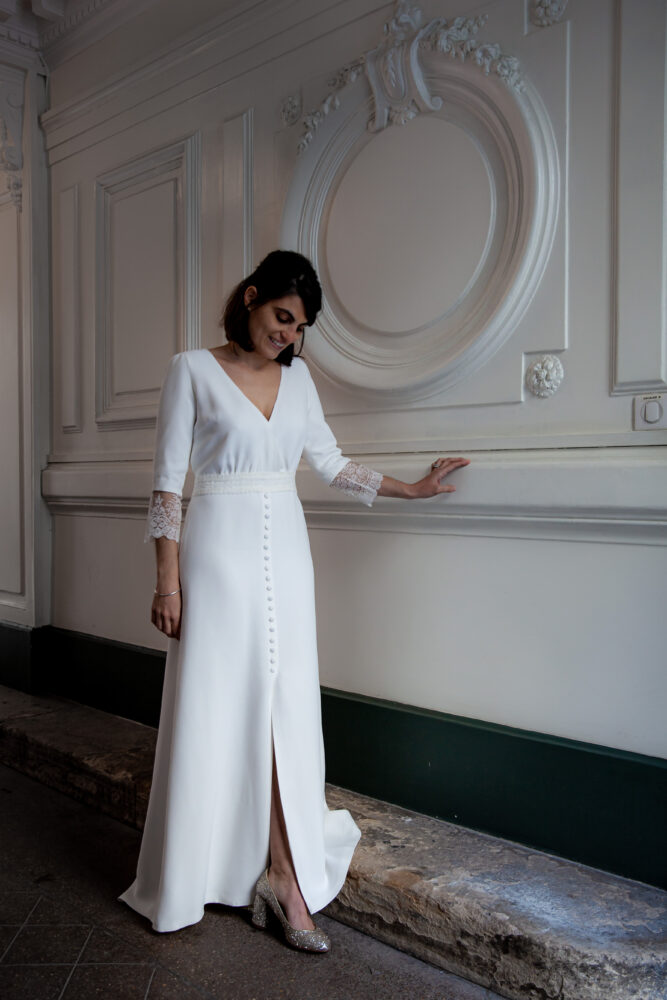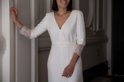 Robe manche longue en crêpe lourd, boutonnée devant et fendue dans le dos.
