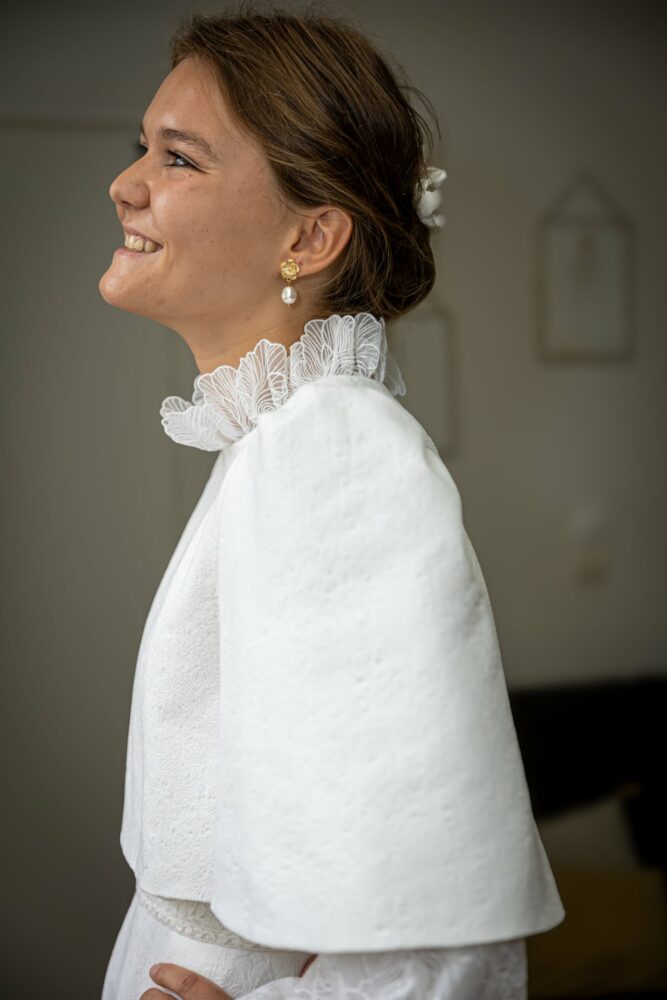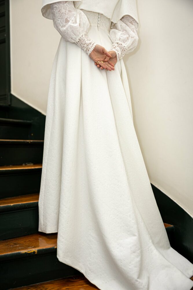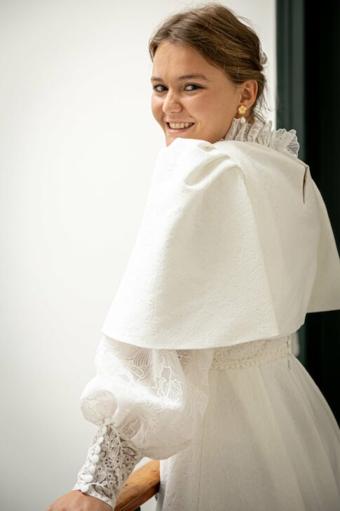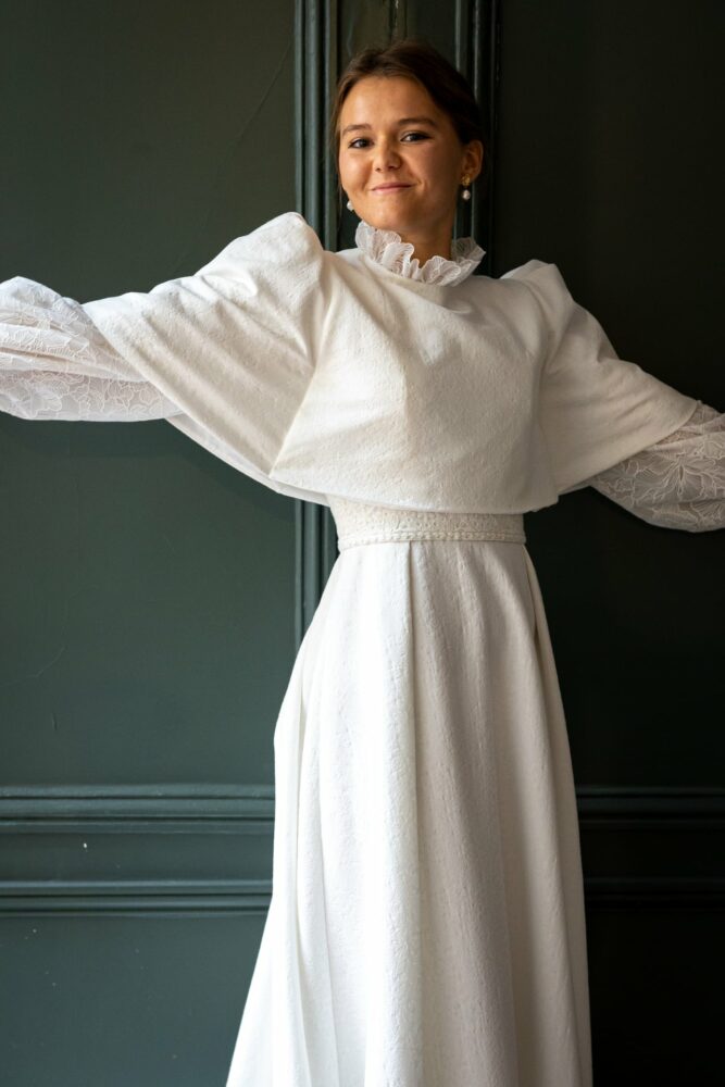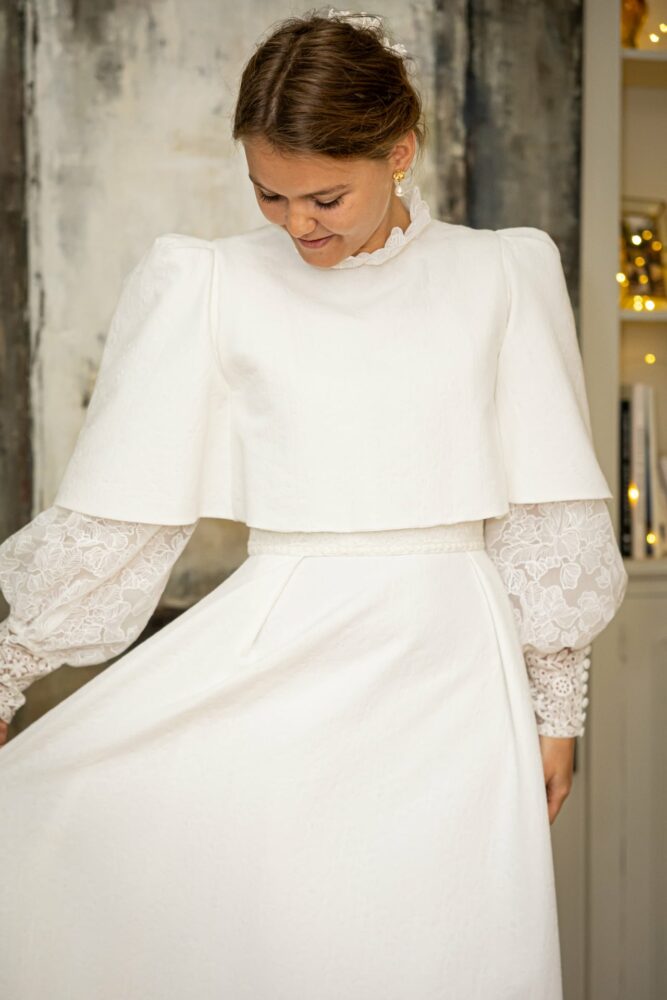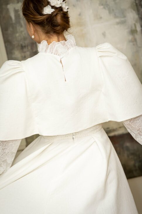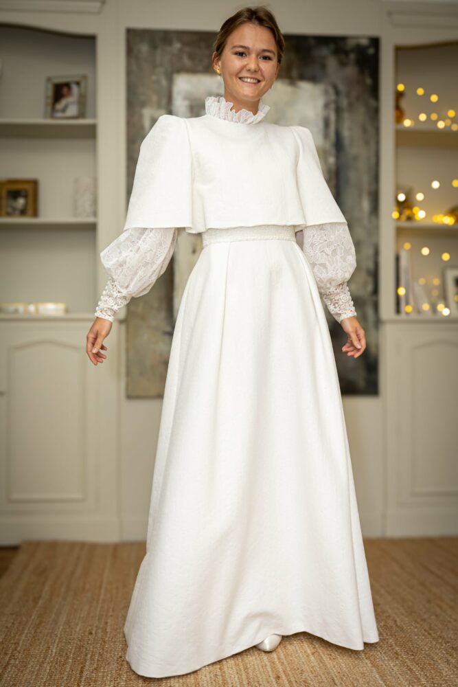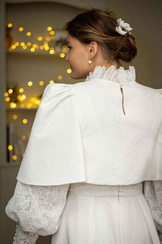 Robe en jacquard, avec des manches en tulle brodé doublées d’organza,  et des poignets resserrés assortis à la ceinture. Par dessus, petite cape courte adaptée parfaitement à la coupe de la robe.
