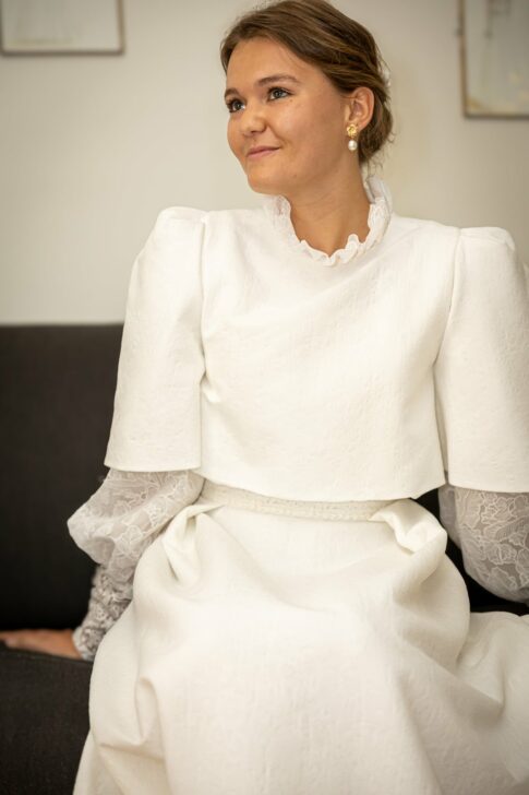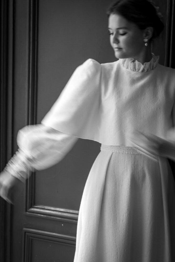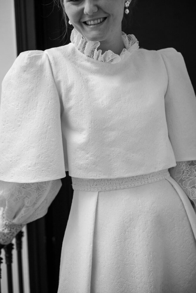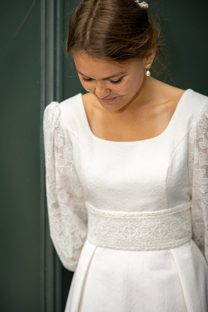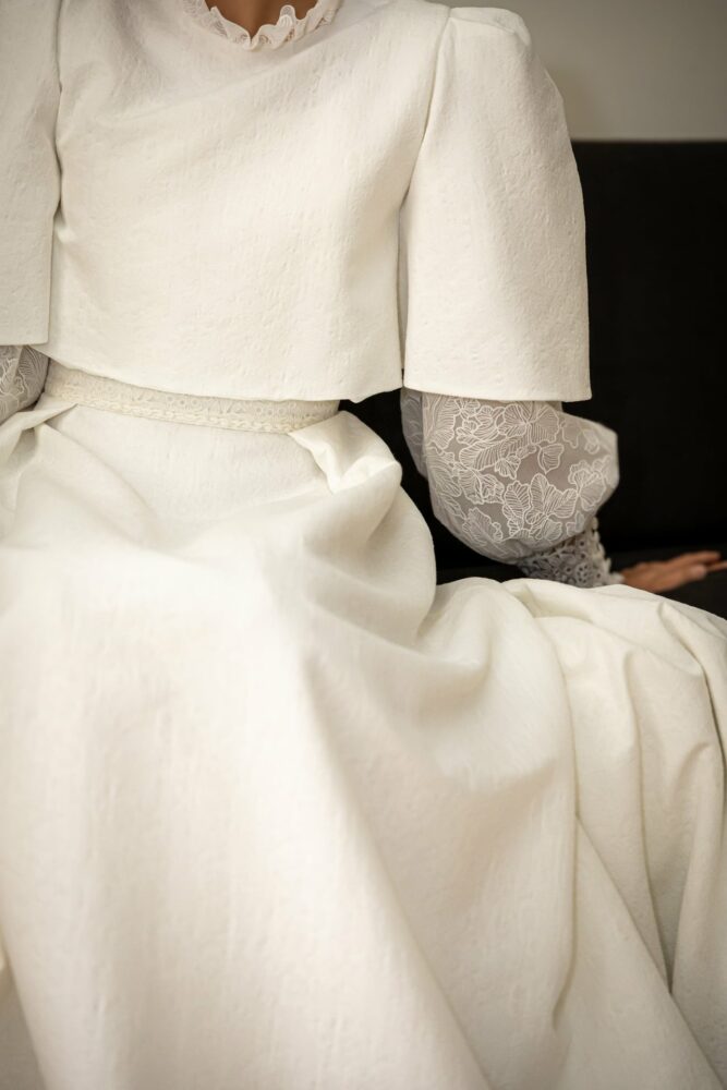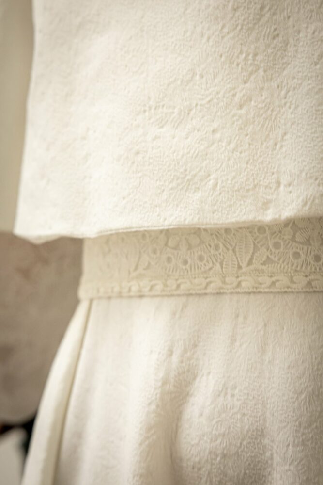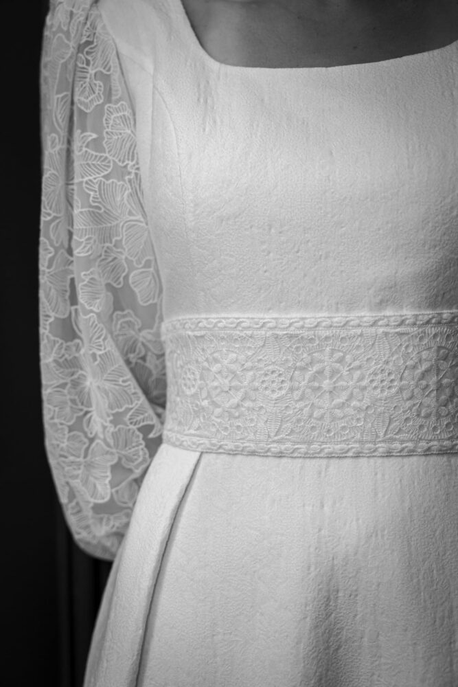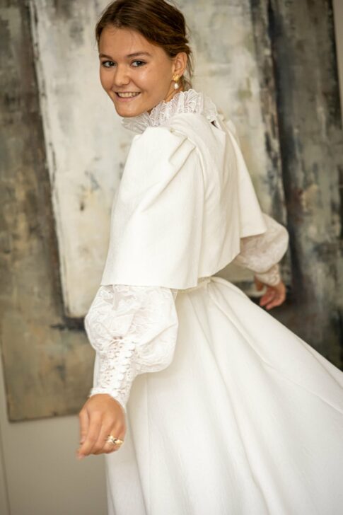 Robe en jacquard, avec des manches en tulle brodé doublées d’organza,  et des poignets resserrés assortis à la ceinture. Par dessus, petite cape courte adaptée parfaitement à la coupe de la robe.