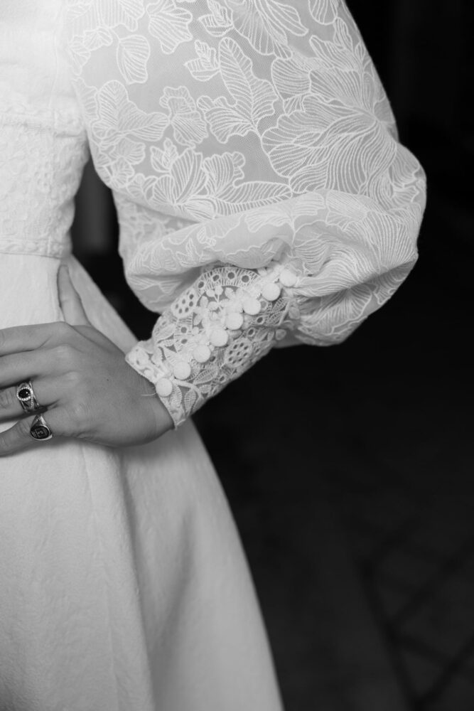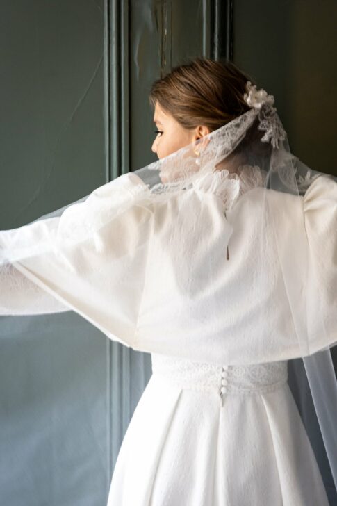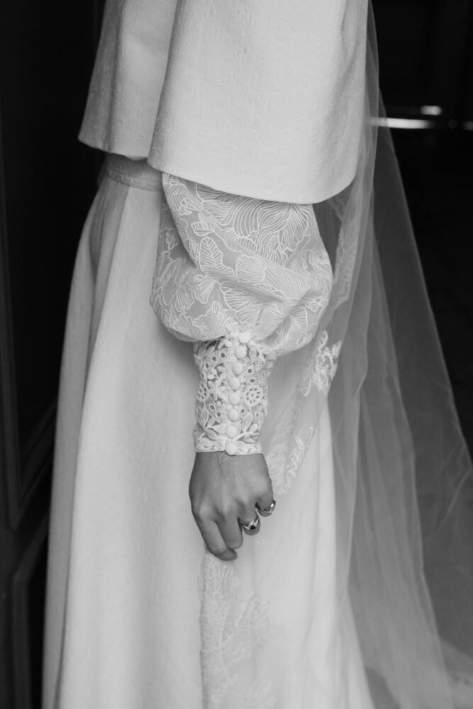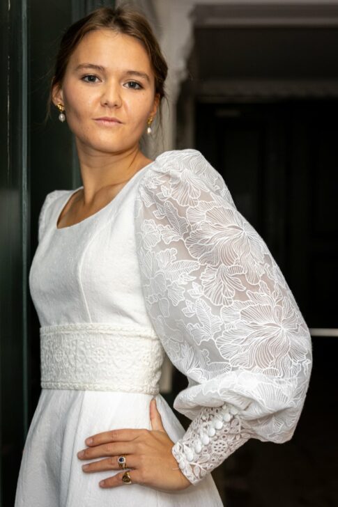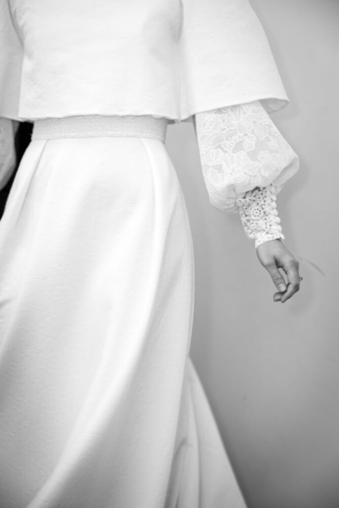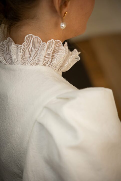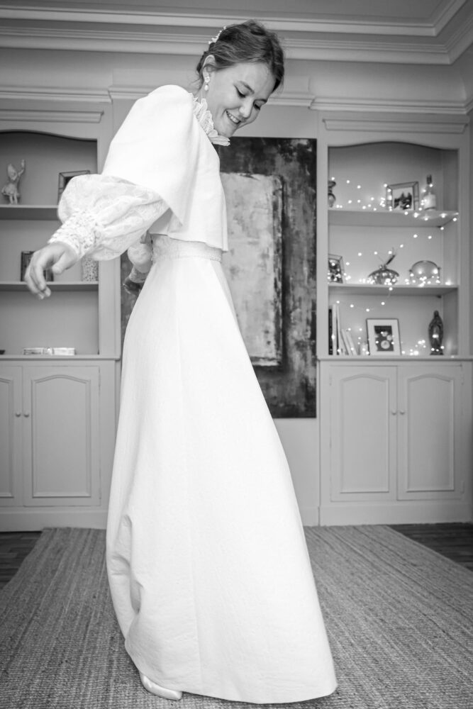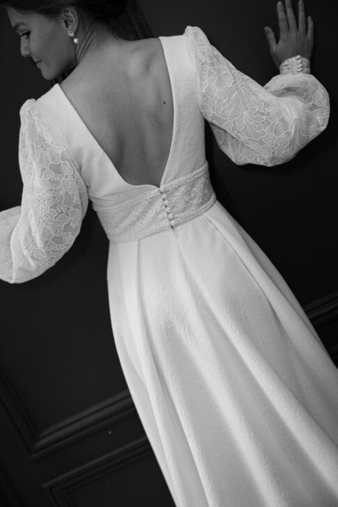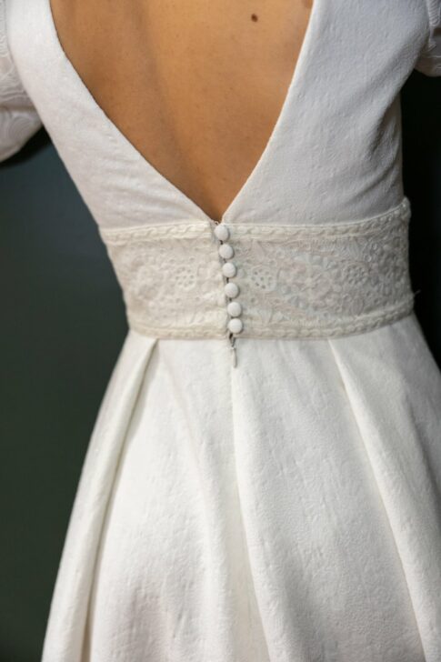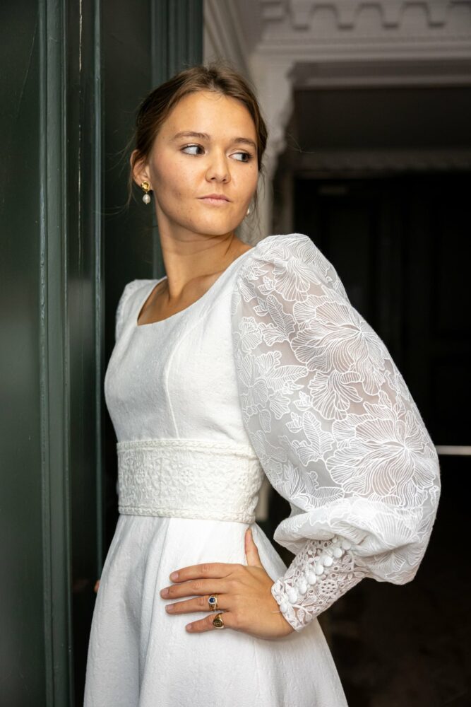 Robe en jacquard, avec des manches en tulle brodé doublées d’organza,  et des poignets resserrés assortis à la ceinture. Par dessus, petite cape courte adaptée parfaitement à la coupe de la robe.