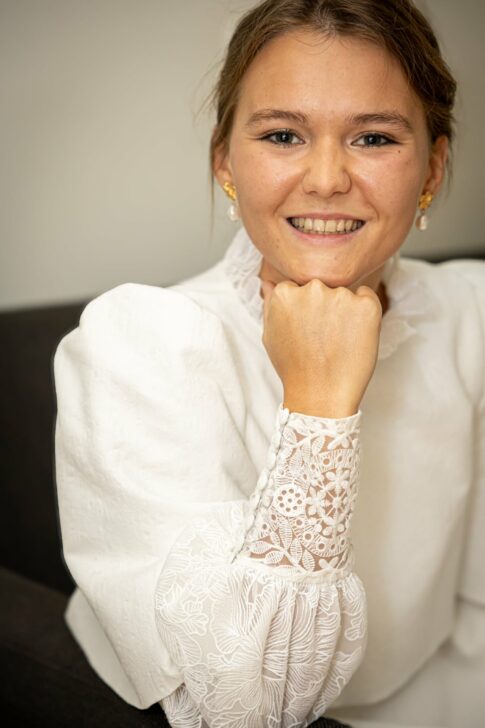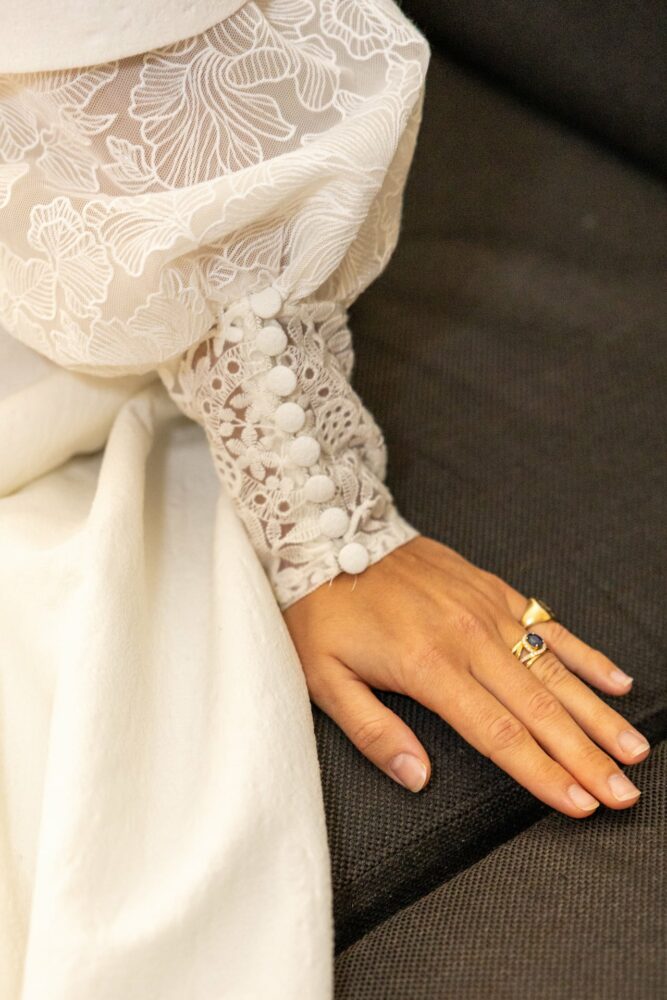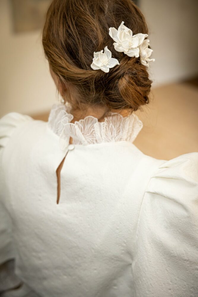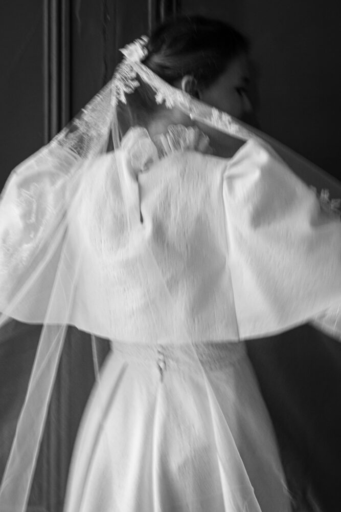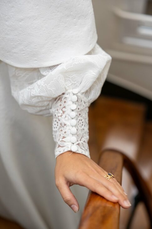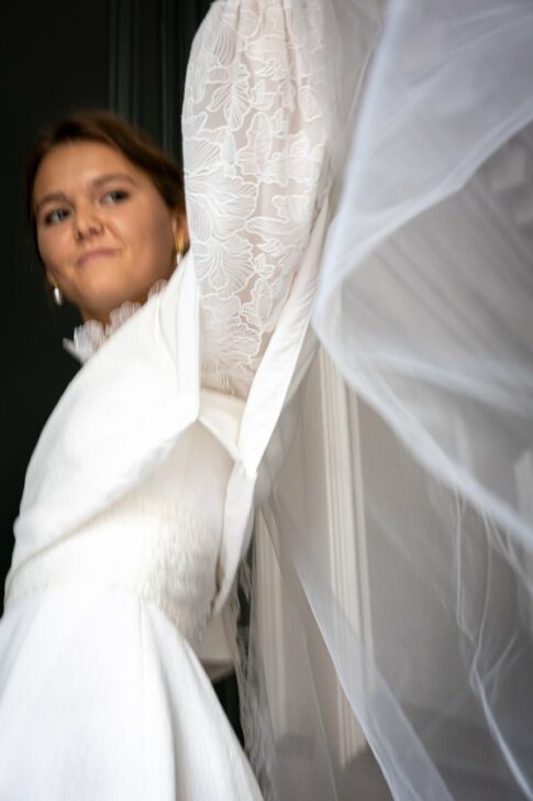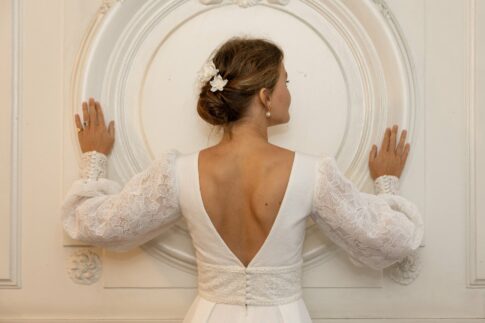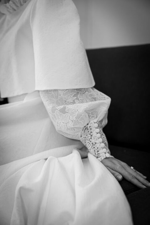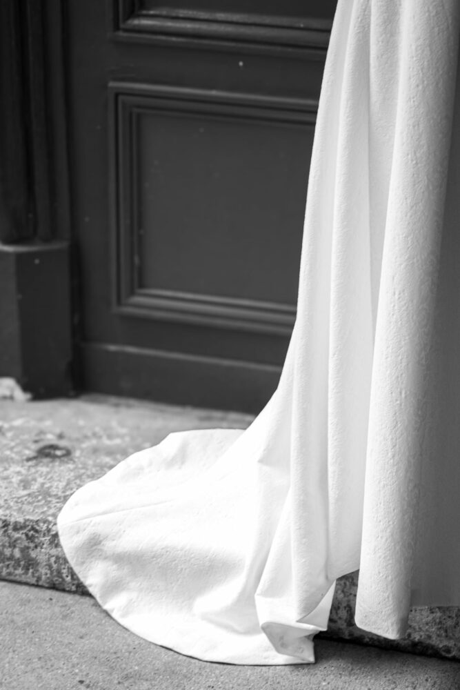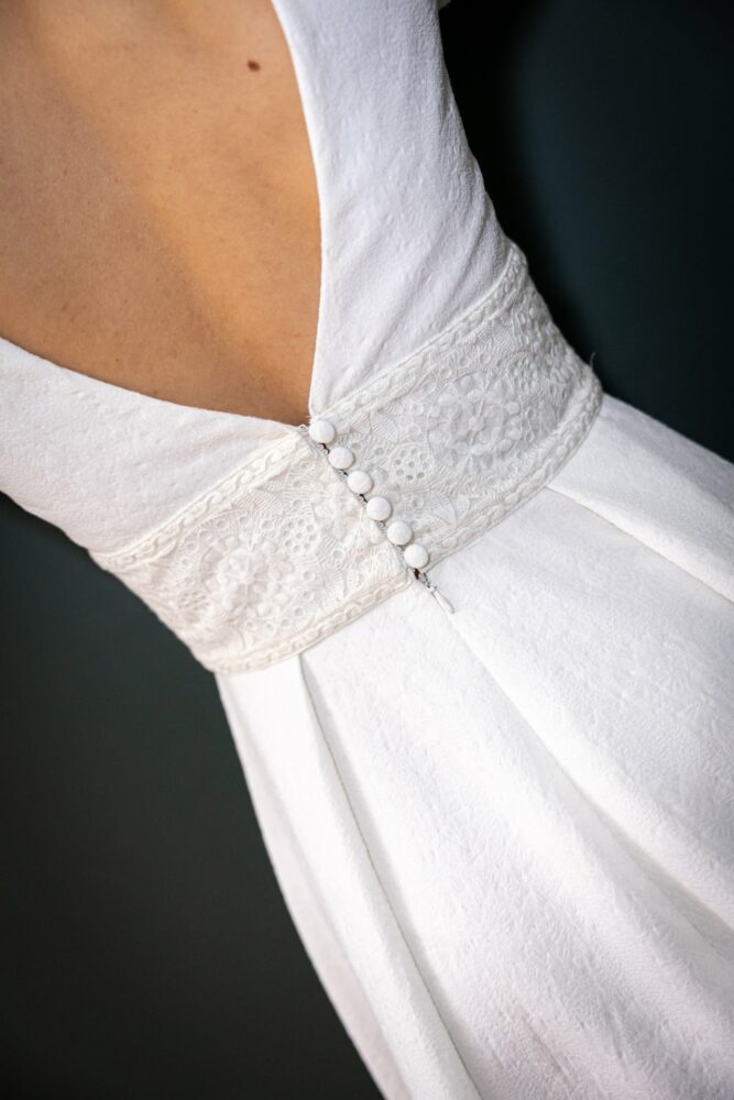 Robe en jacquard, avec des manches en tulle brodé doublées d’organza,  et des poignets resserrés assortis à la ceinture. Par dessus, petite cape courte adaptée parfaitement à la coupe de la robe.