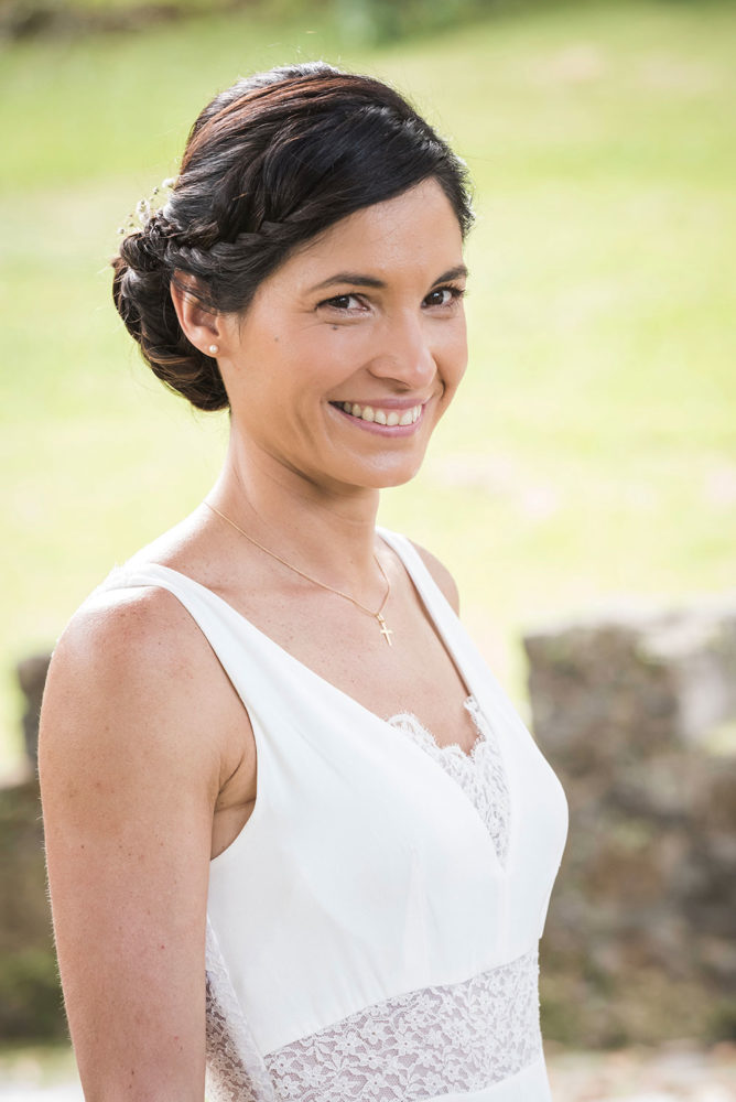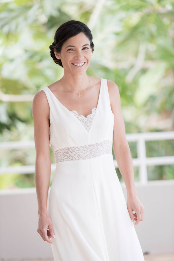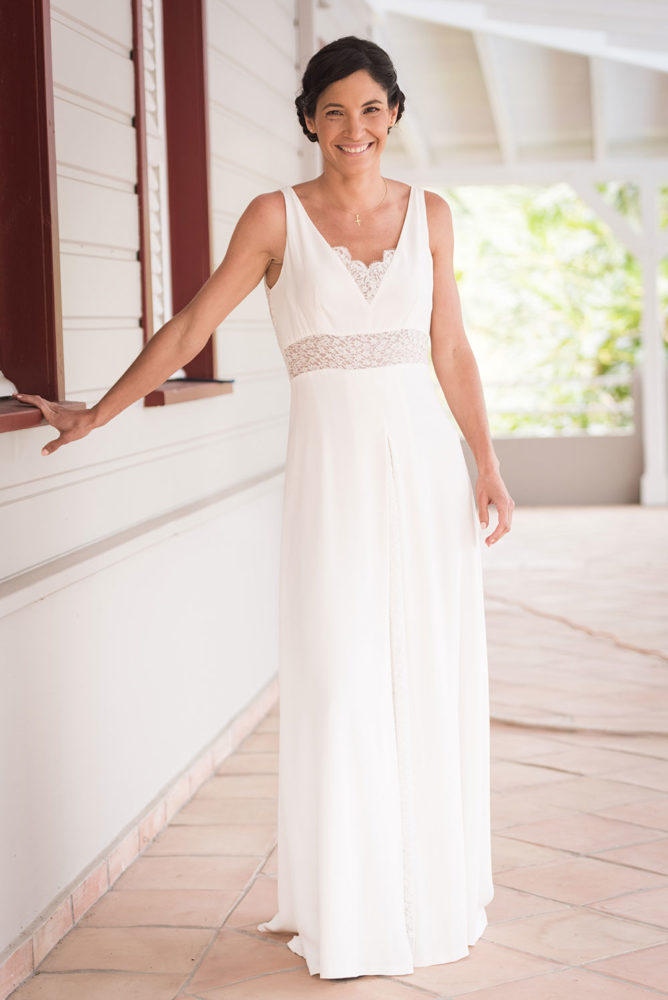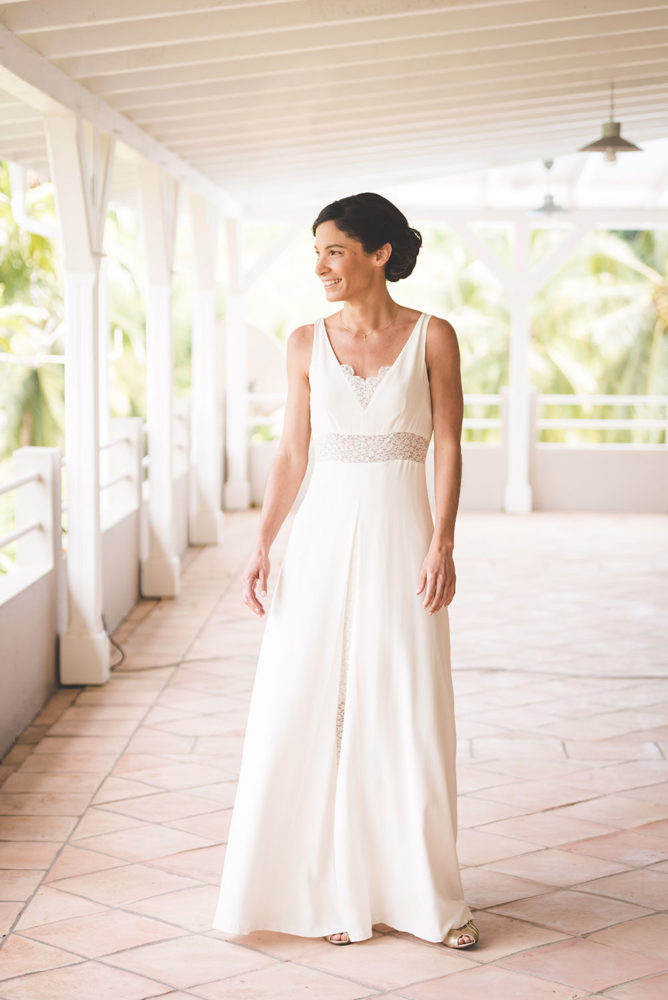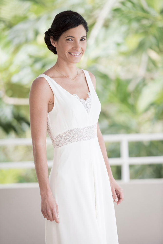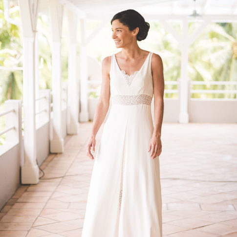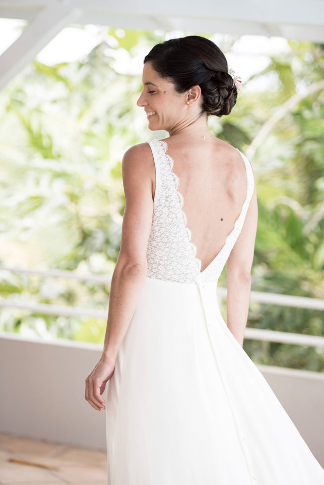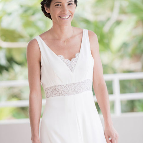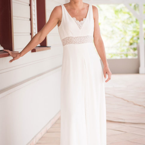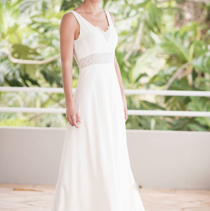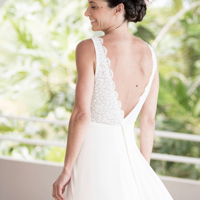Robe en crêpe de soie, dentelle de Calais « mille fleurs », jupe avec pli creux, boutons perles au dos