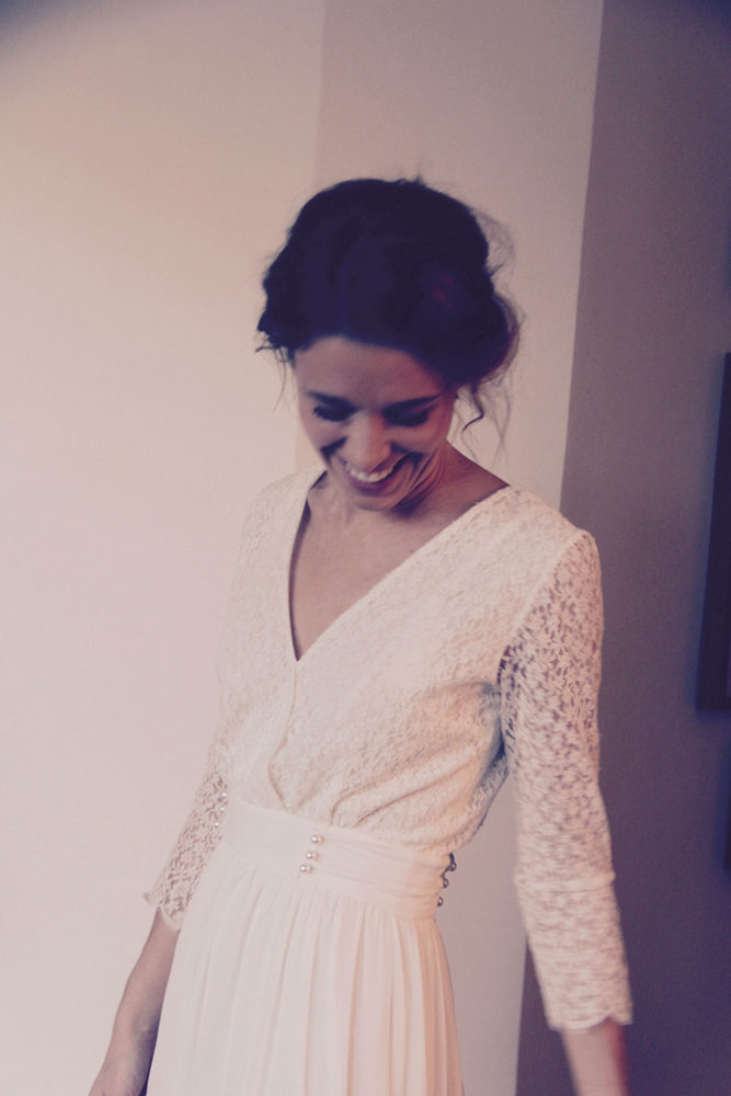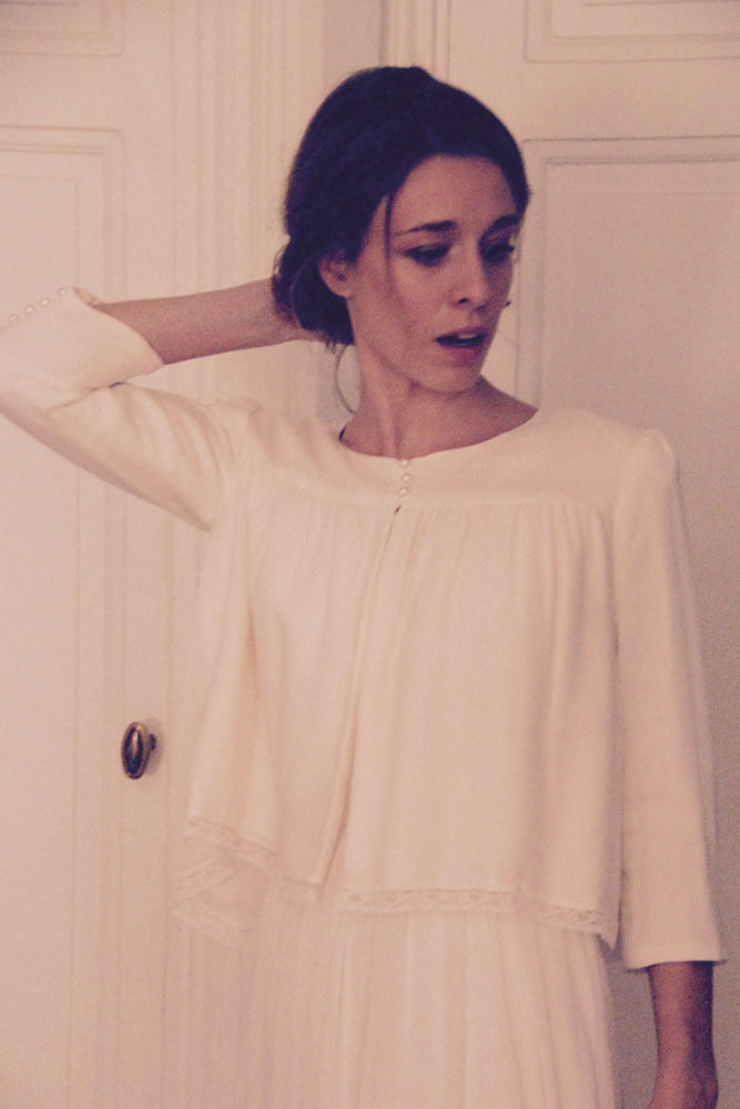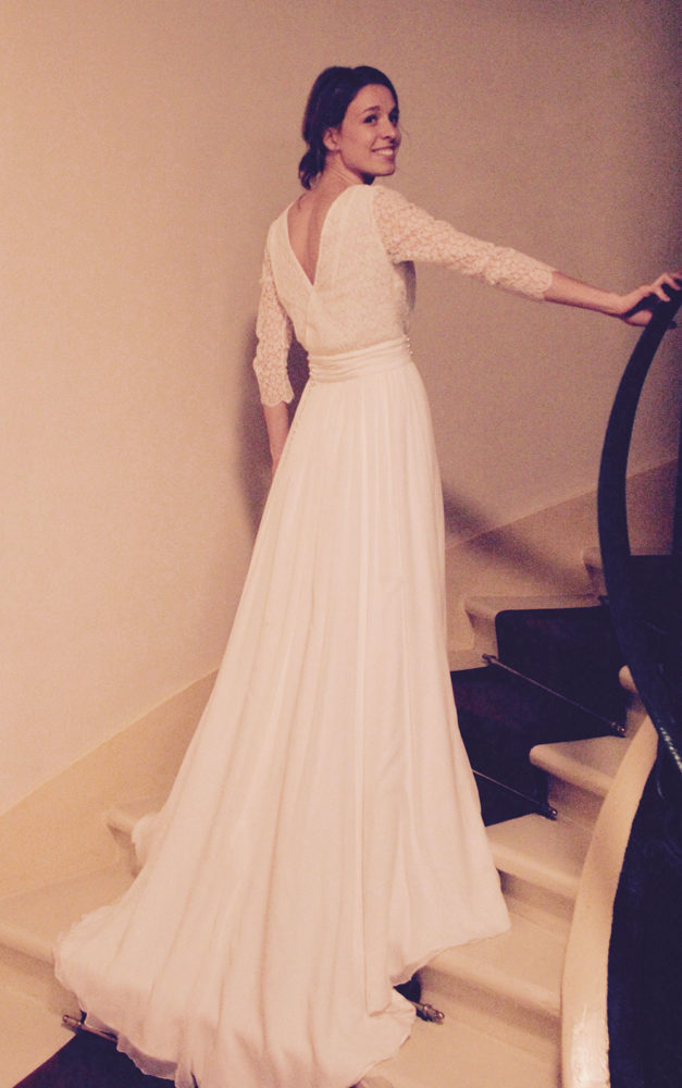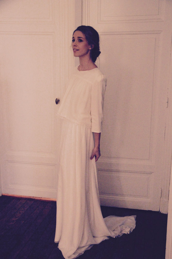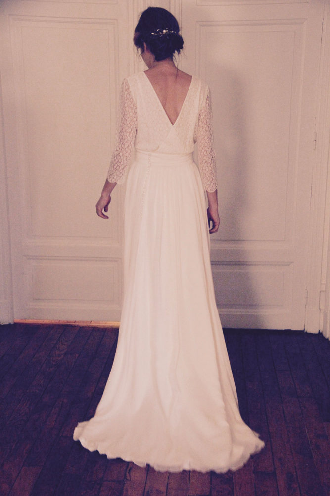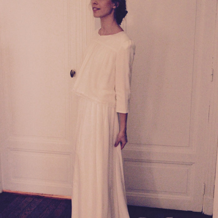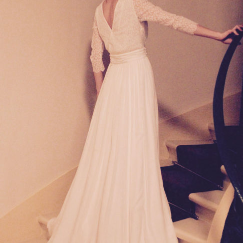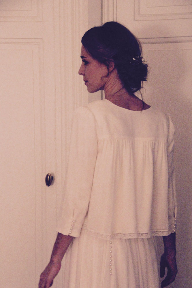 Robe en crêpe de soie, top en dentelle de Calais « mille fleurs », jupe en mousseline de soie, boutons perles