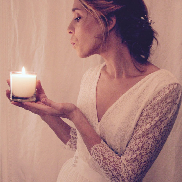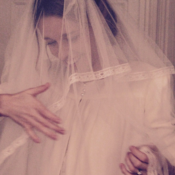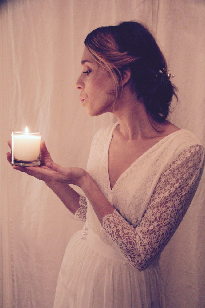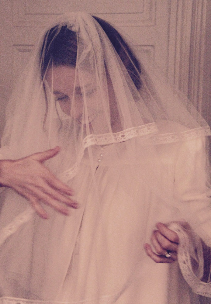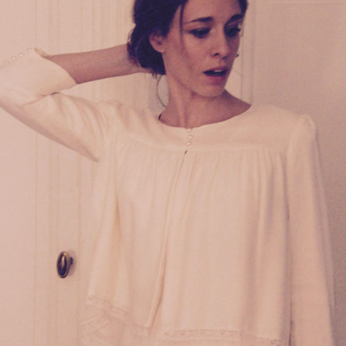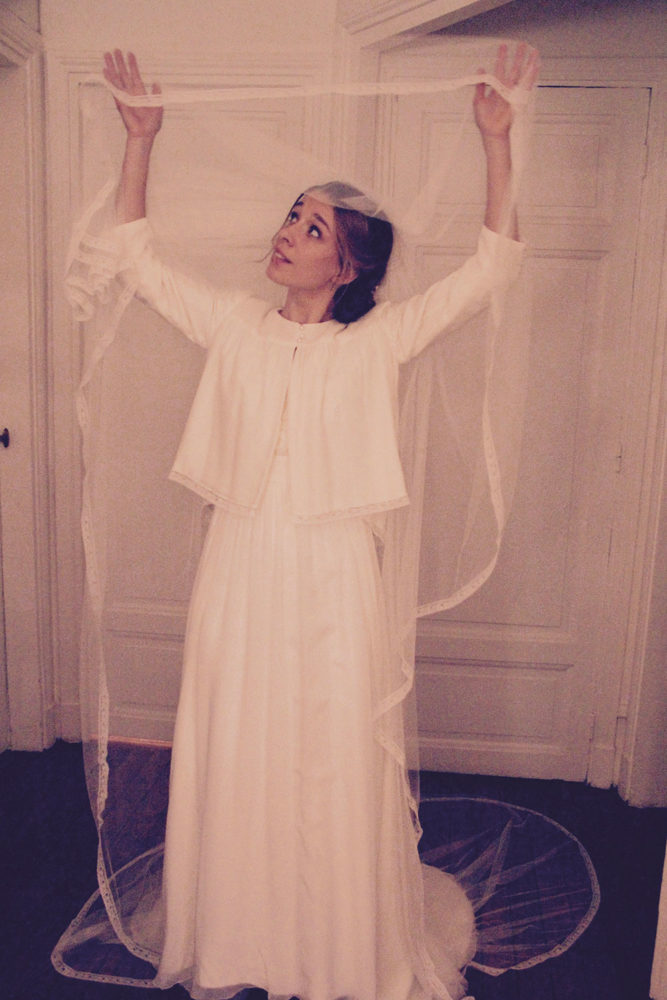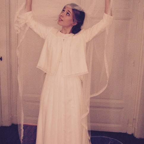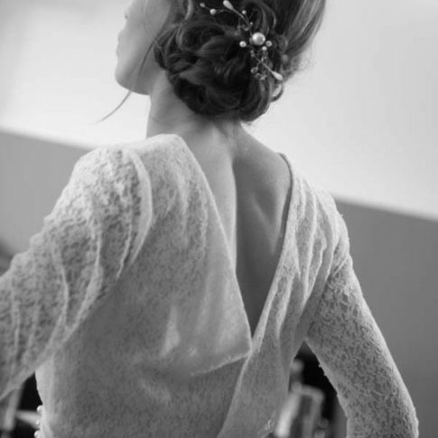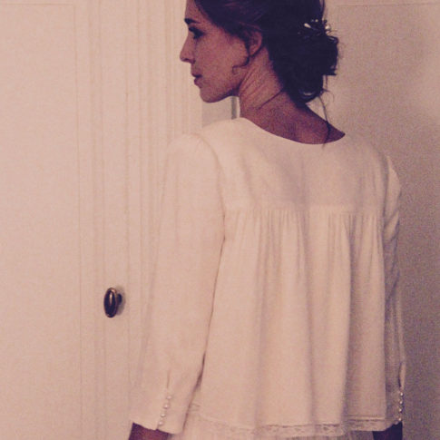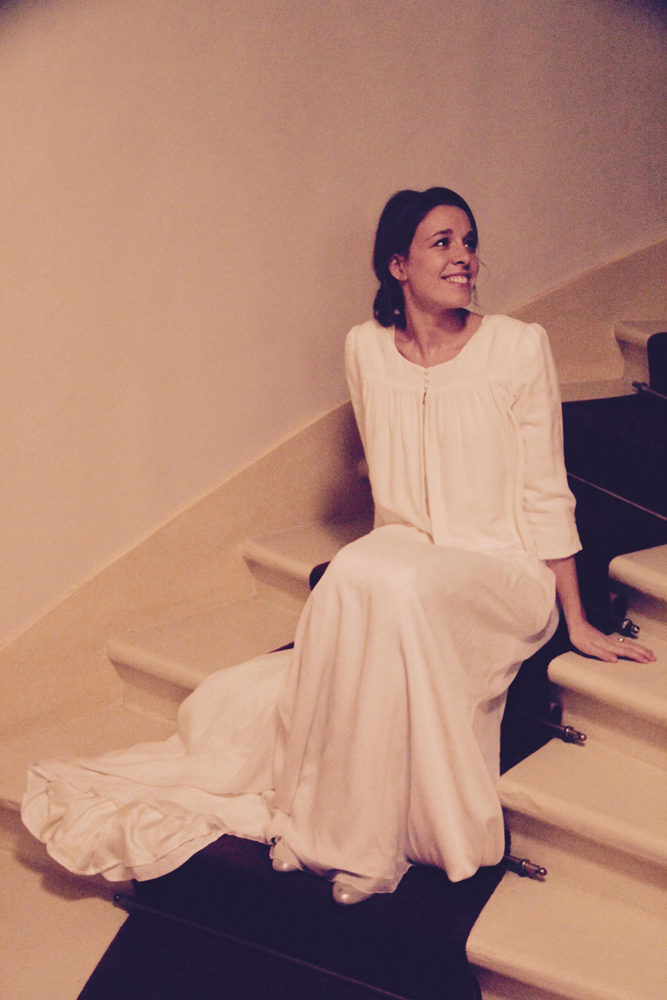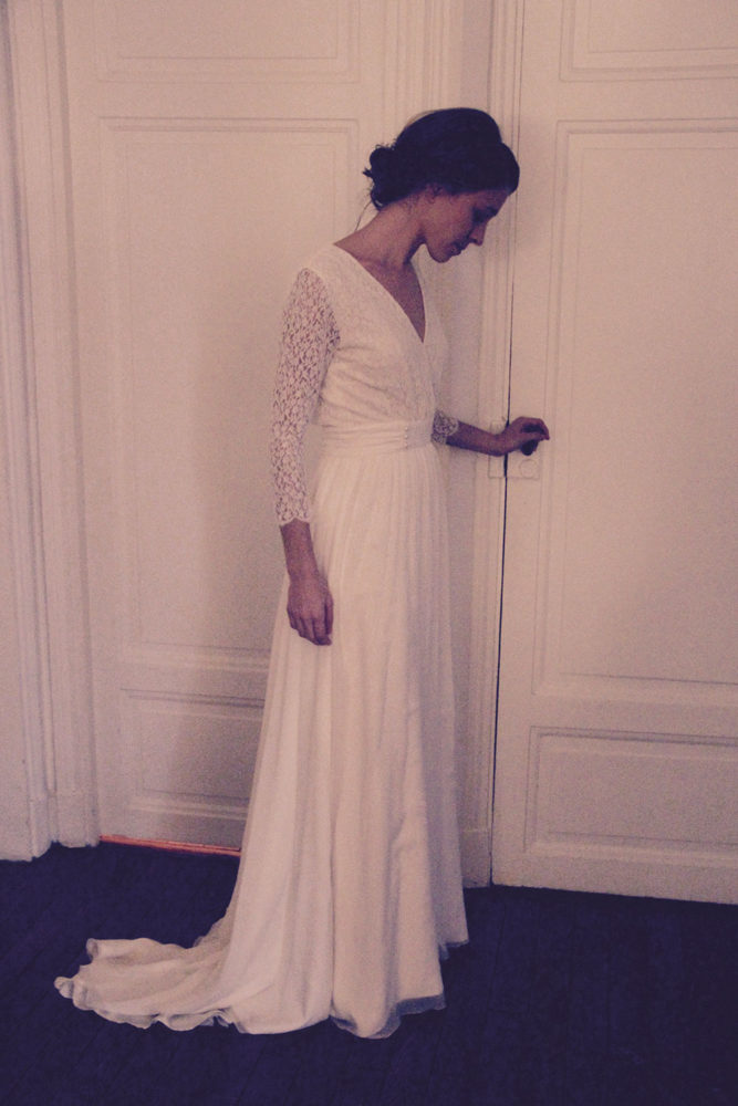 Robe en crêpe de soie, top en dentelle de Calais « mille fleurs », jupe en mousseline de soie, boutons perles