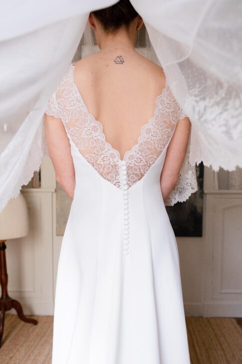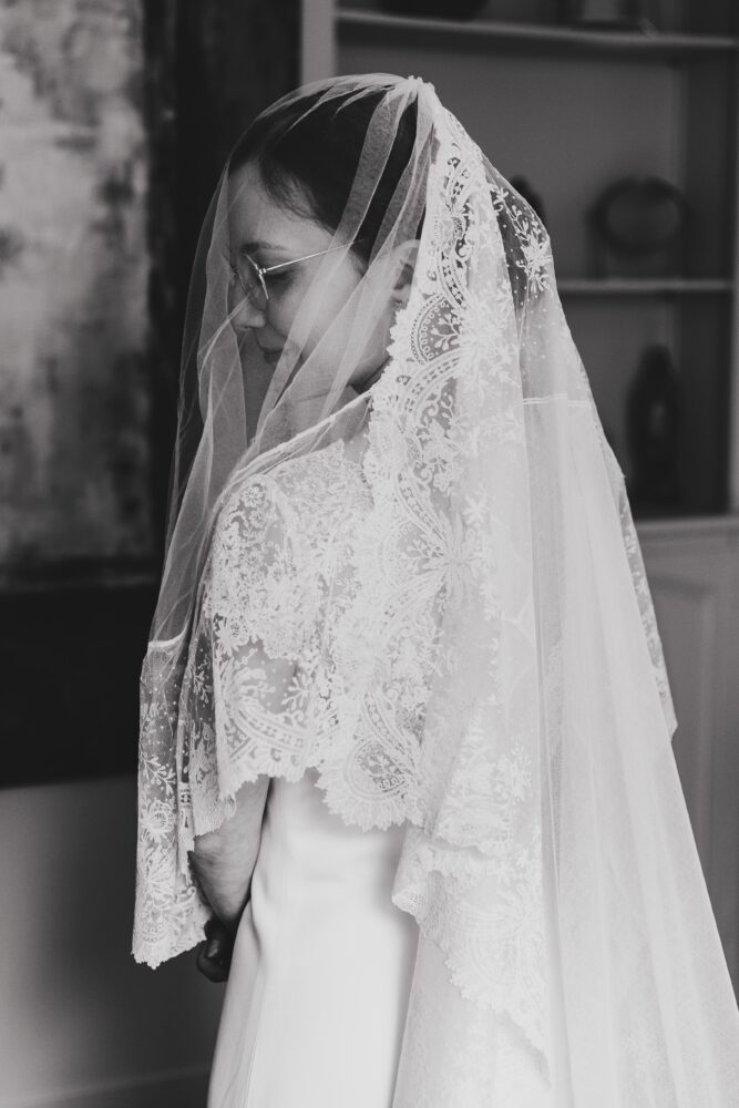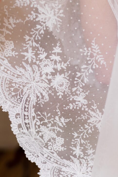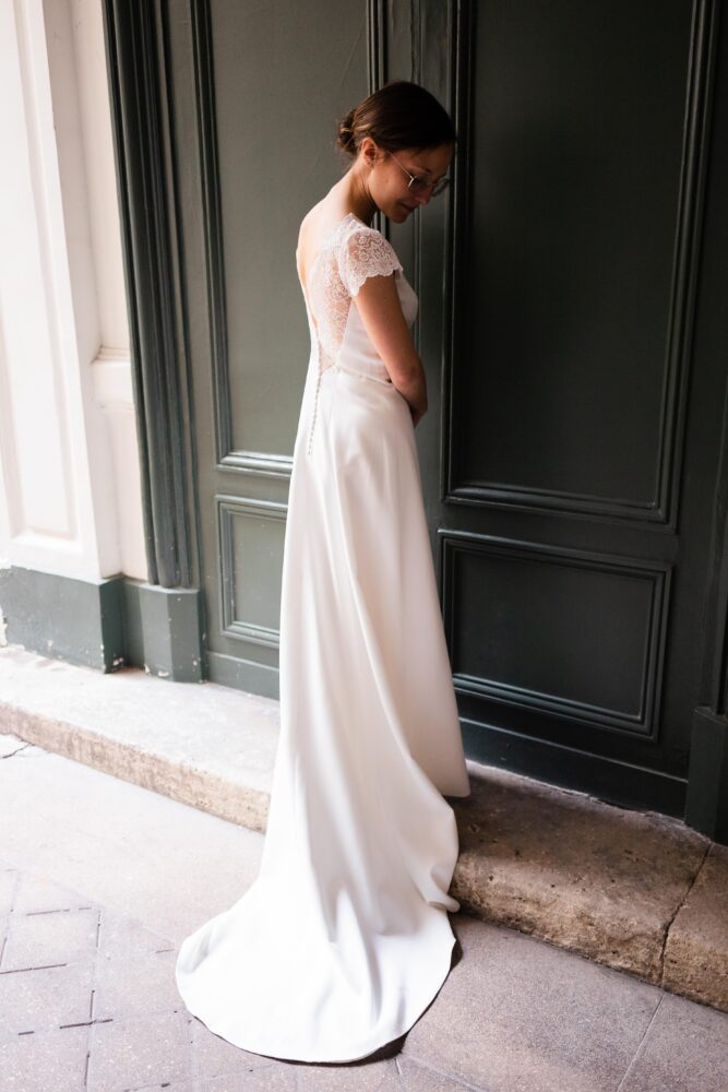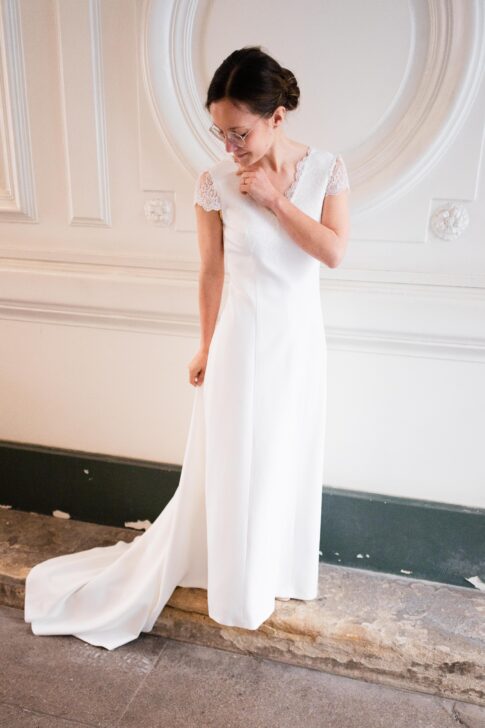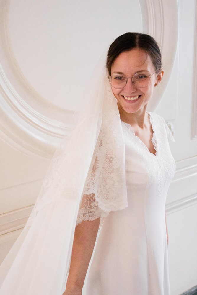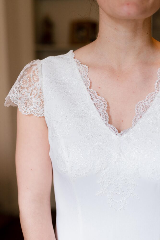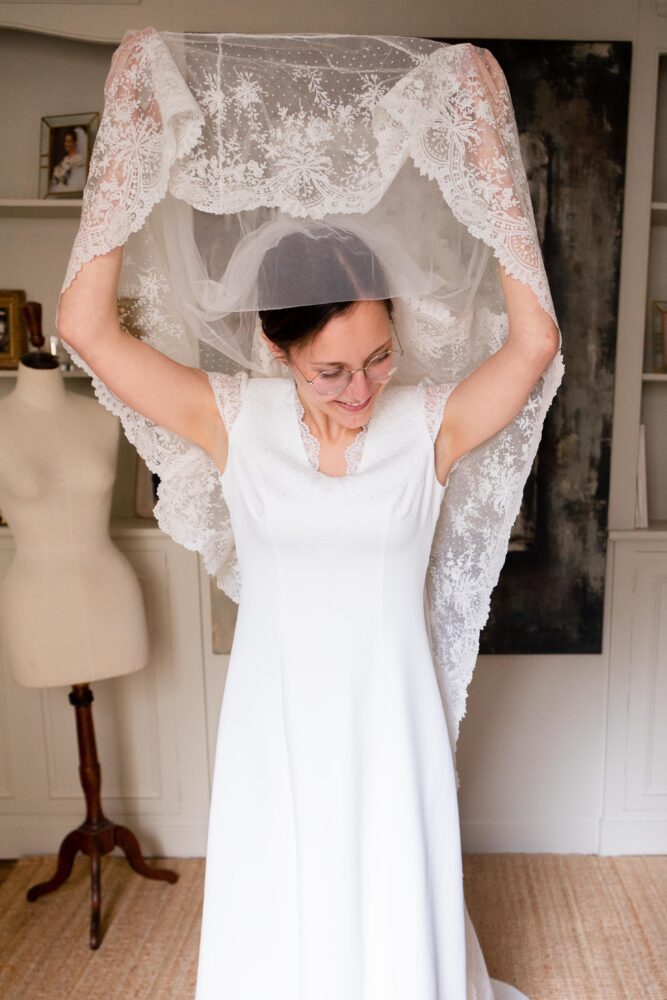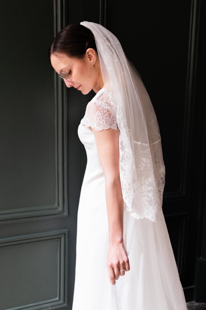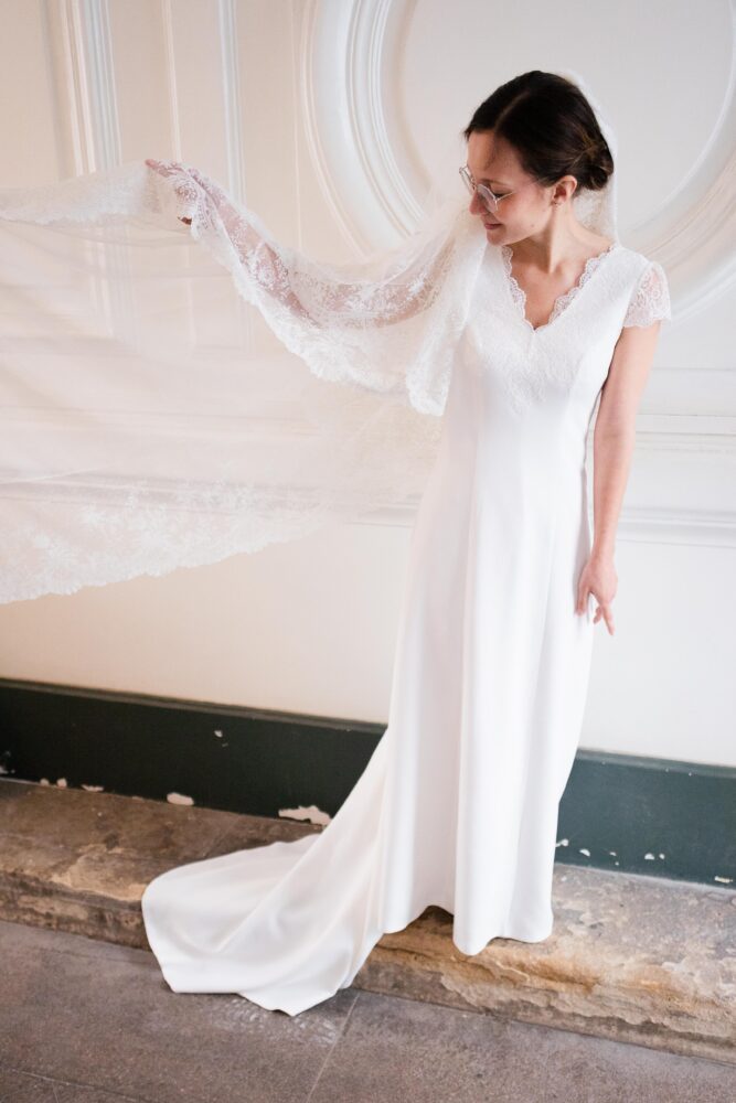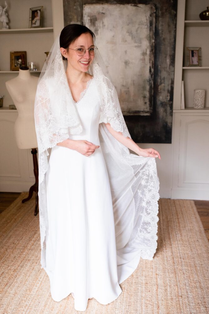 Robe en crêpe lourd, rehaussé d’une dentelle en tulle brodé. Voile de famille.