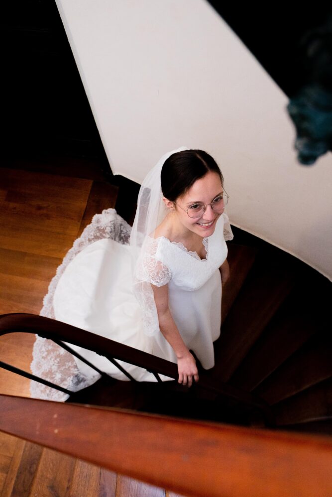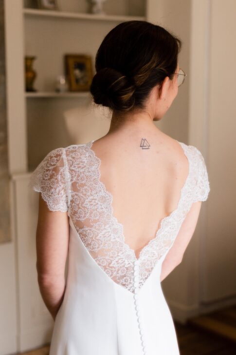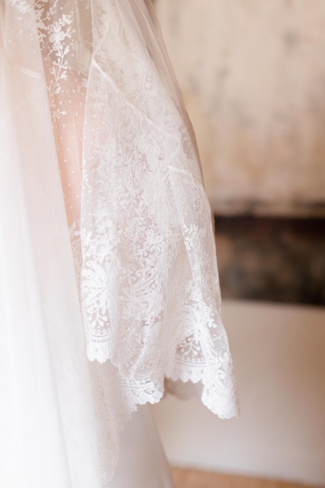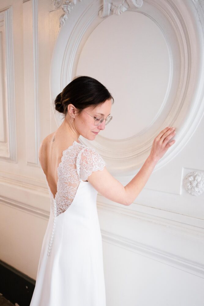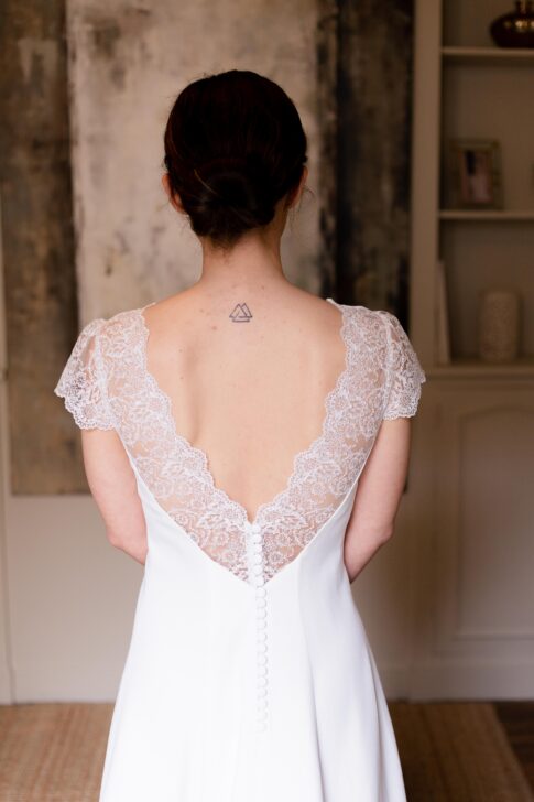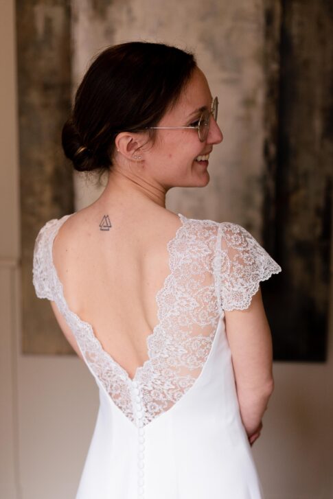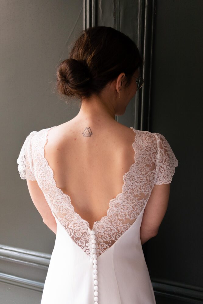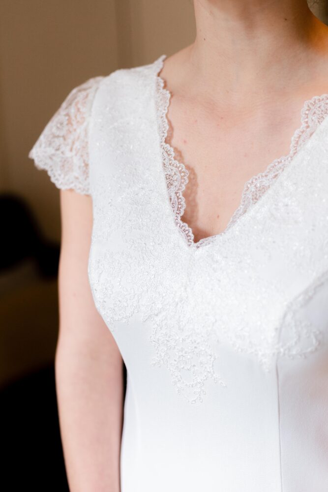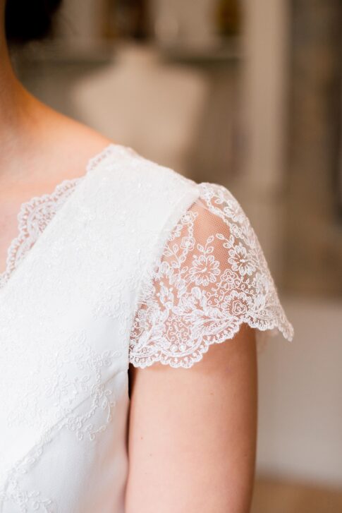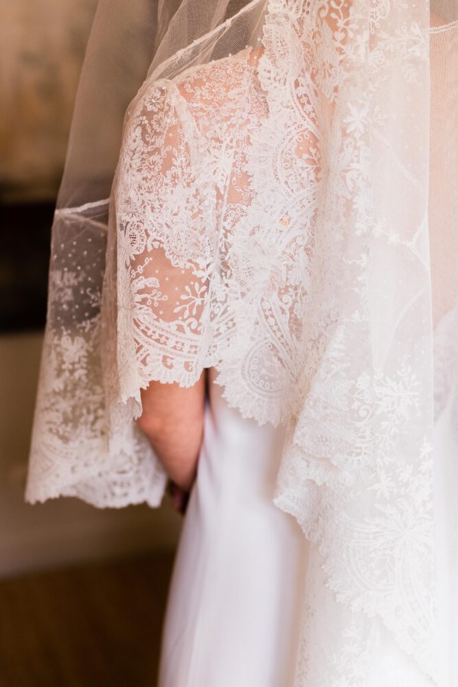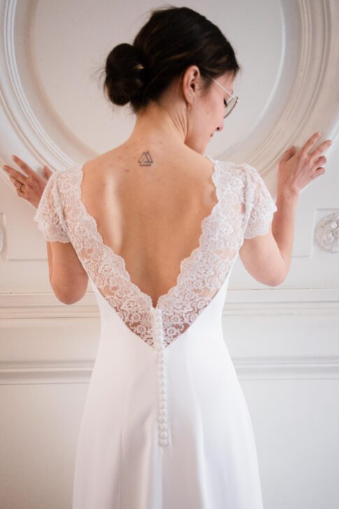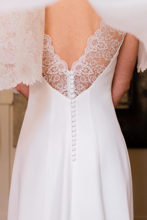 Robe en crêpe lourd, rehaussé d’une dentelle en tulle brodé. Voile de famille.