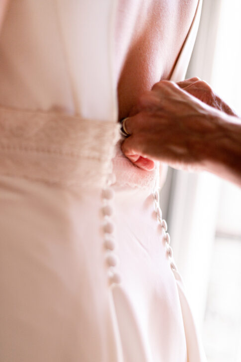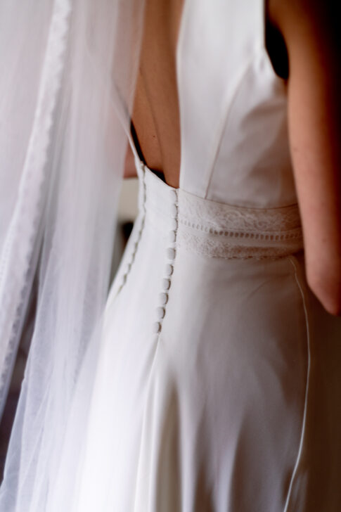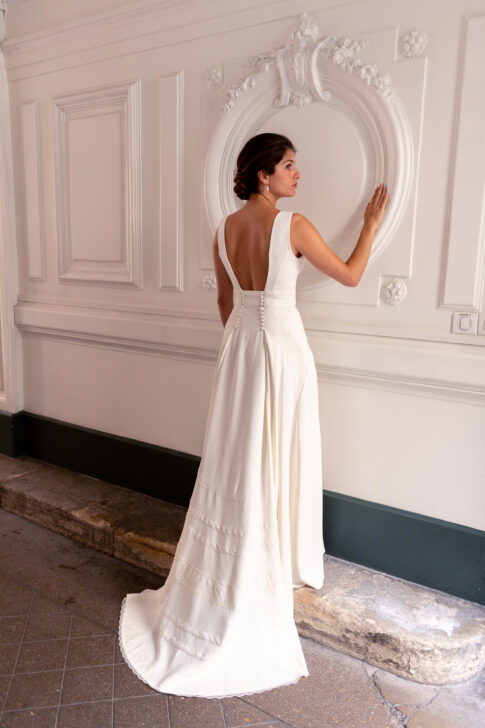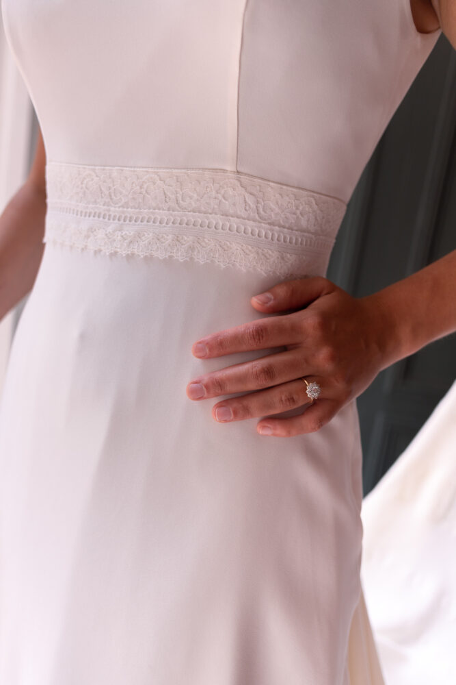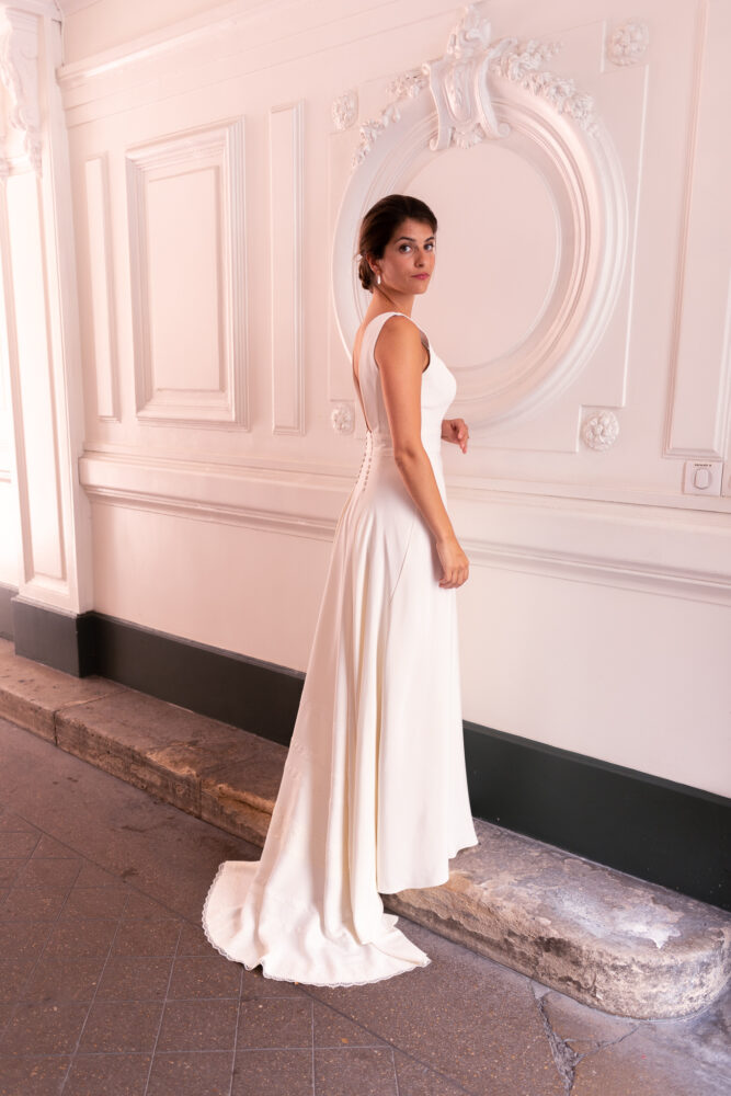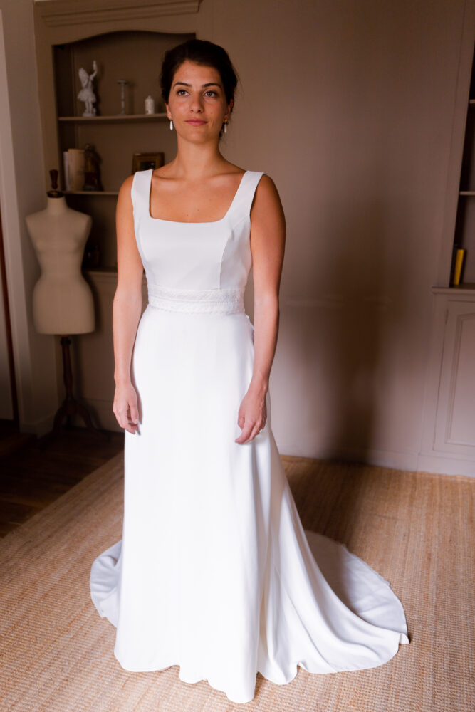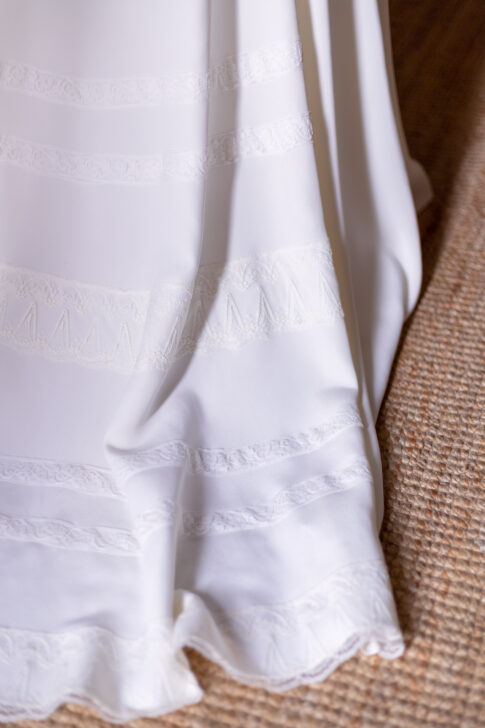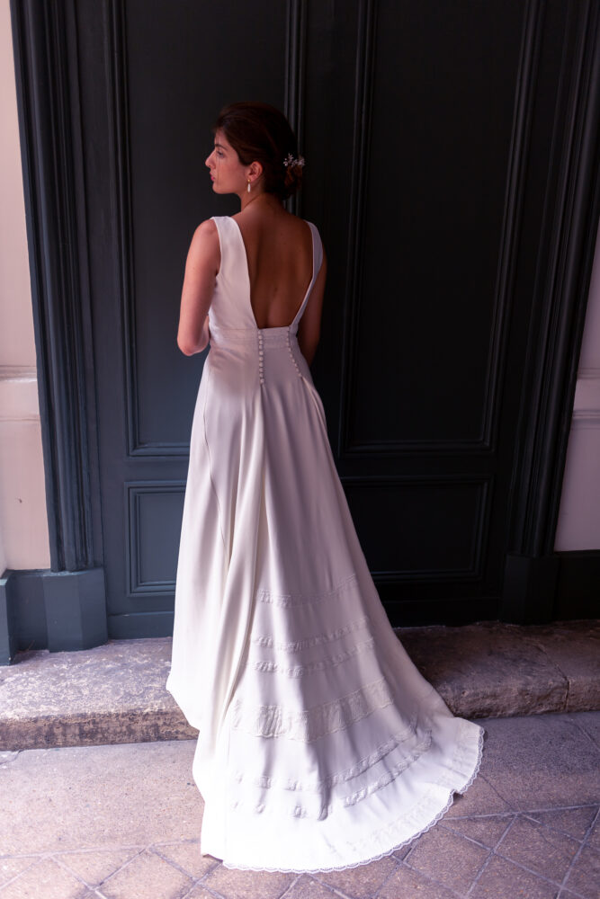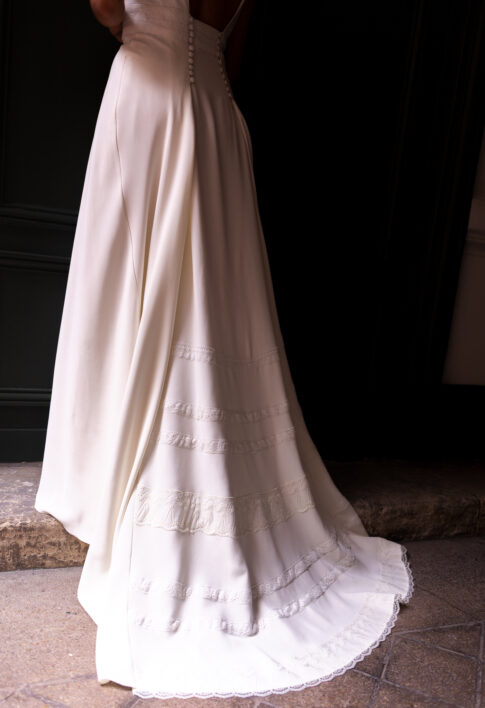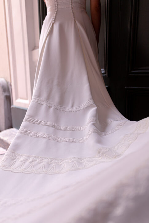 Traine à double boutonnage, composée avec des galons de dentelle de Calais.