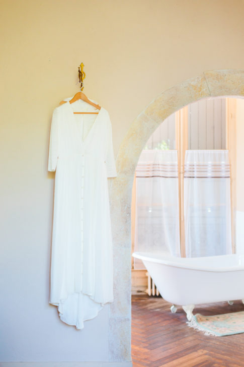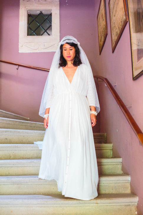 Robe en crêpe de soie, drapée de mousseline de soie. Dentelle de Calais motifs art-déco.