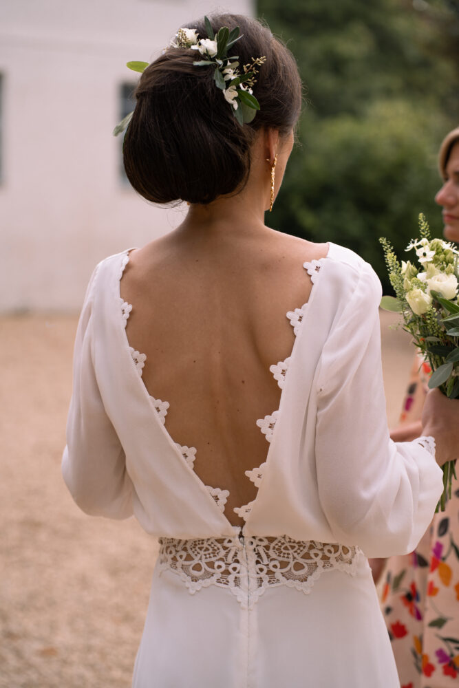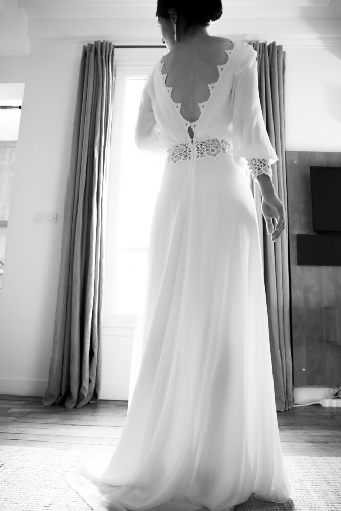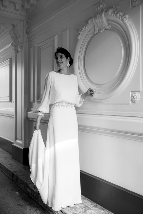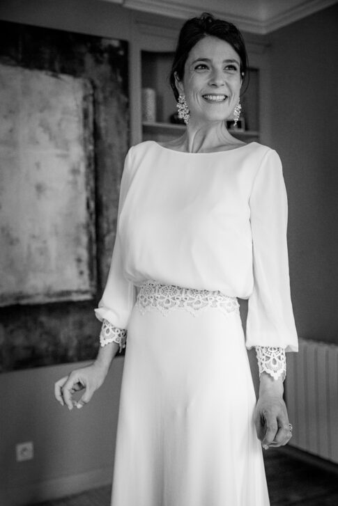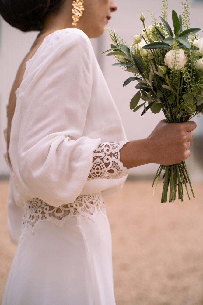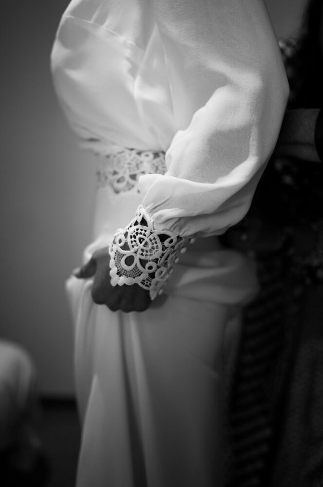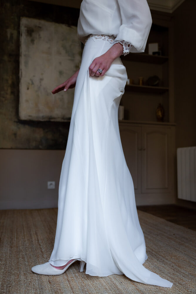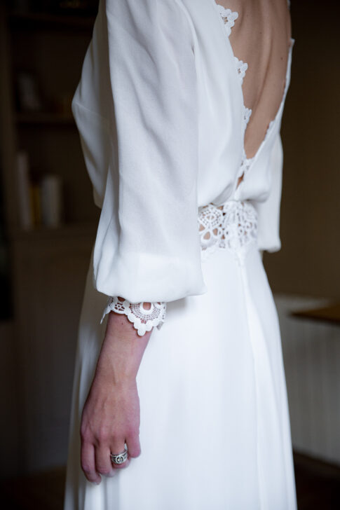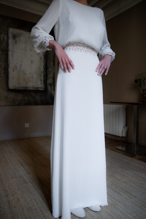 Ceinture et poignets rehaussés d’un galon de guipure.