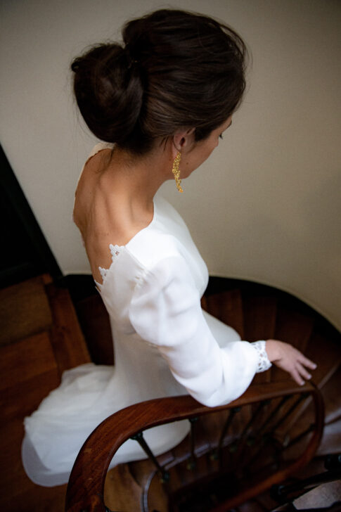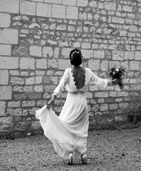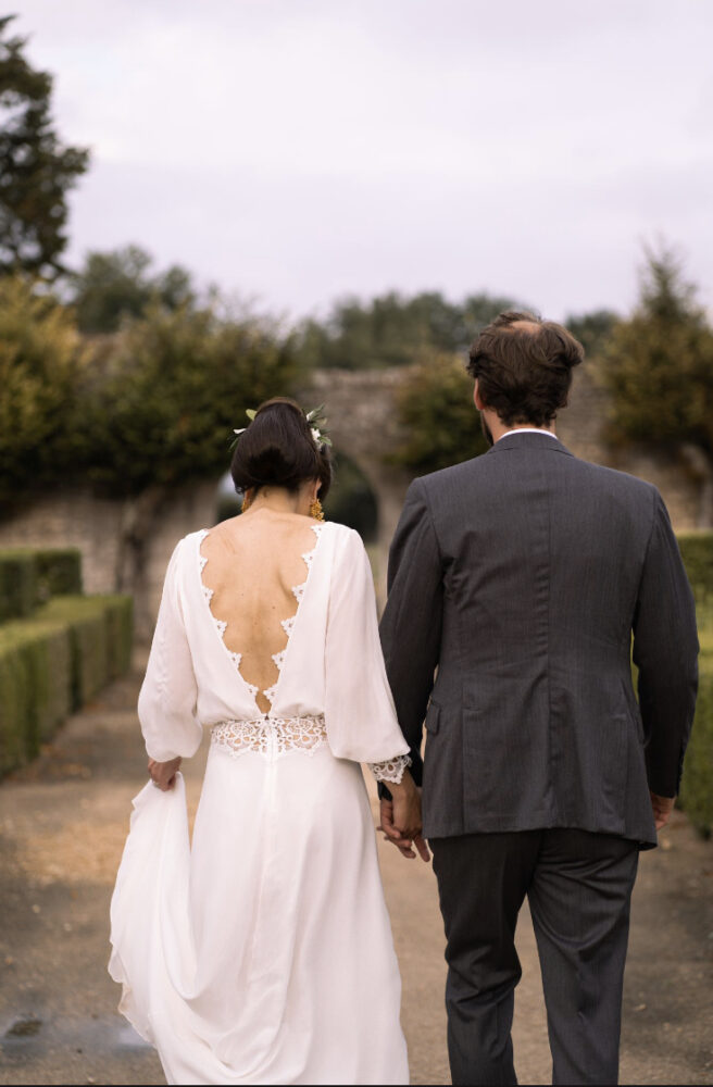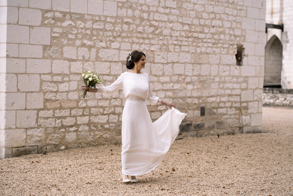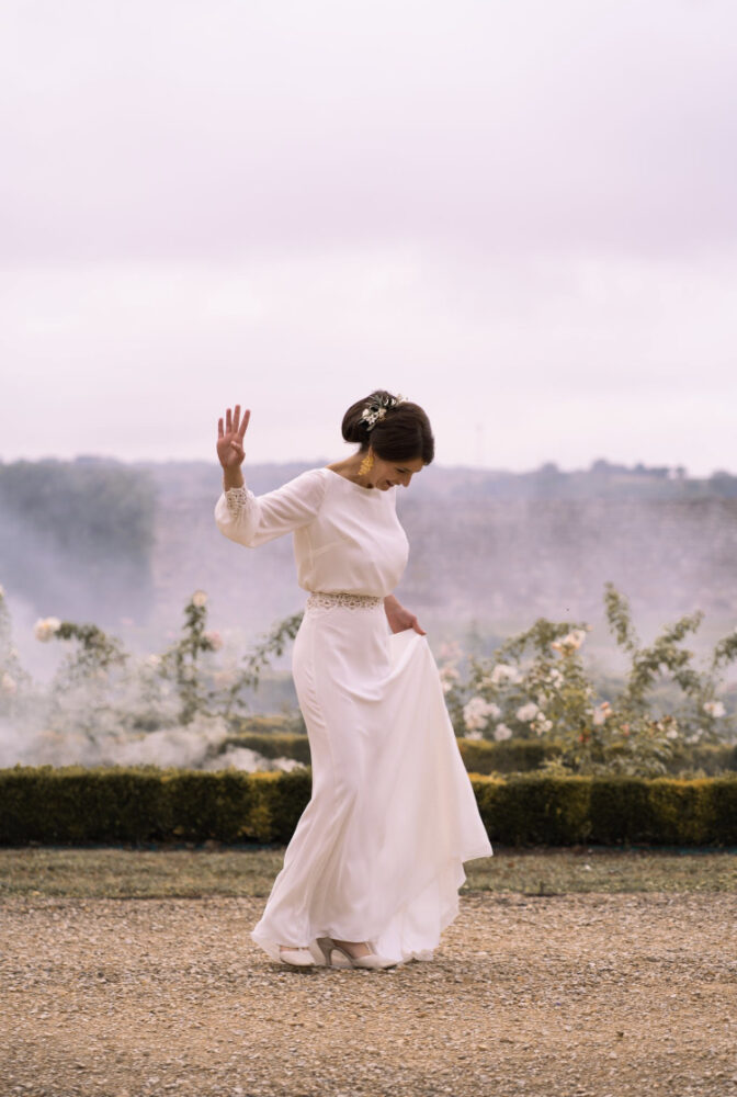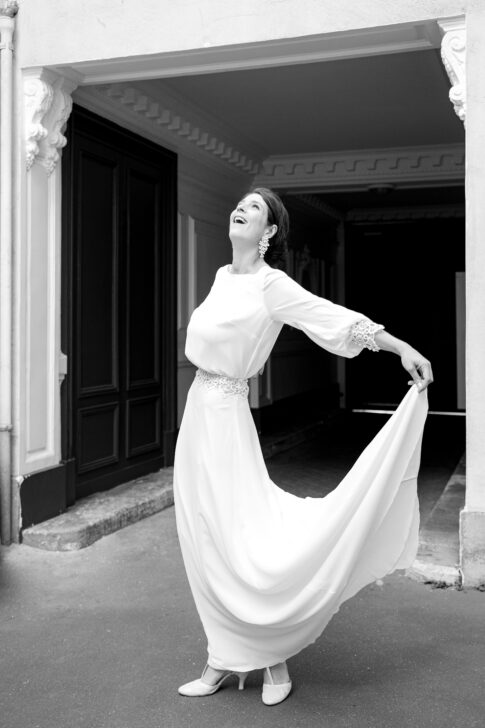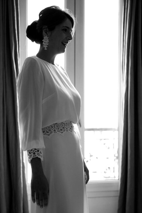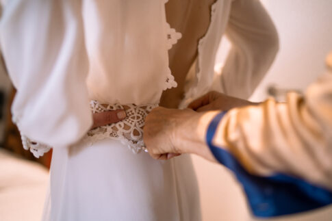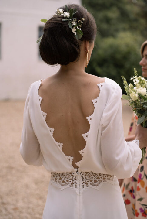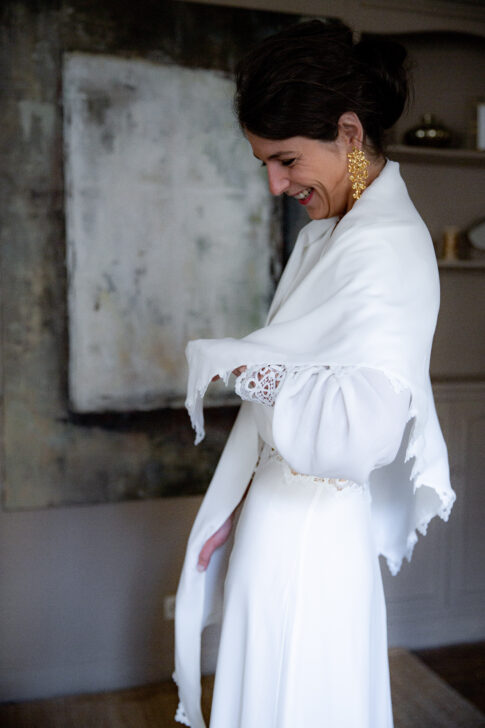 Ceinture et poignets rehaussés d’un galon de guipure.