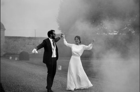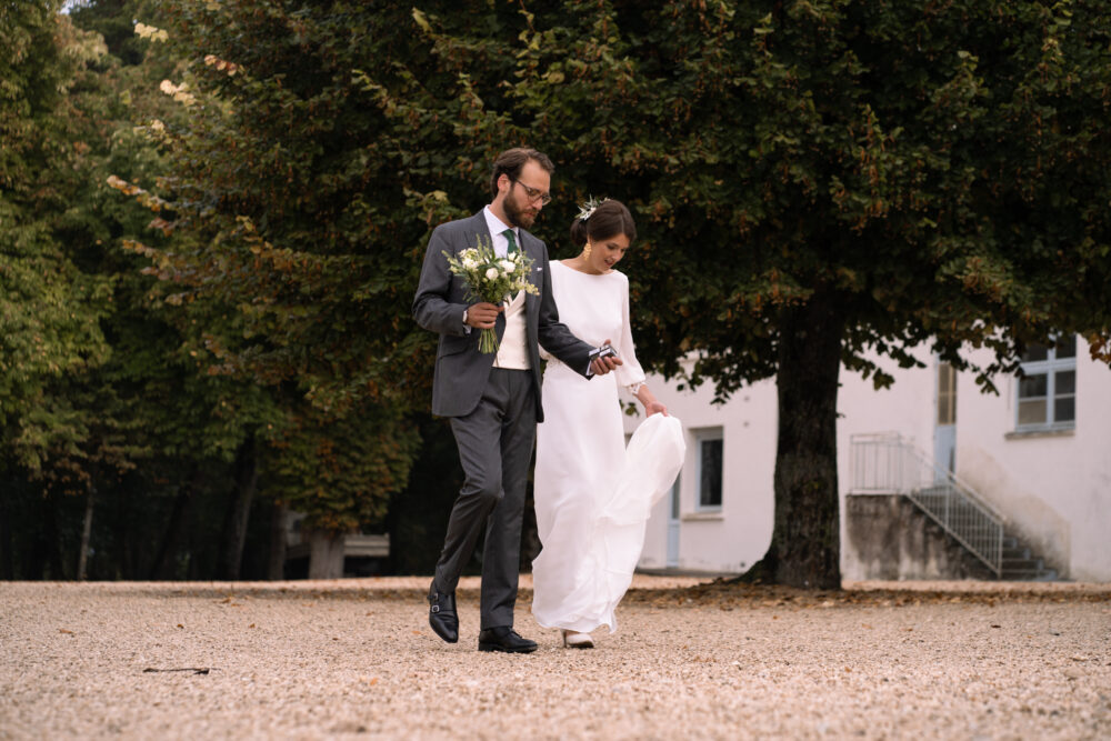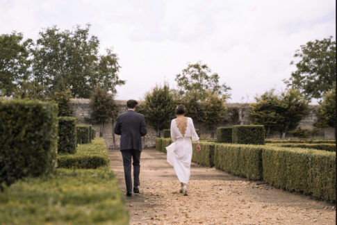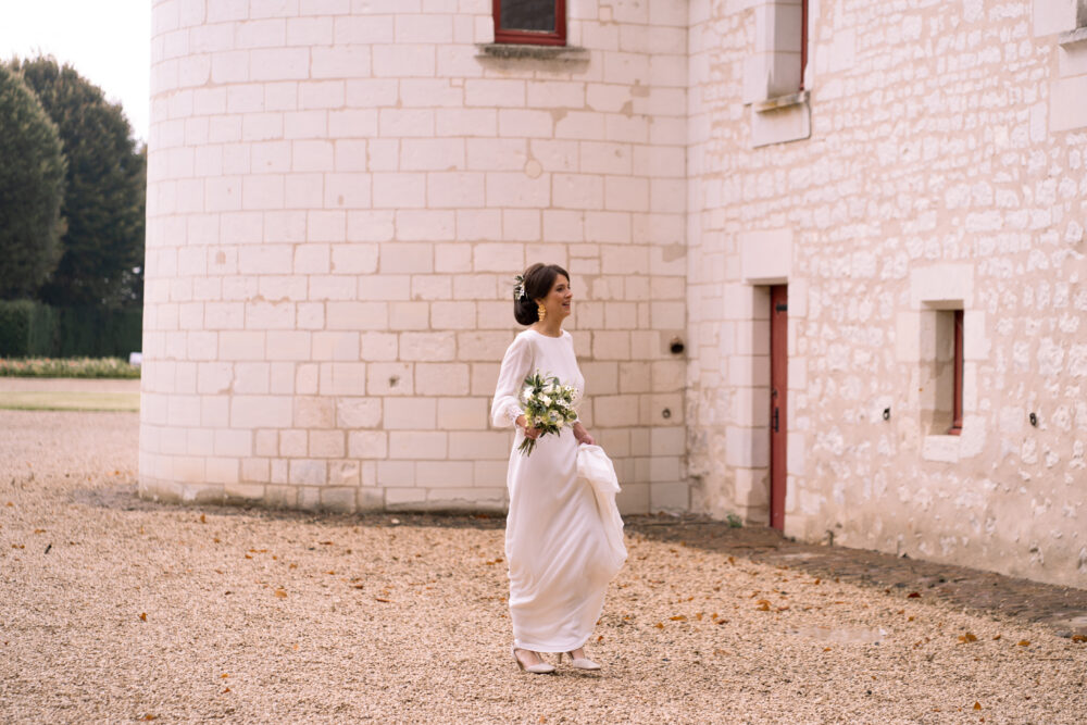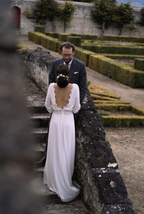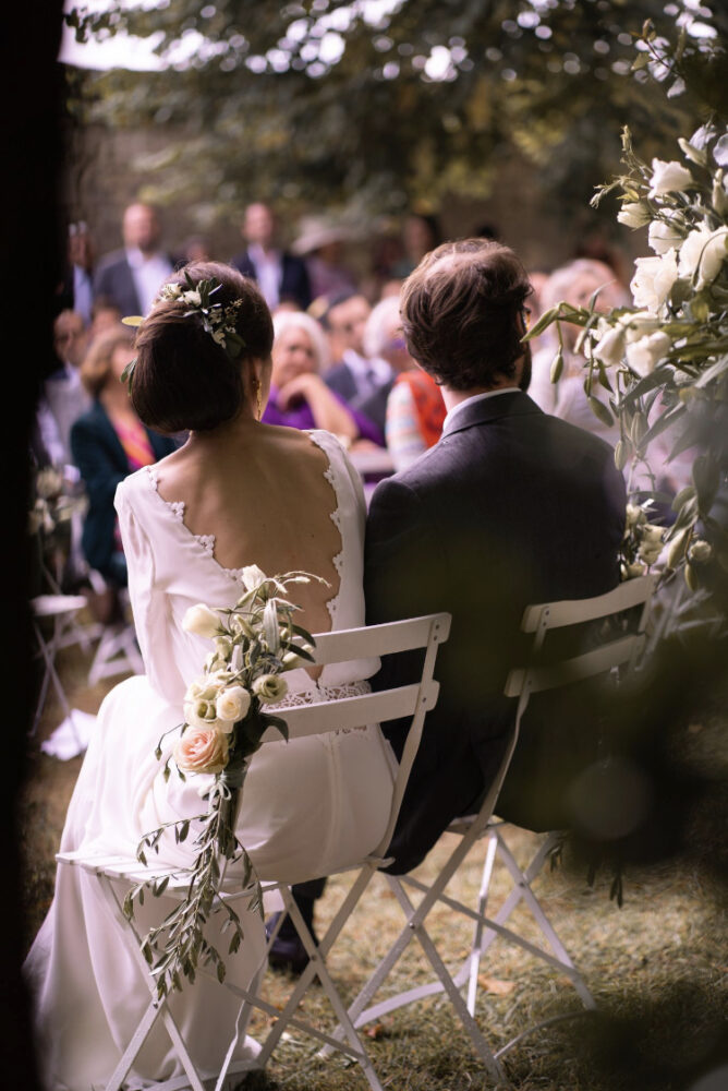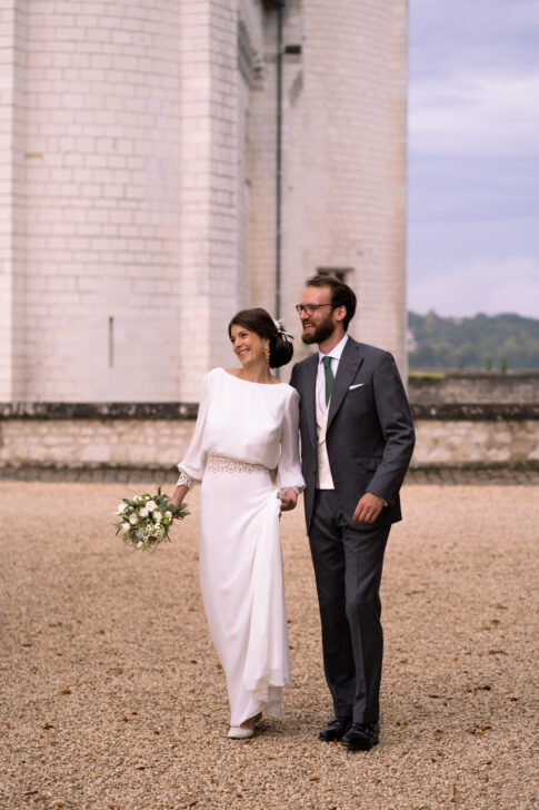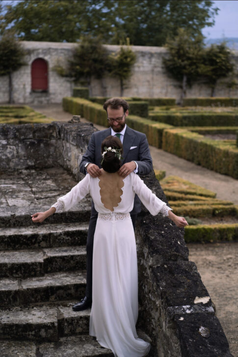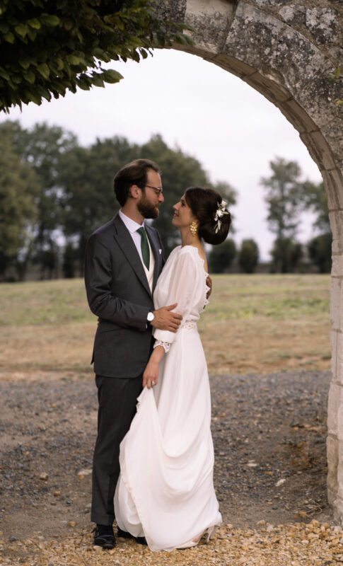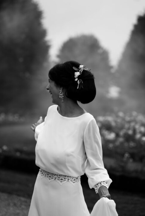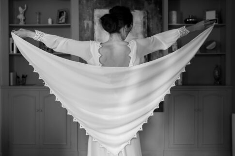 Ceinture et poignets rehaussés d’un galon de guipure.