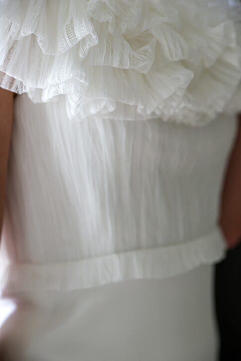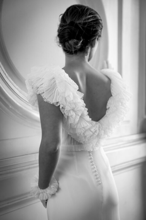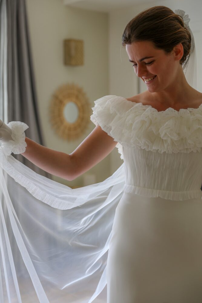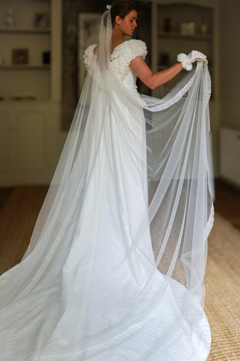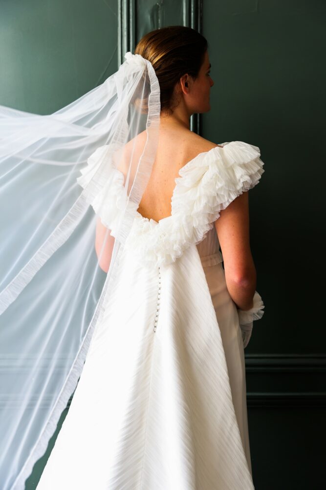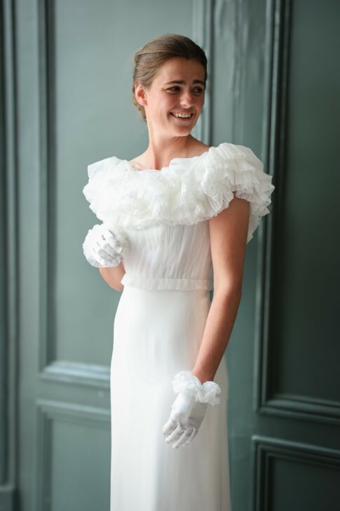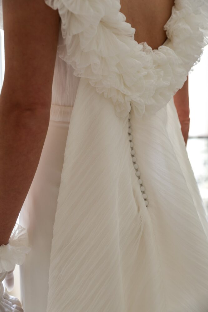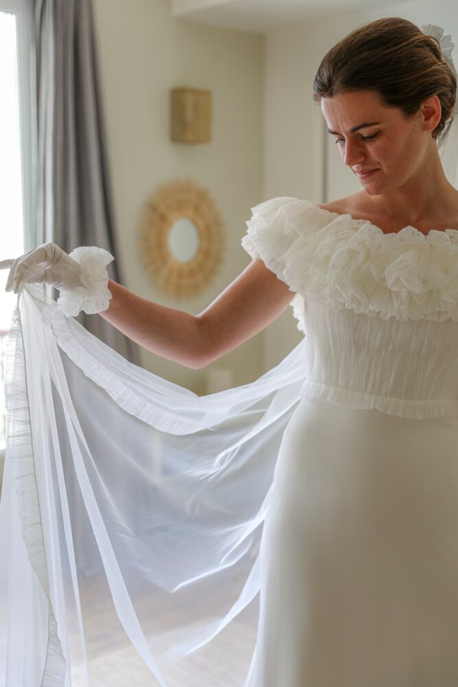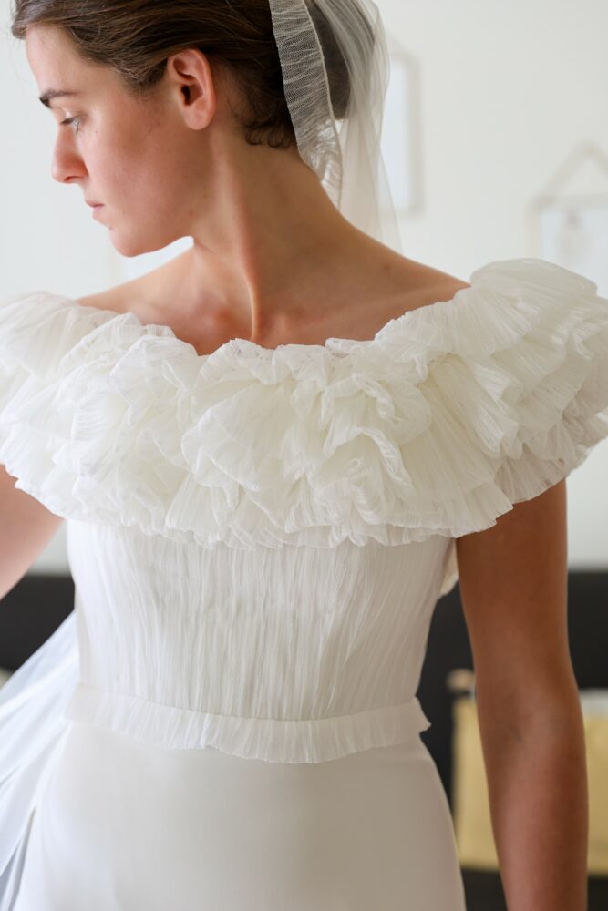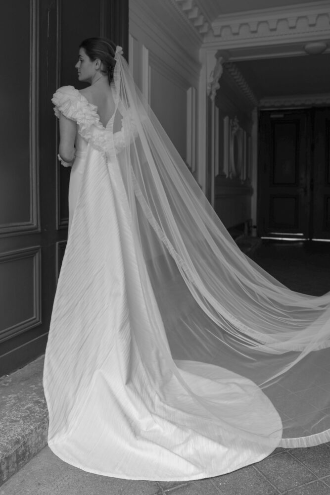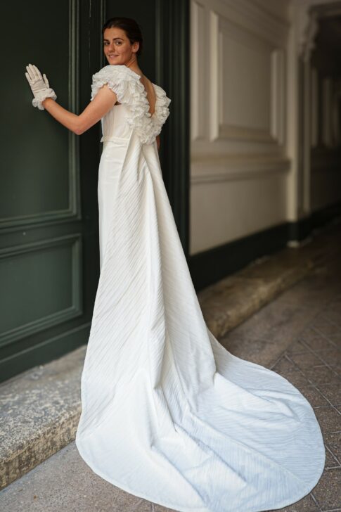 Robe en crêpe de soie, avec un froufrou et un bustier de tulle froissé. La traine, en soie et tulle froissé, est amovible. Le voile a été fait sur mesure avec un rappel de froufrou tout autour, ainsi que les gants.