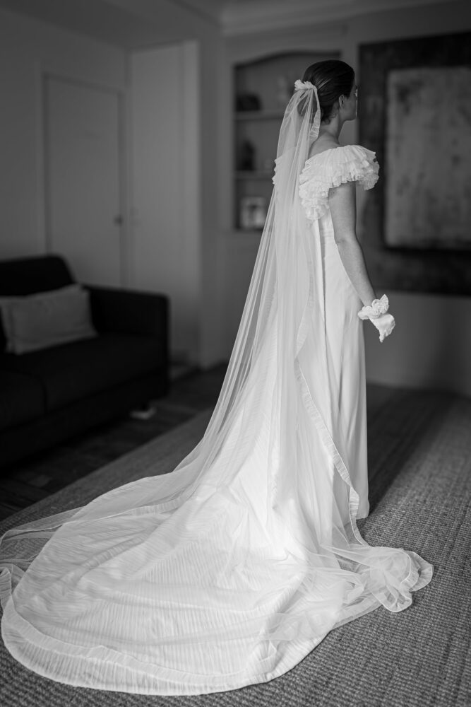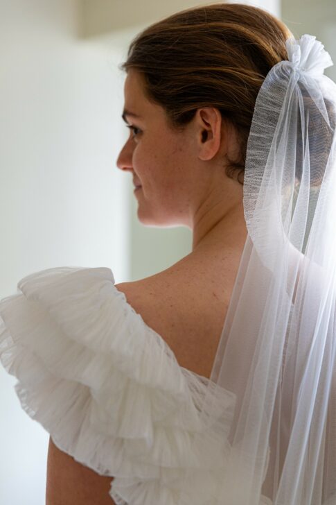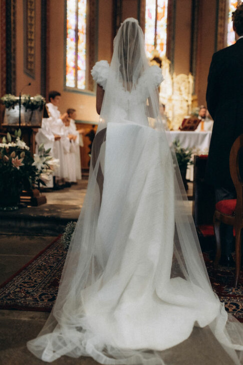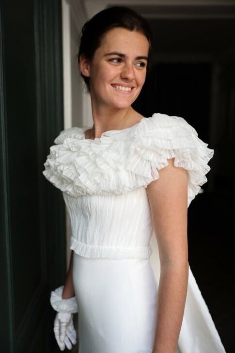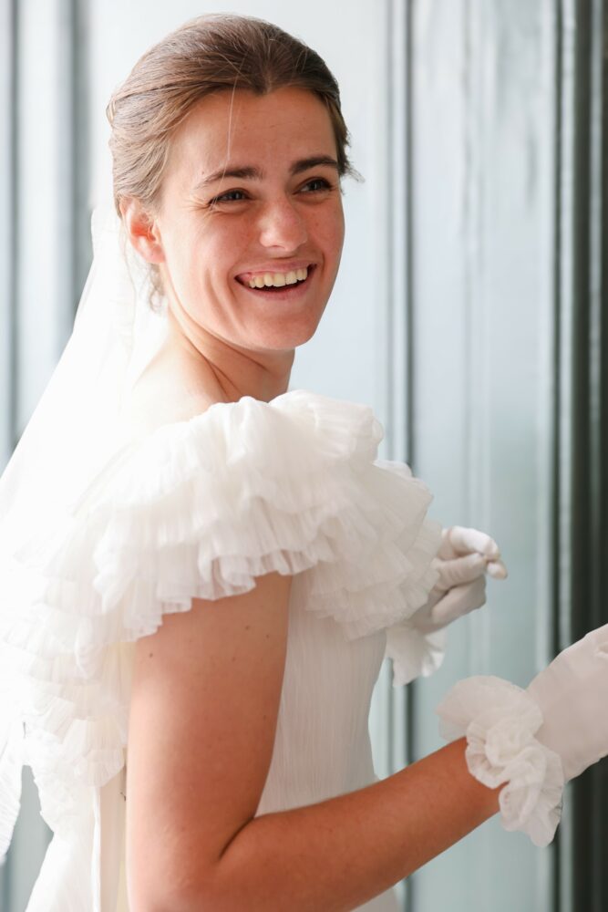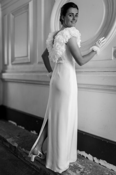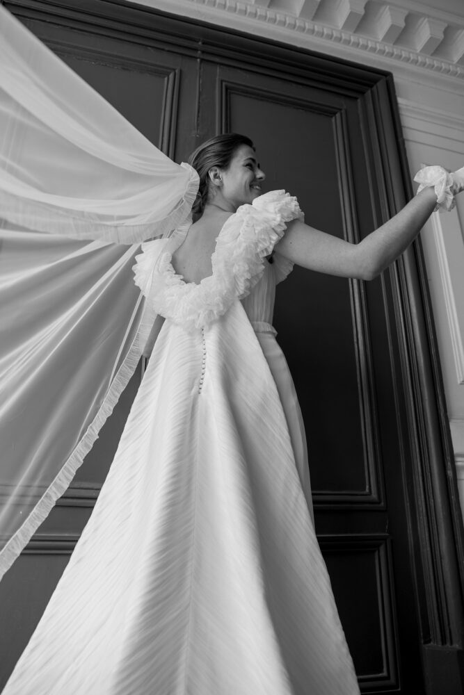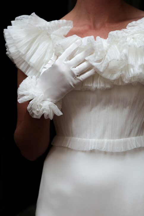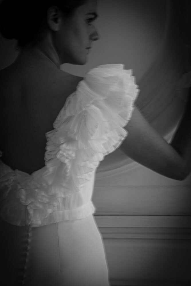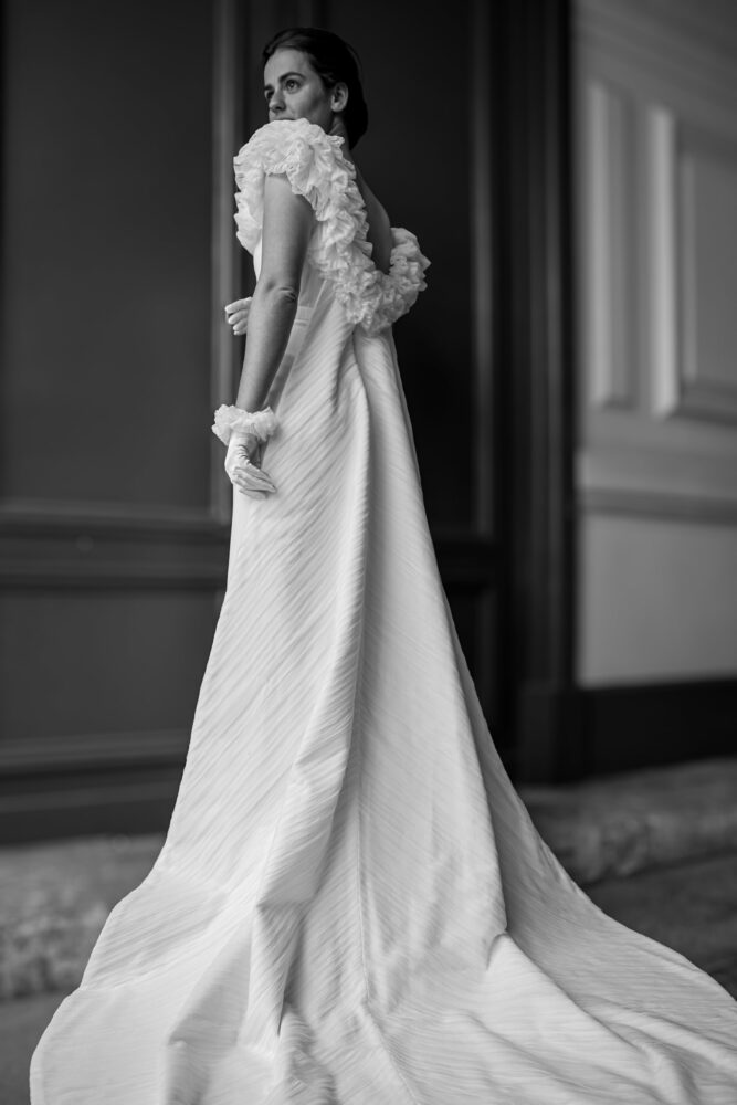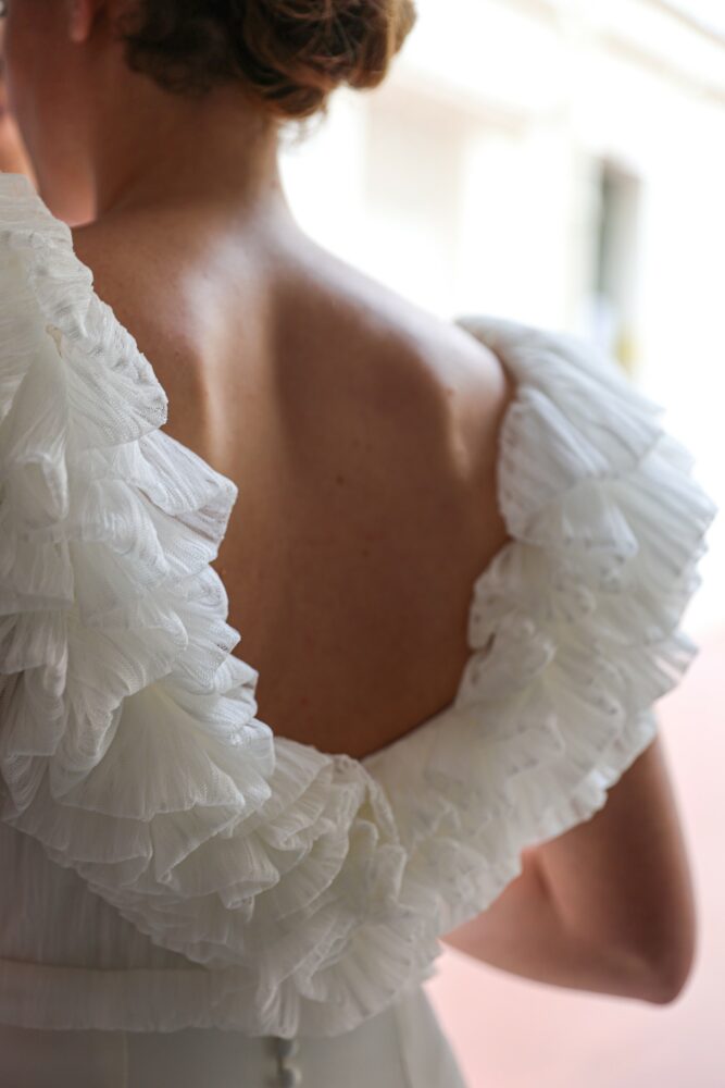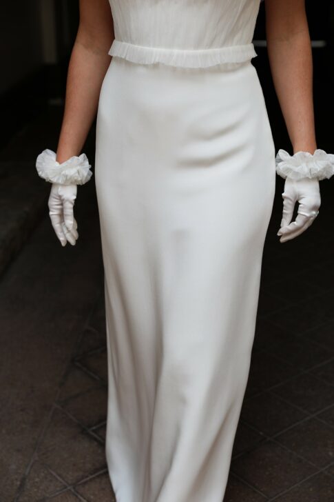 Robe en crêpe de soie, avec un froufrou et un bustier de tulle froissé. La traine, en soie et tulle froissé, est amovible. Le voile a été fait sur mesure avec un rappel de froufrou tout autour, ainsi que les gants.