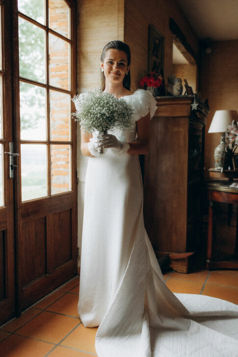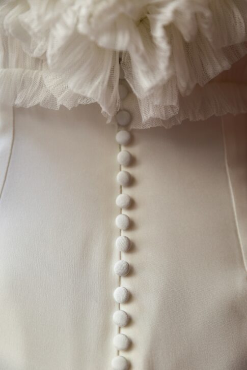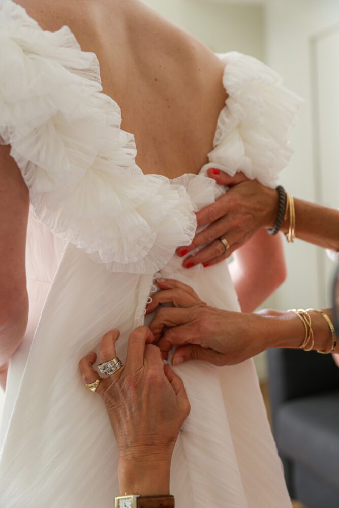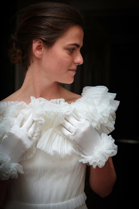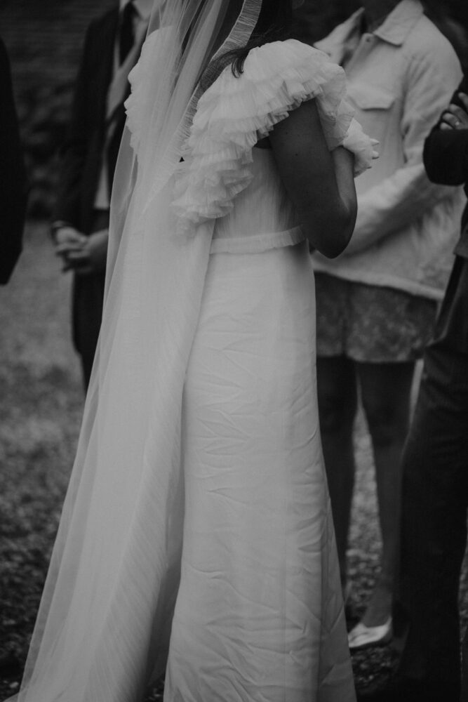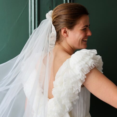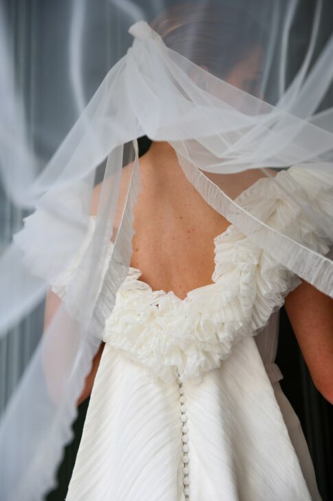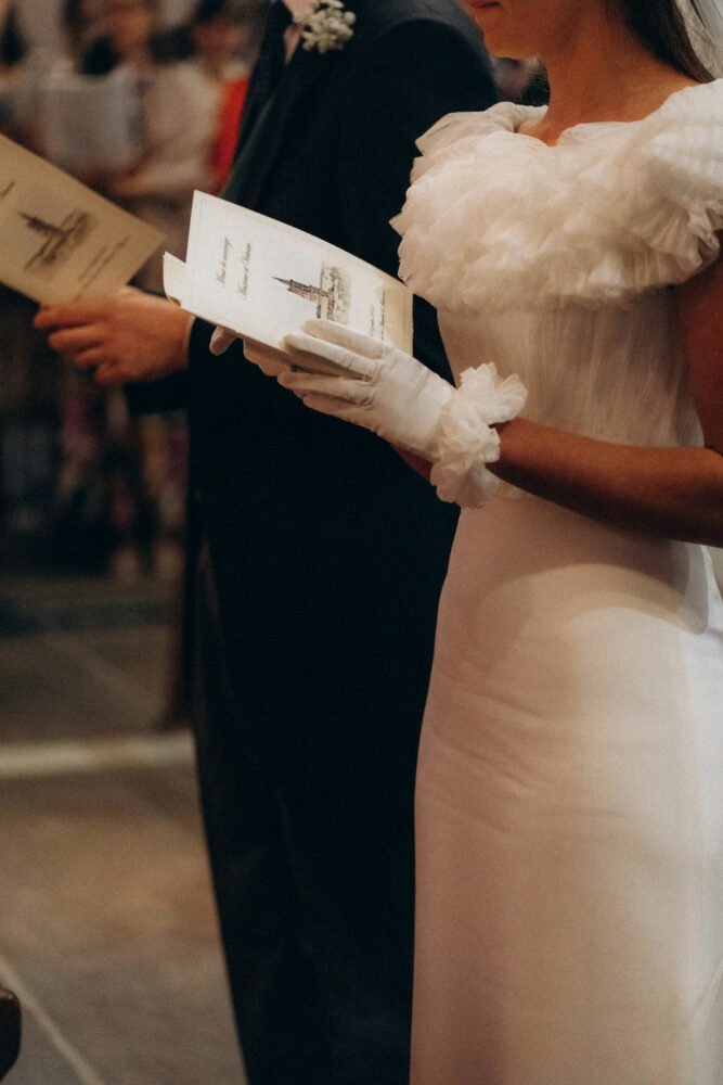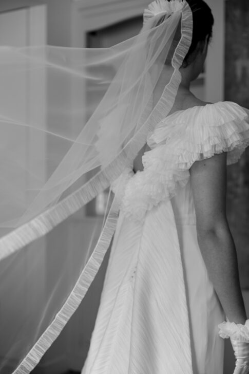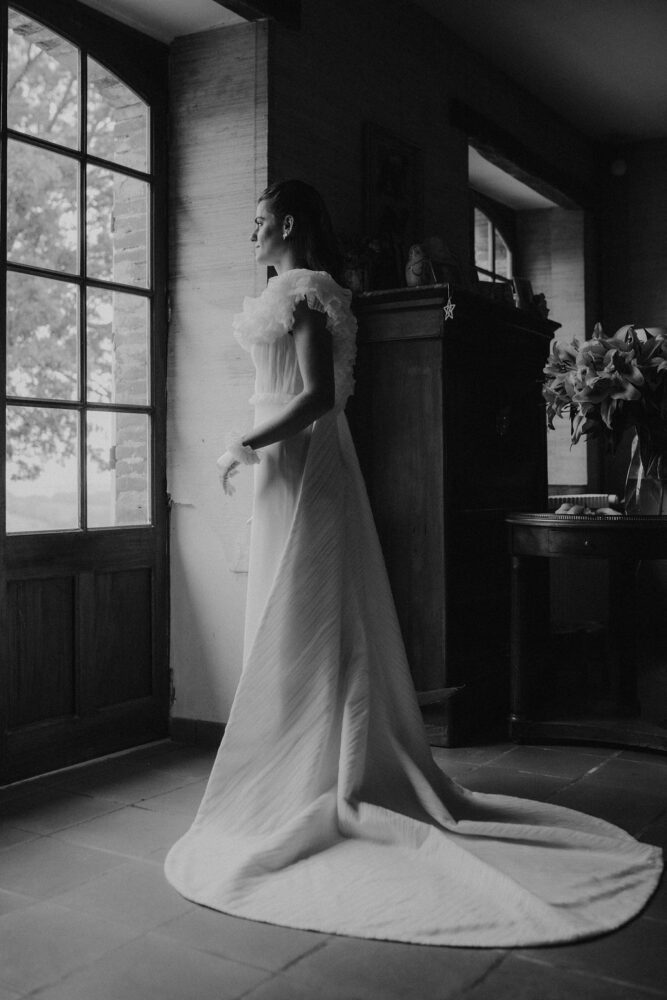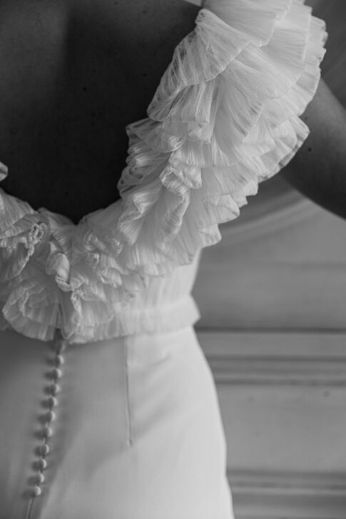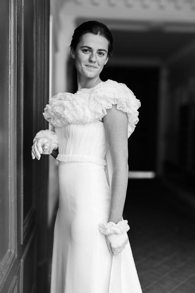 Robe en crêpe de soie, avec un froufrou et un bustier de tulle froissé. La traine, en soie et tulle froissé, est amovible. Le voile a été fait sur mesure avec un rappel de froufrou tout autour, ainsi que les gants.