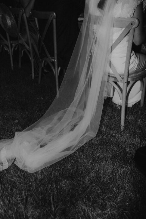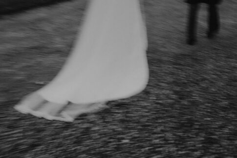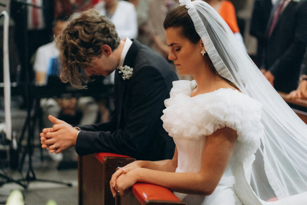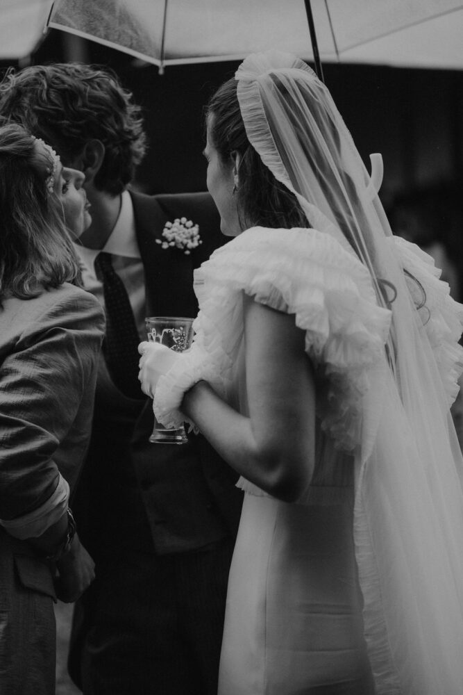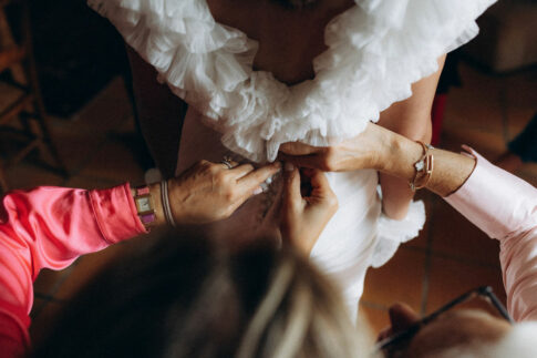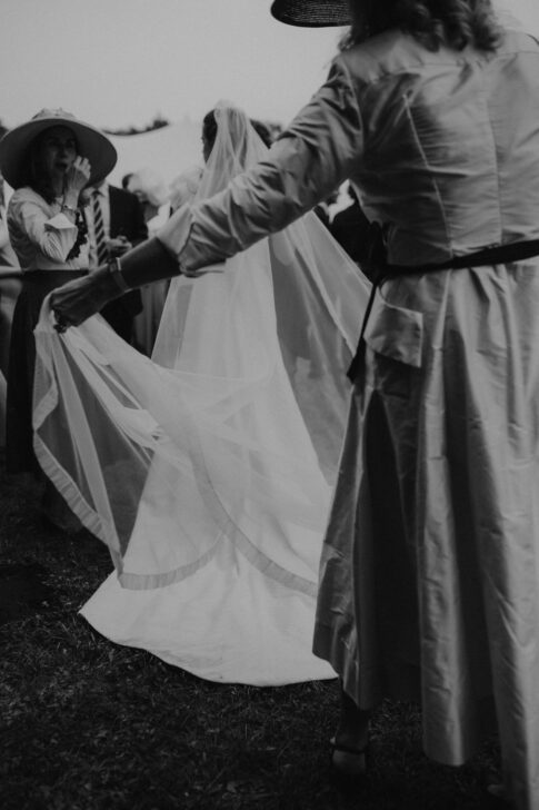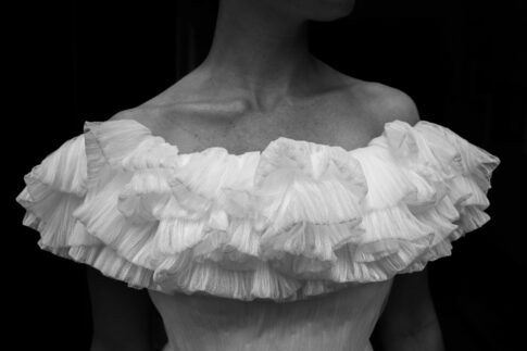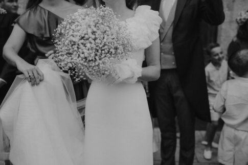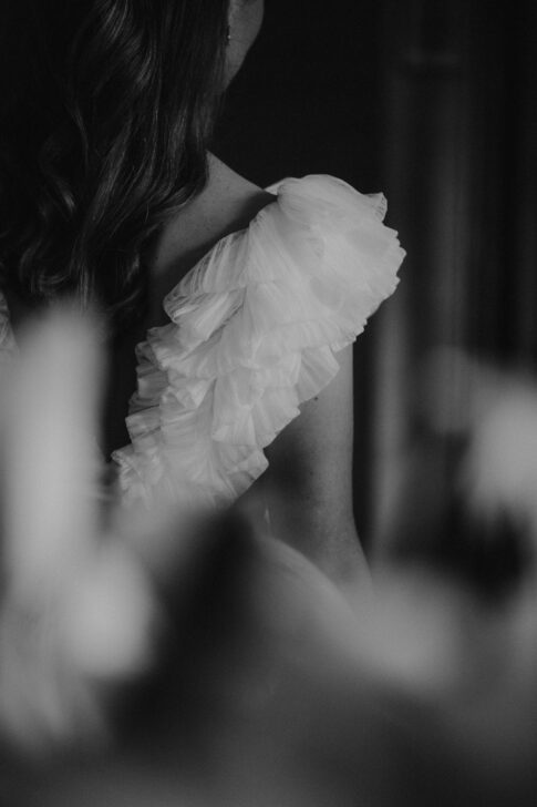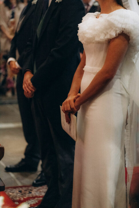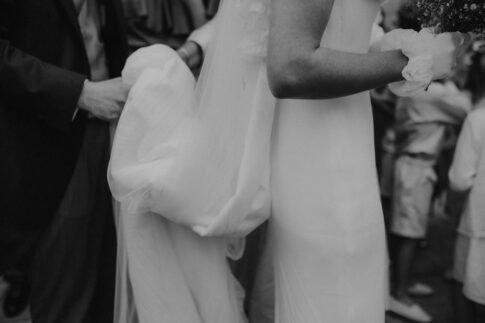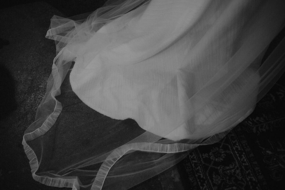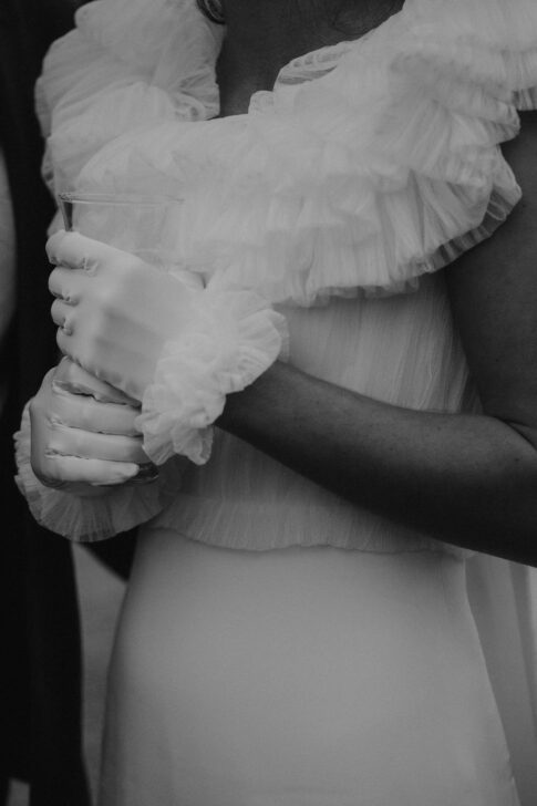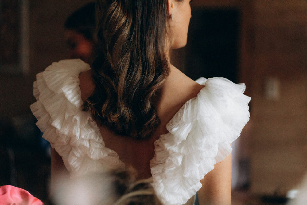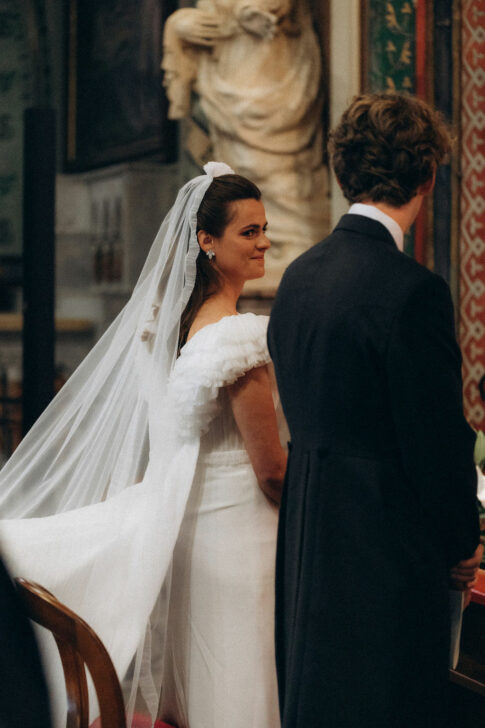Robe en crêpe de soie, avec un froufrou et un bustier de tulle froissé. La traine, en soie et tulle froissé, est amovible. Le voile a été fait sur mesure avec un rappel de froufrou tout autour, ainsi que les gants.