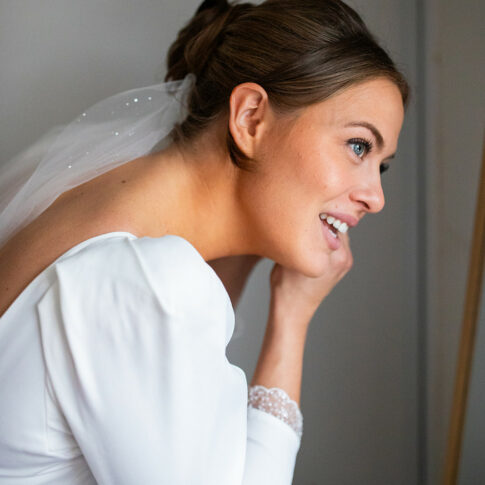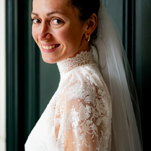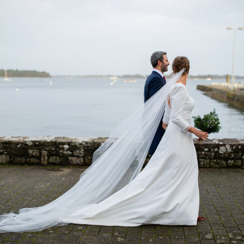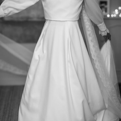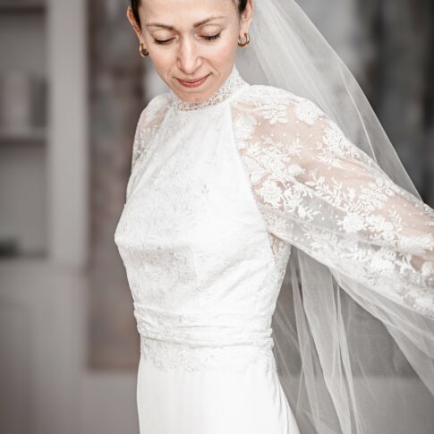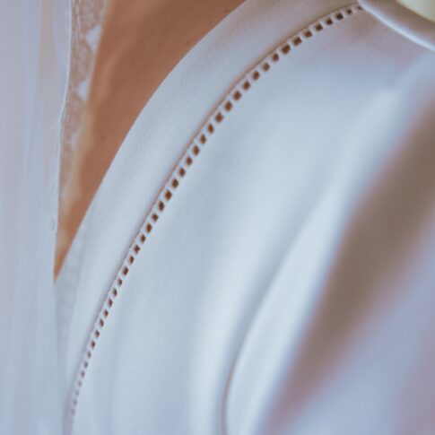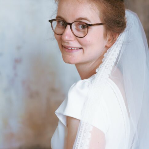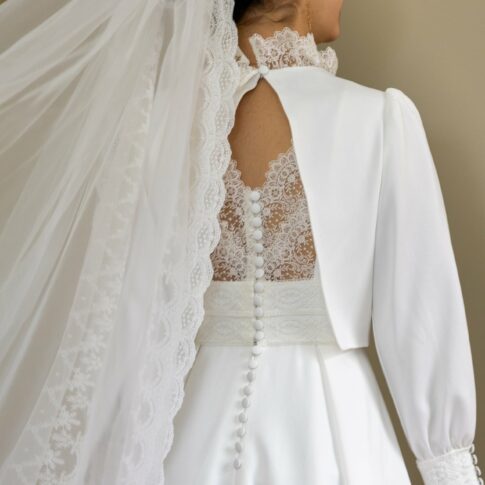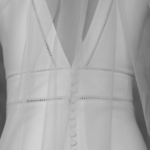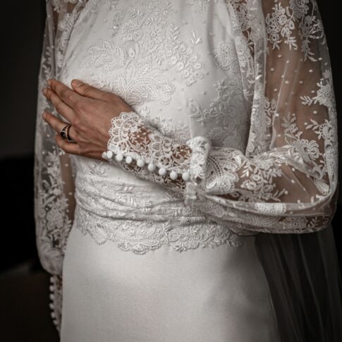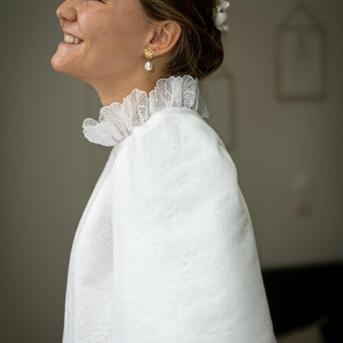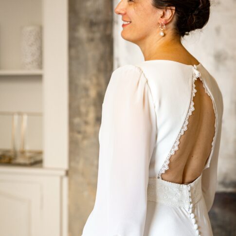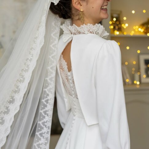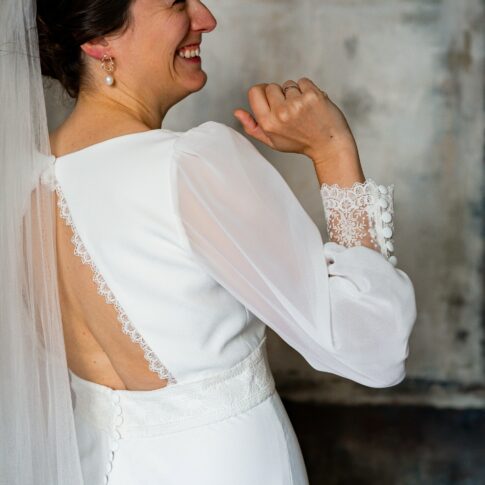 Robe de Mathilde Robe festonnée en crepe lourd infroissable, sans traine. Les manches sont amovibles. Voile long sans rabat bordé de guipure. Photos @emmanuelledemontgrand