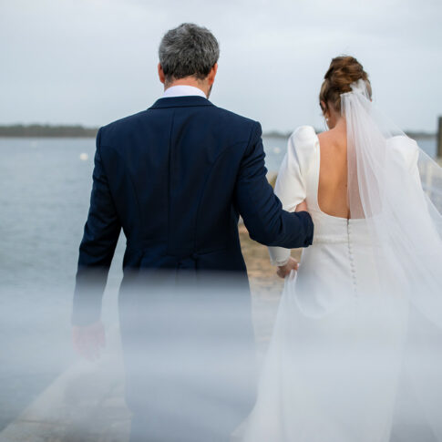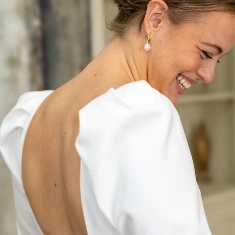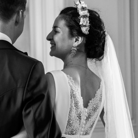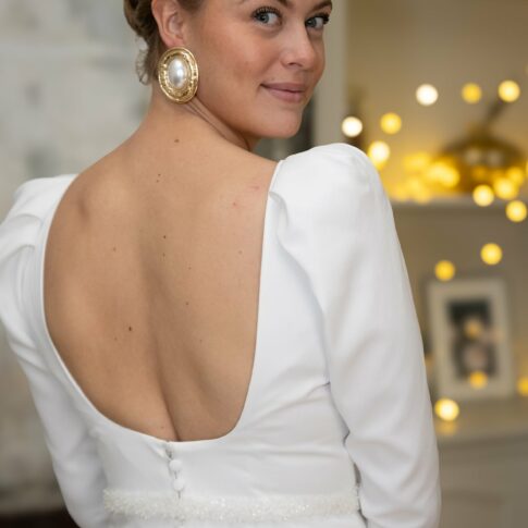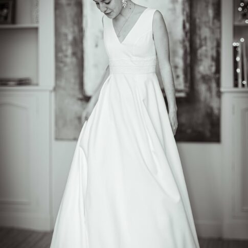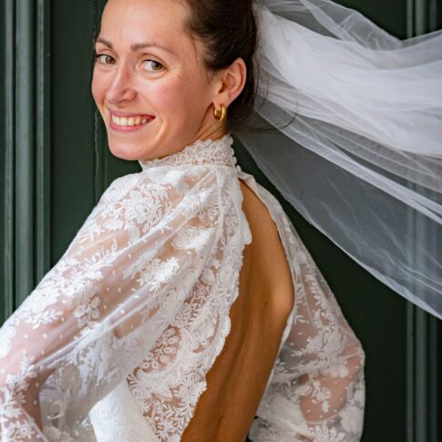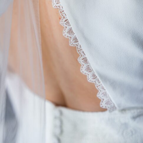 Robe de Claire Robe sans manche en satin de coton. Par dessus, top en dentelle ouvert dans le dos avec traine en dentelle amovible. Voile court réalisé sur mesure. Photos @emmanuelledemontgrand